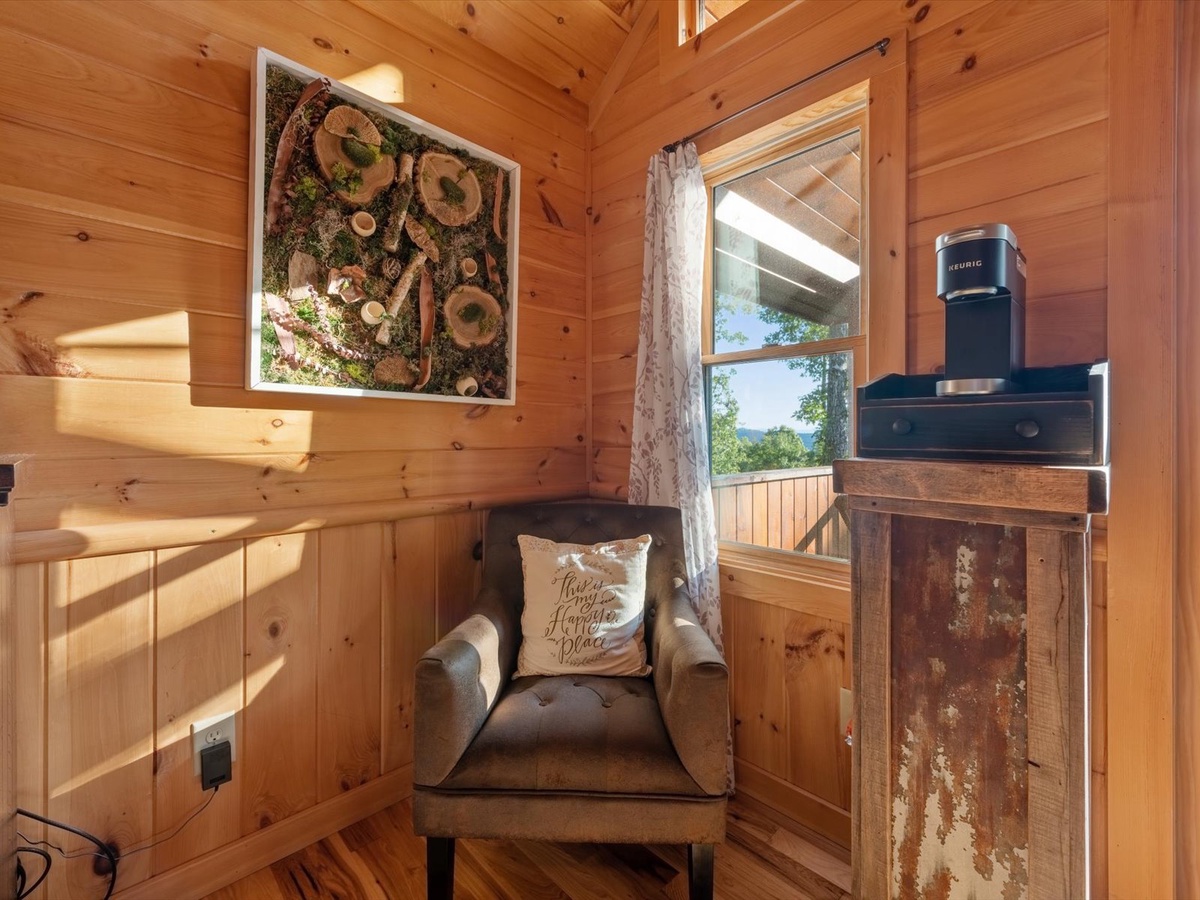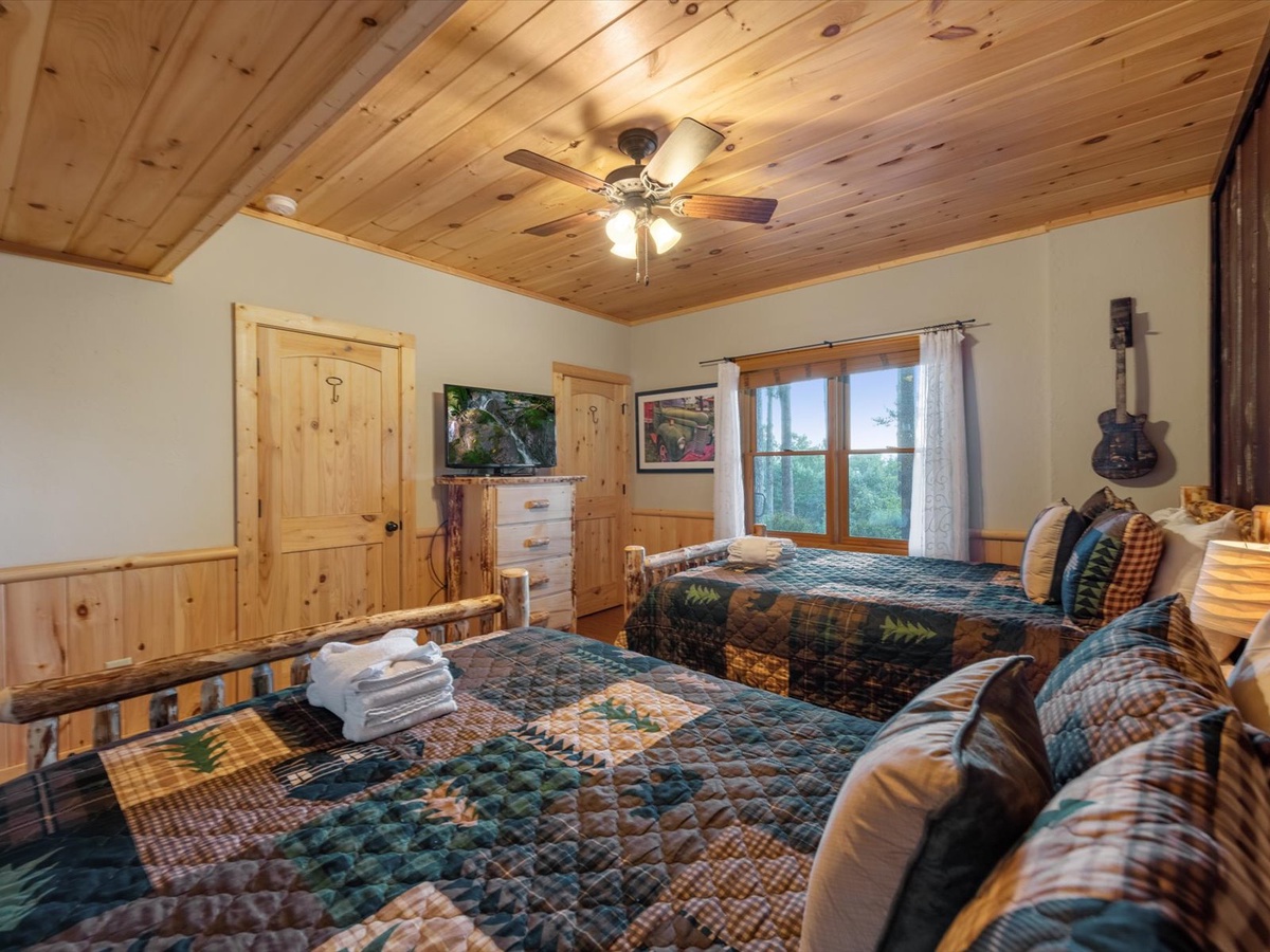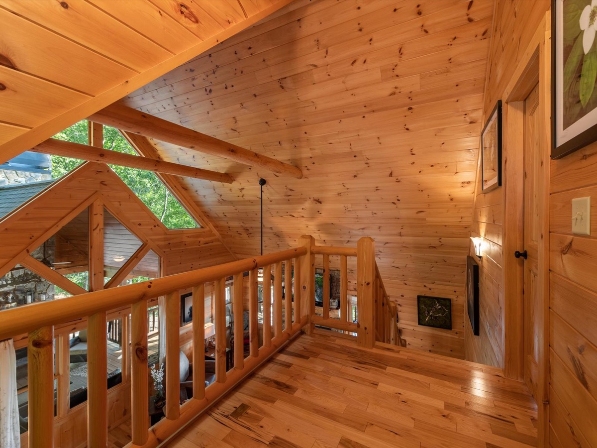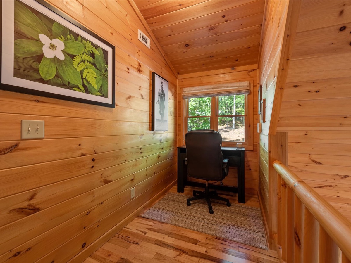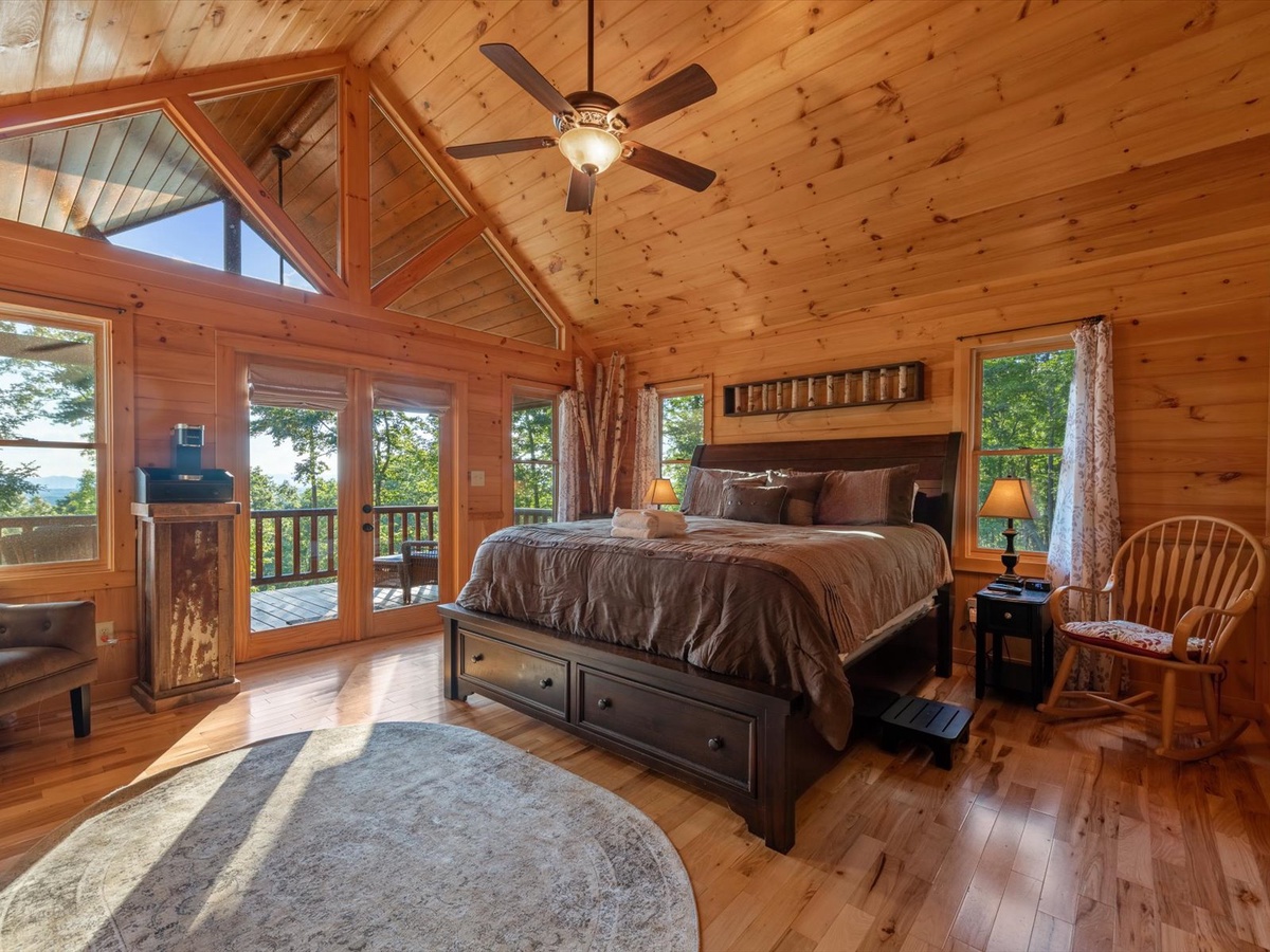 Off the kitchen is where you will find a king bedroom with deck access. Also, off the kitchen is where you will find a shared full bathroom with washer and dryer. Upstairs is a loft work space, a king bedroom with 44” TV, private full bath and a private balcony. Be prepared to let the cares of the world slip from your shoulders as you sip your morning coffee from the privacy and comfort of this private balcony.