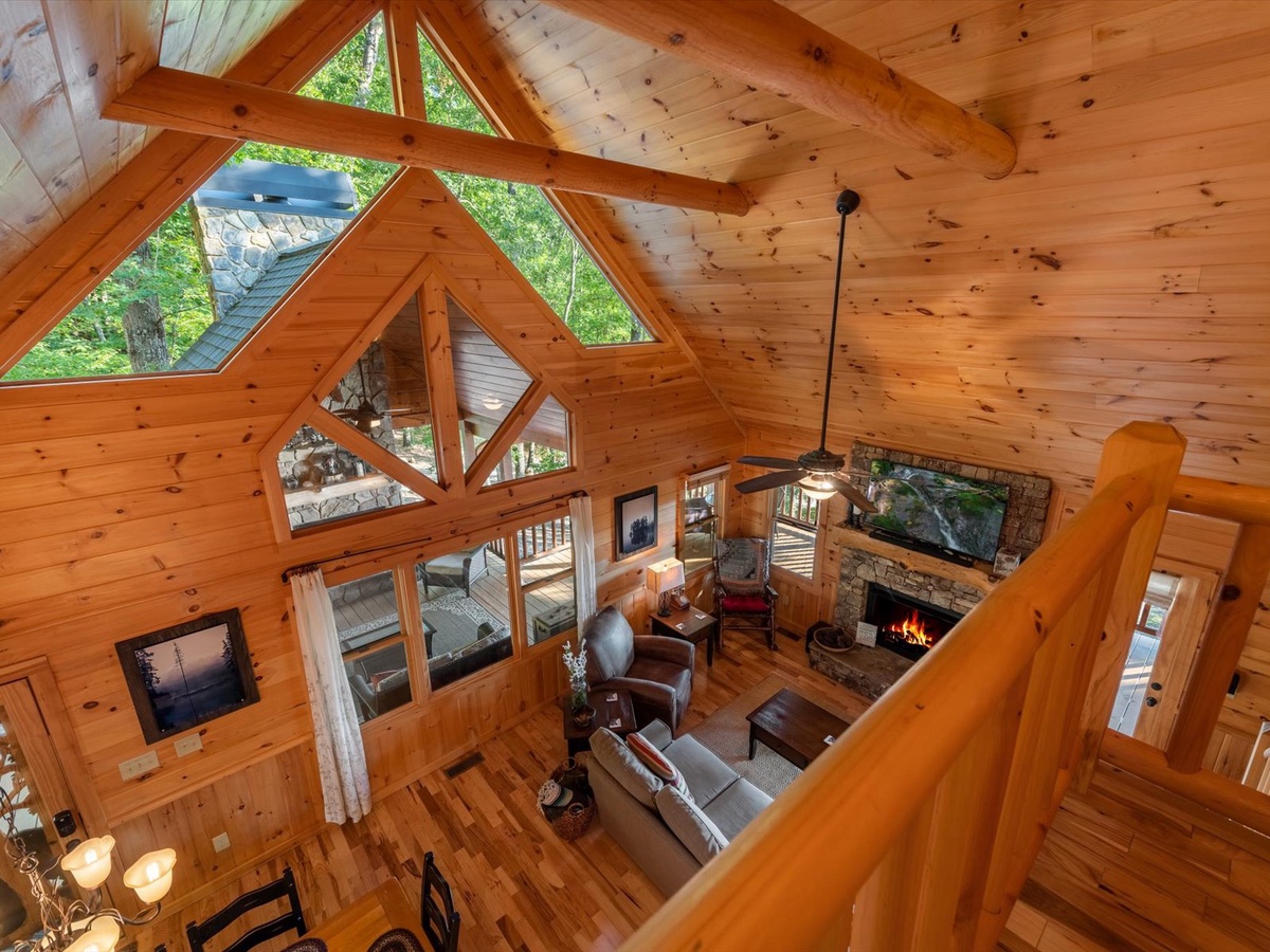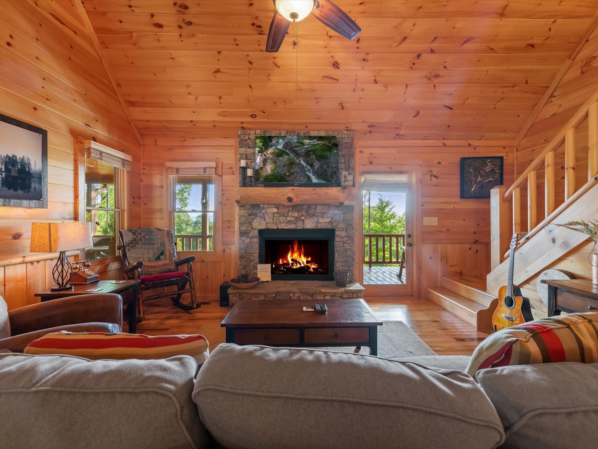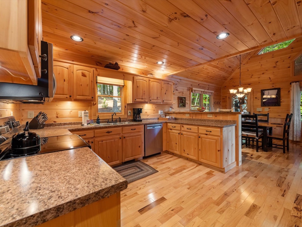 An outdoor gas fireplace greets you while entering the main level deck on your way to the front door. Walking through the bear carved door you are greeted with an open floor plan. The dining area that seats 6 is first so you can sit your crew down right away for that after travel hungries. The kitchen, with its all-new stainless-steel appliances will make it easy to feed your family. From there you can cross over to the living room with a gas fireplace and relaxing atmosphere.
