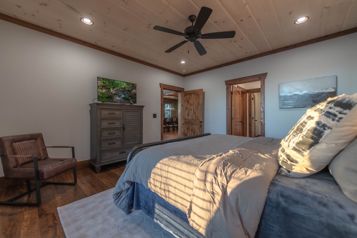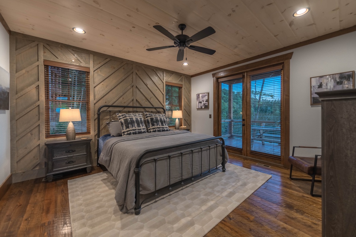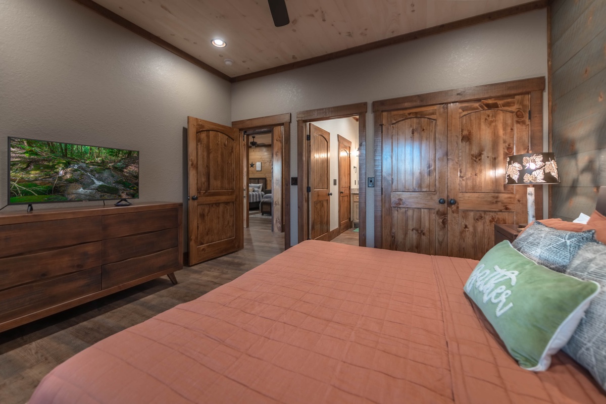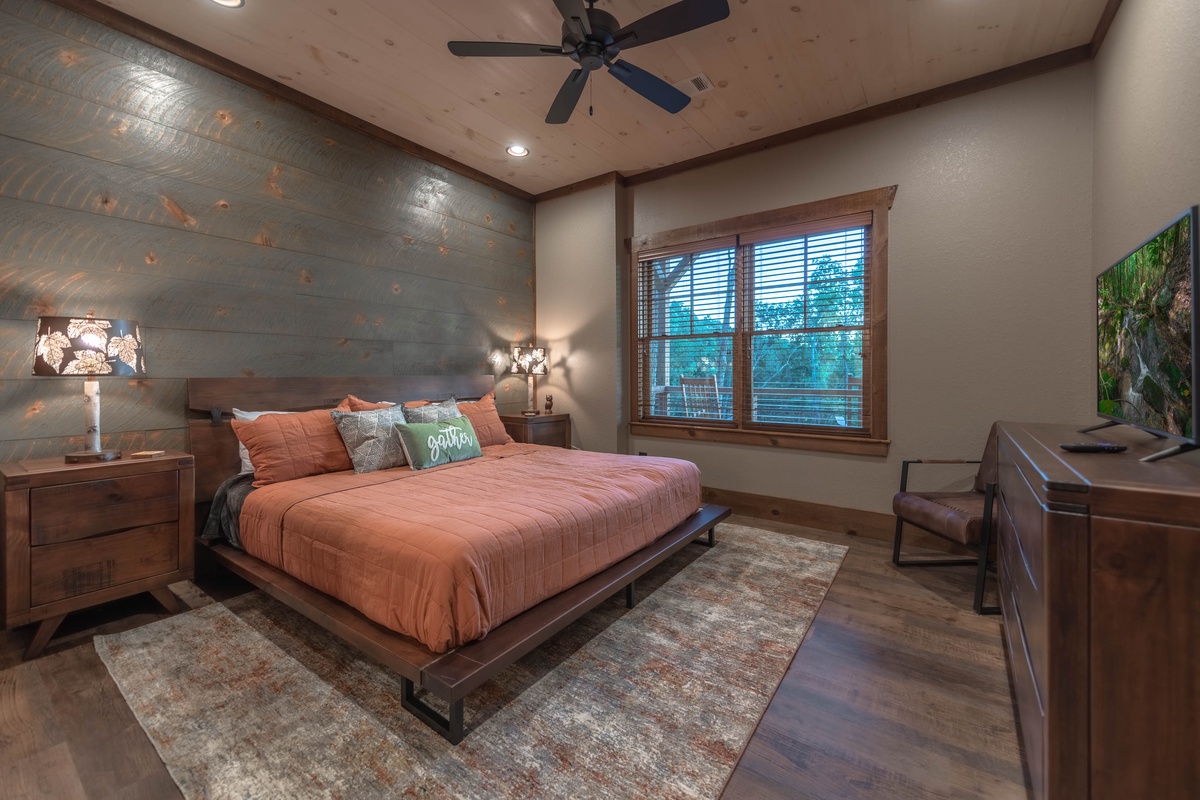 - Master King Bedroom with 42" TV, Deck Access, and Full Bathroom with Double Vanities, Stand Up Rainfall ShowerÂ