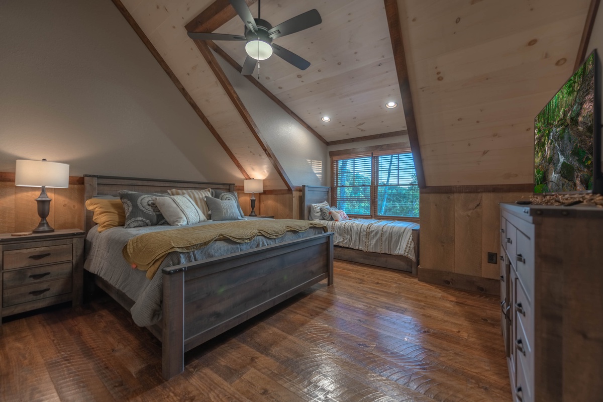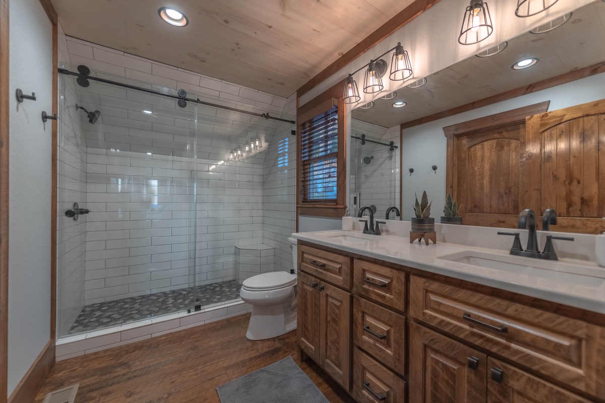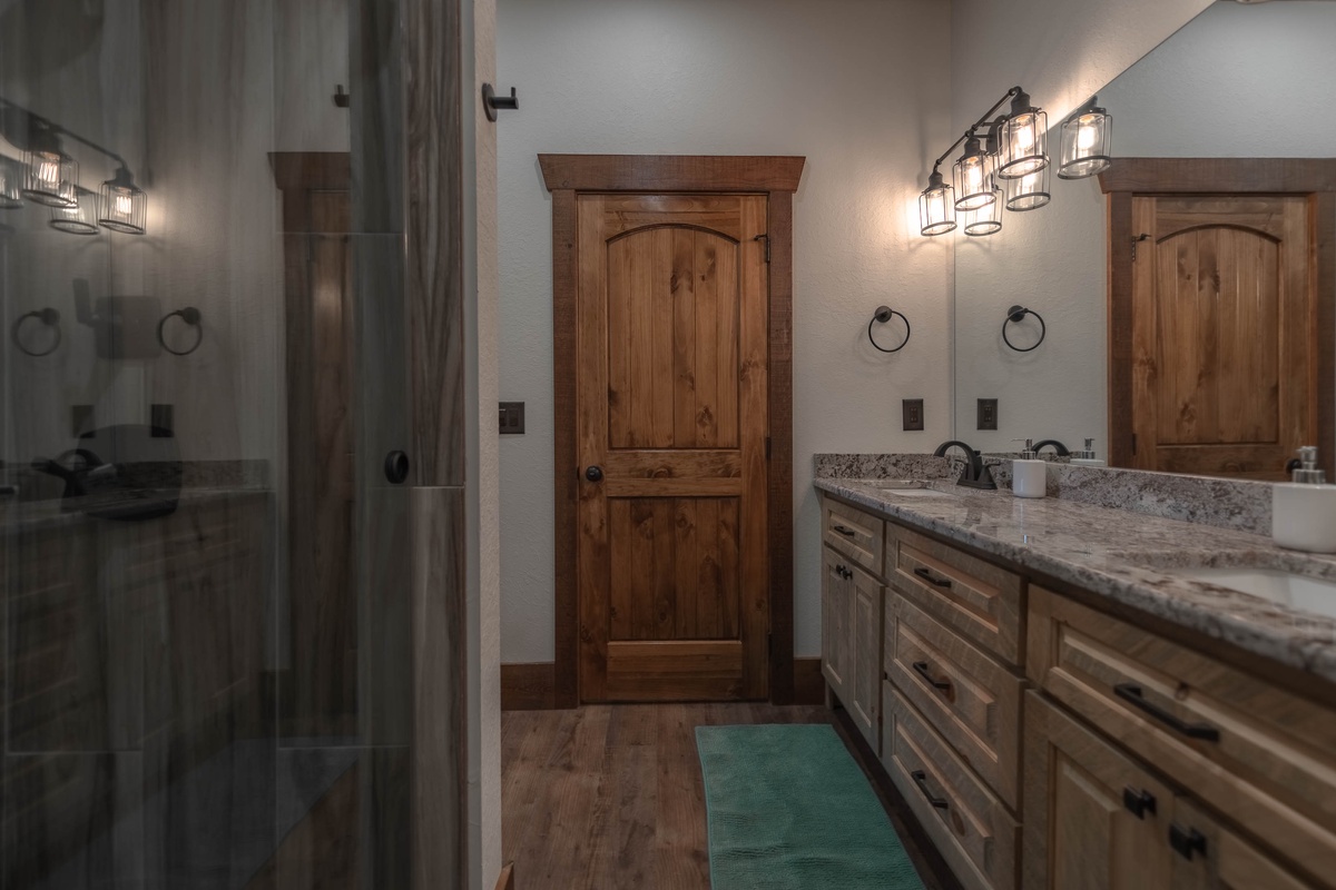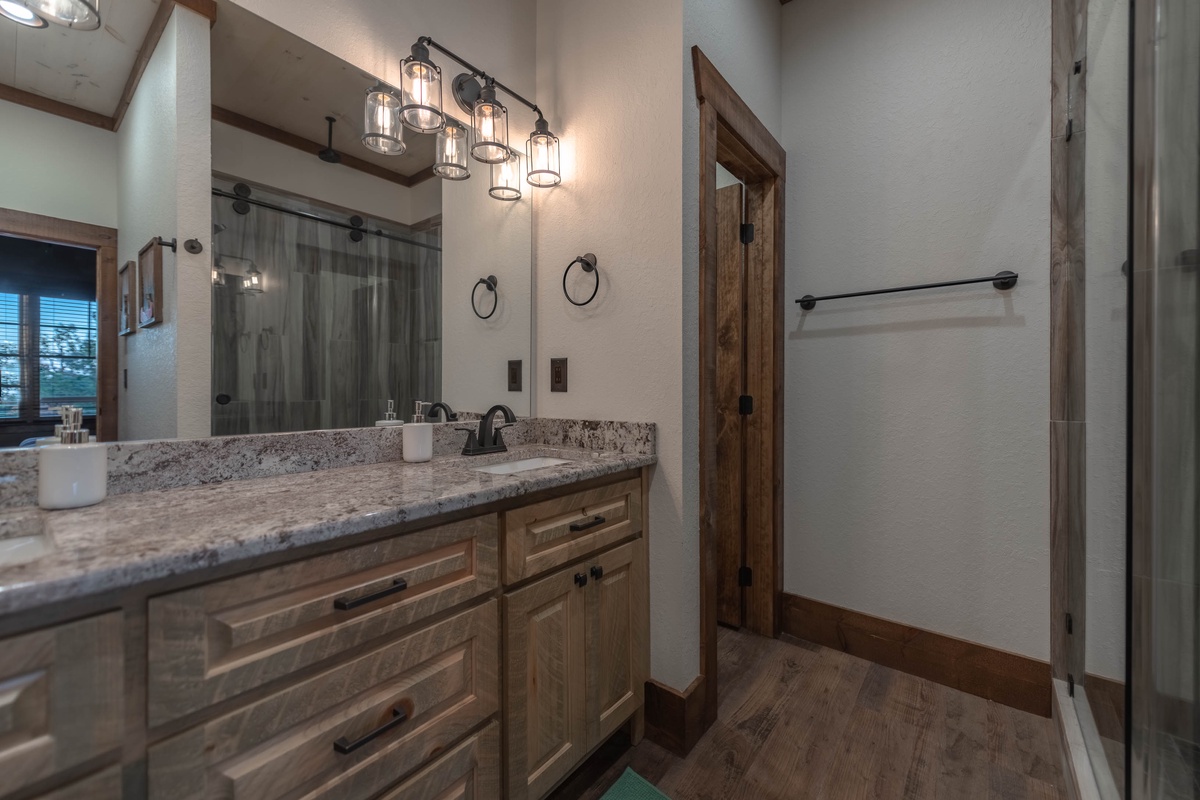 - Master King Bedroom with 42" TV, Deck Access, and Full Bathroom with Double Vanities, Stand Up Rainfall ShowerÂ