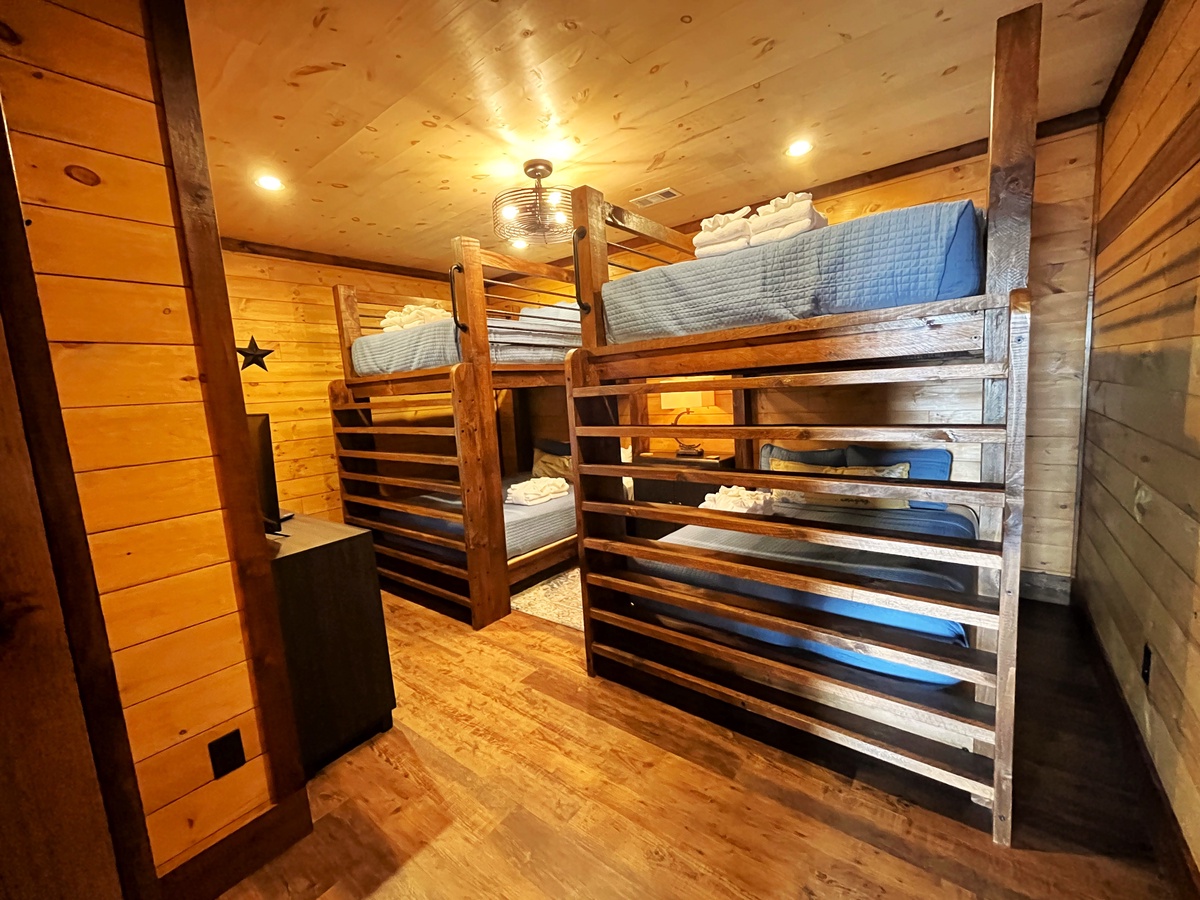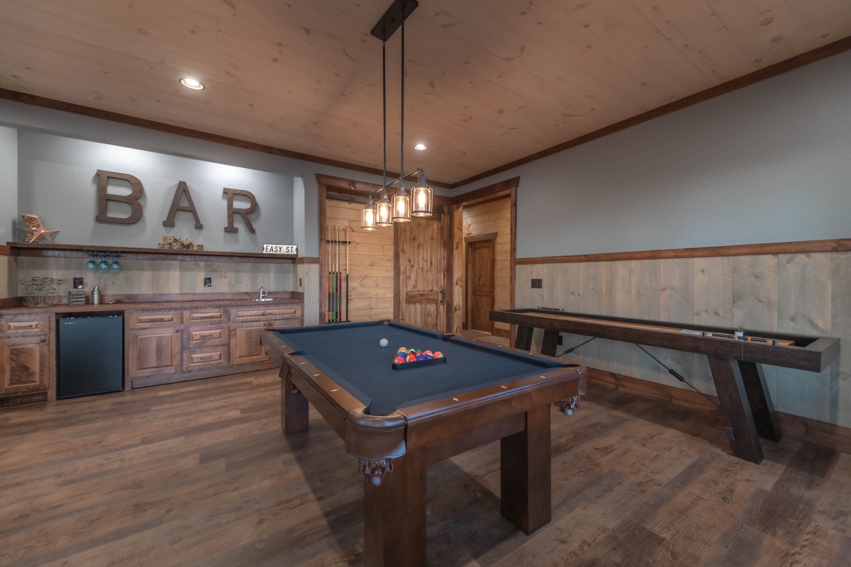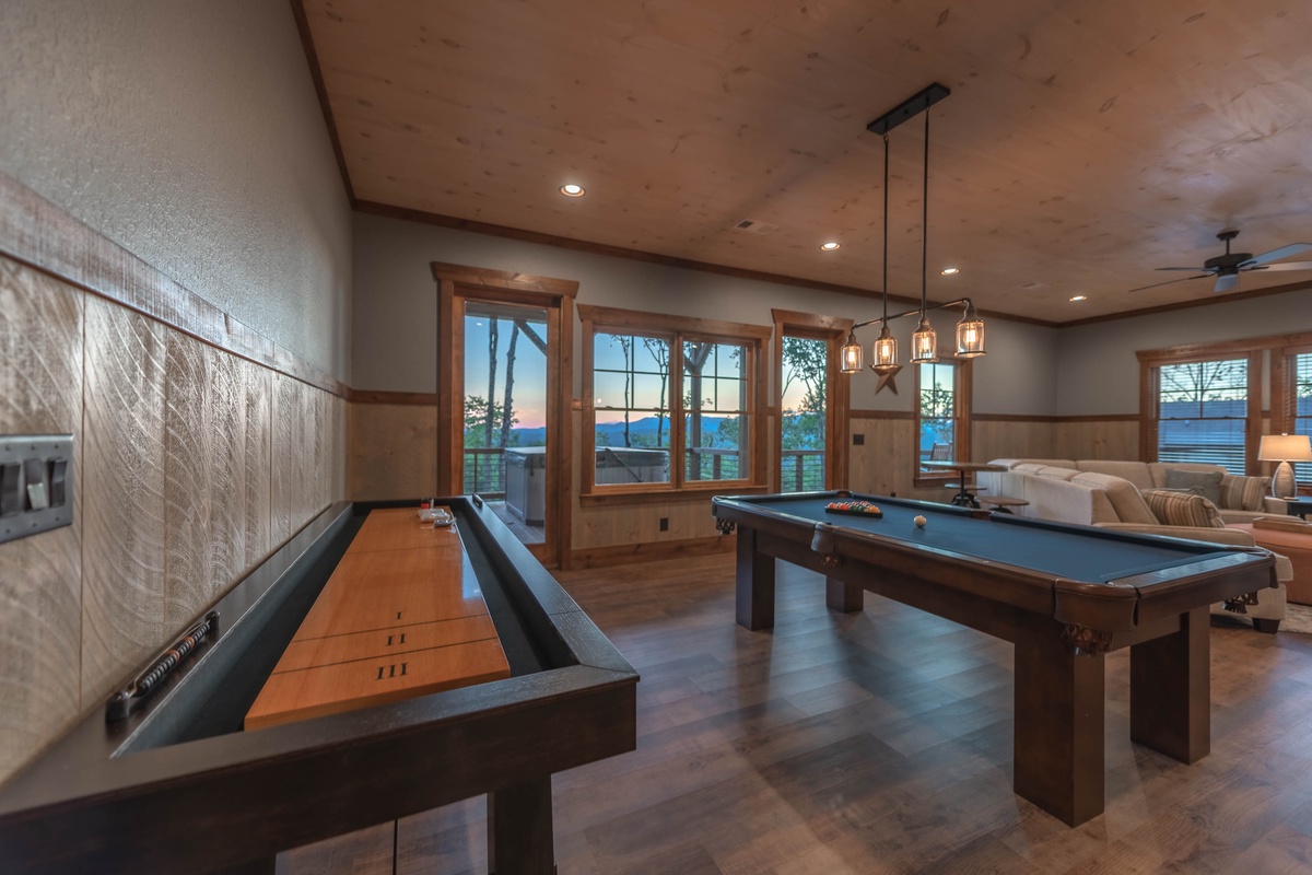 The lower level living area has a wet bar and a 50" smart t.v., a game room with a pool table and shuffleboard. You can retreat to another Master King Suite with a walk-in shower and even another double queen buink room for the teens or college kids who are ready for a break from school and a retreat to the mountains. The basement deck has plenty of outdoor seating including an 8 seater hot tub overlooking the gorgeous views as you soak in the crisp, fresh mountain air.Â