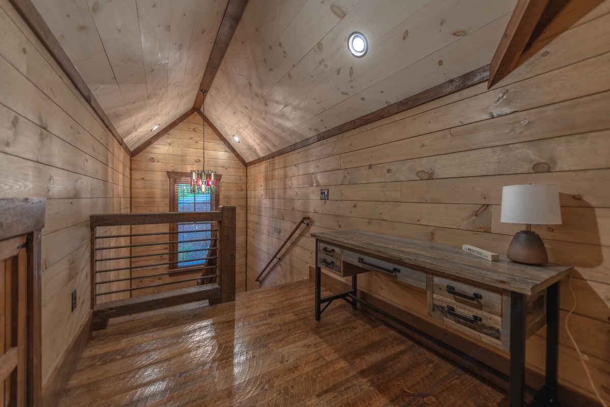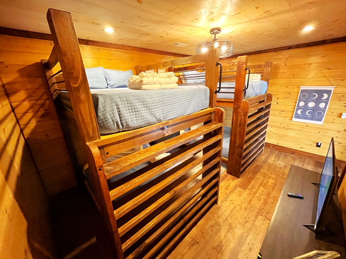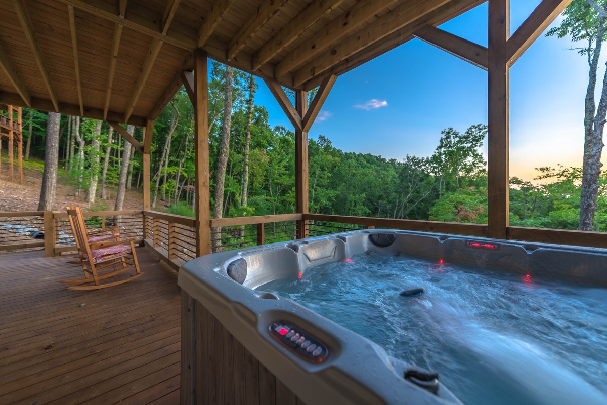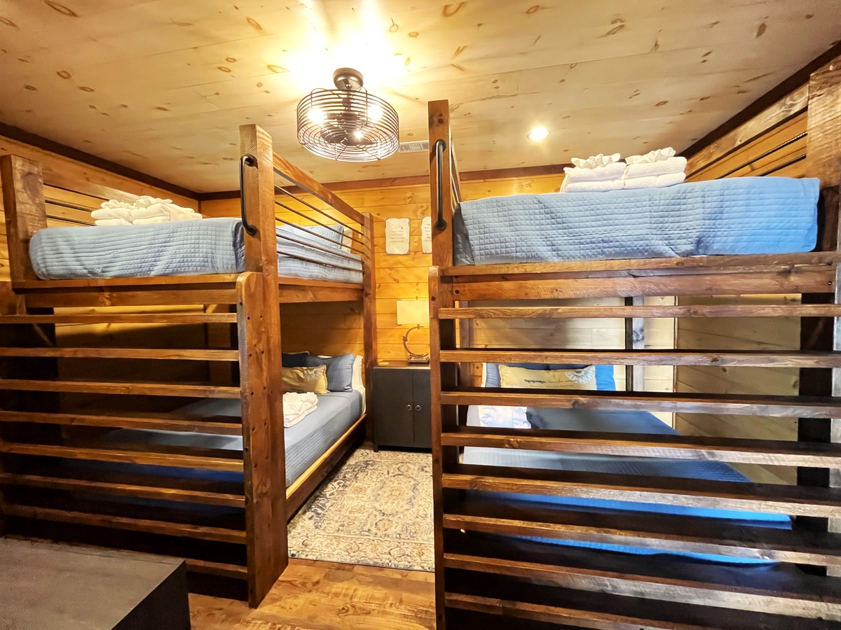 The lower level living area has a wet bar and a 50" smart t.v., a game room with a pool table and shuffleboard. You can retreat to another Master King Suite with a walk-in shower and even another double queen buink room for the teens or college kids who are ready for a break from school and a retreat to the mountains. The basement deck has plenty of outdoor seating including an 8 seater hot tub overlooking the gorgeous views as you soak in the crisp, fresh mountain air.Â