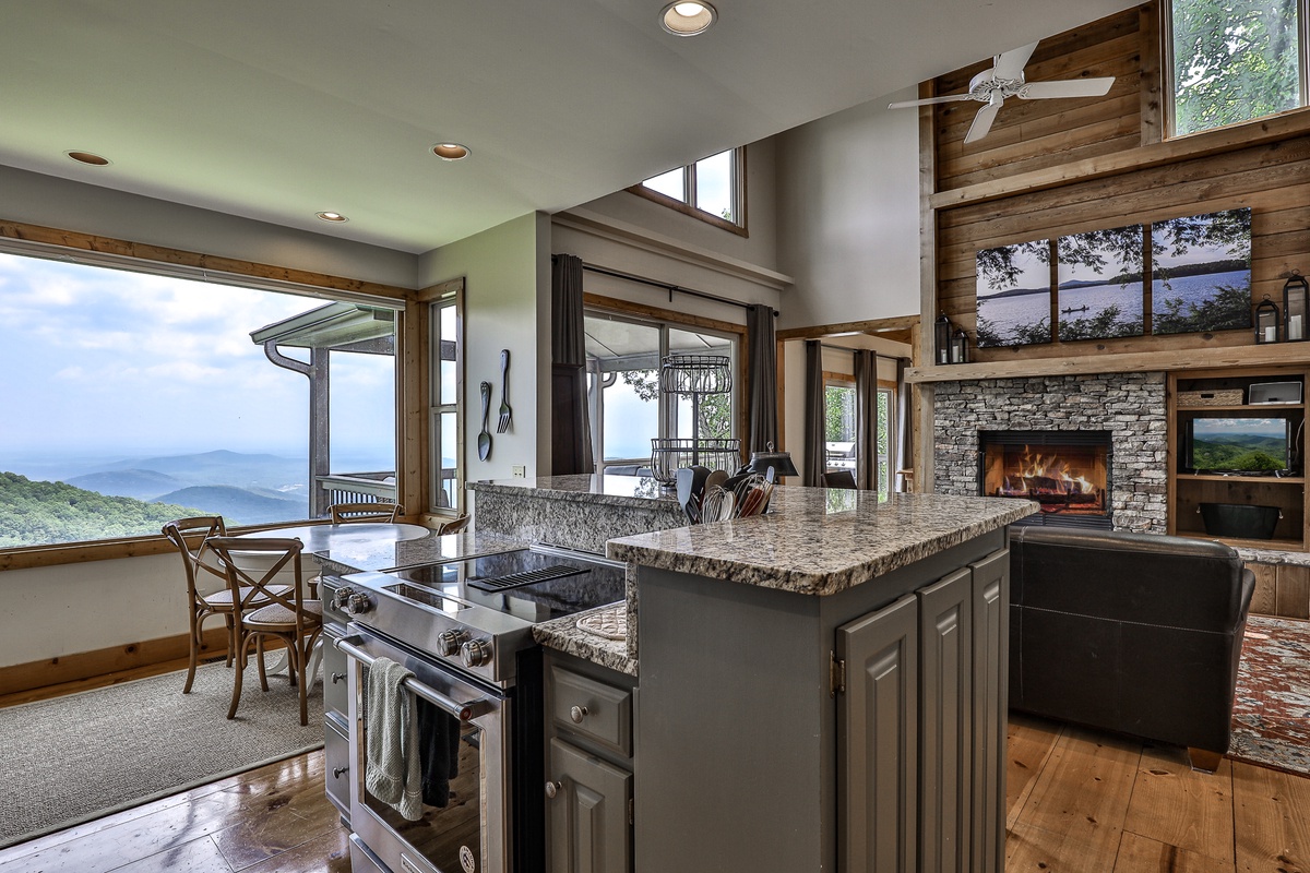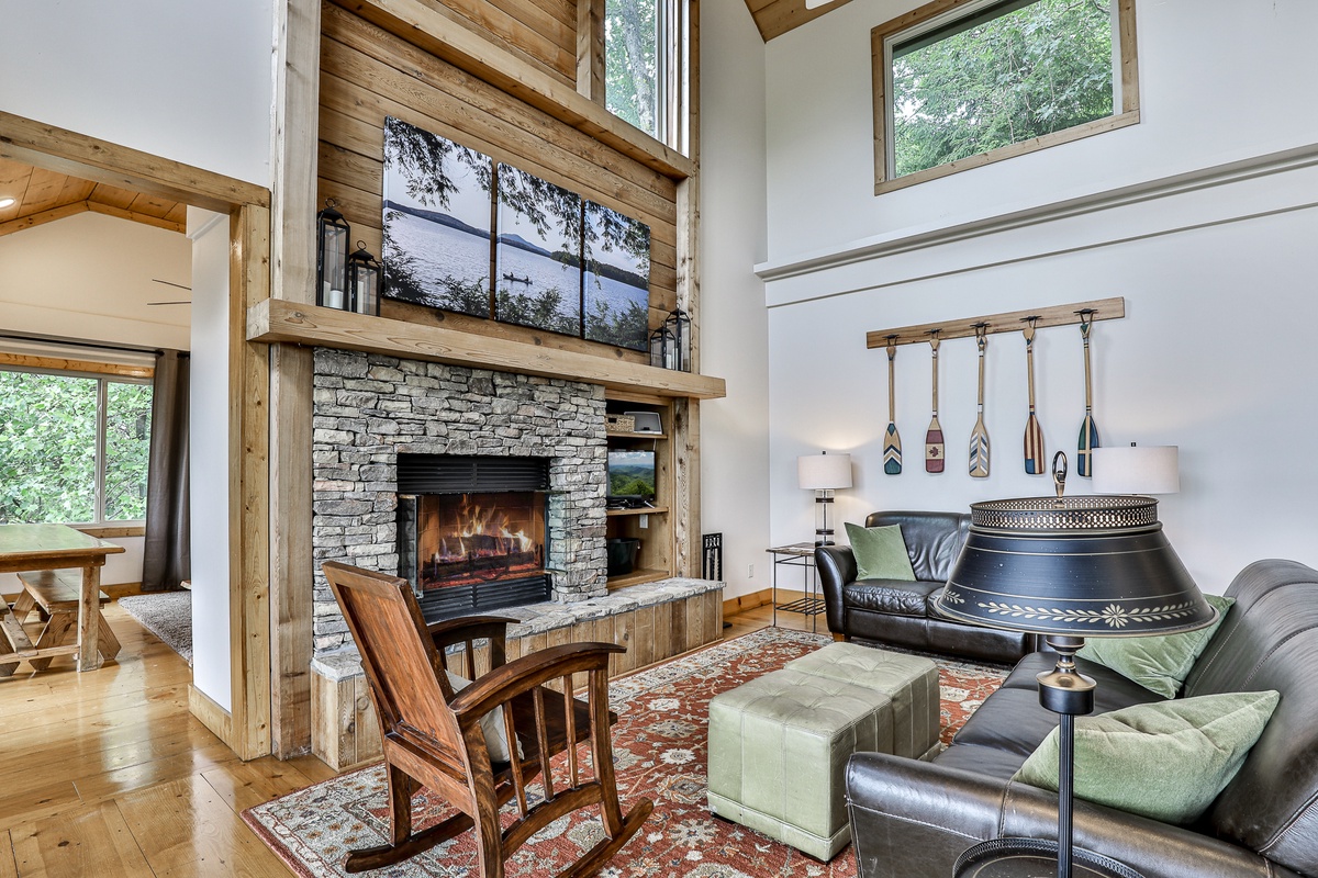 - Spacious great room featuring a cozy wood-burning fireplace