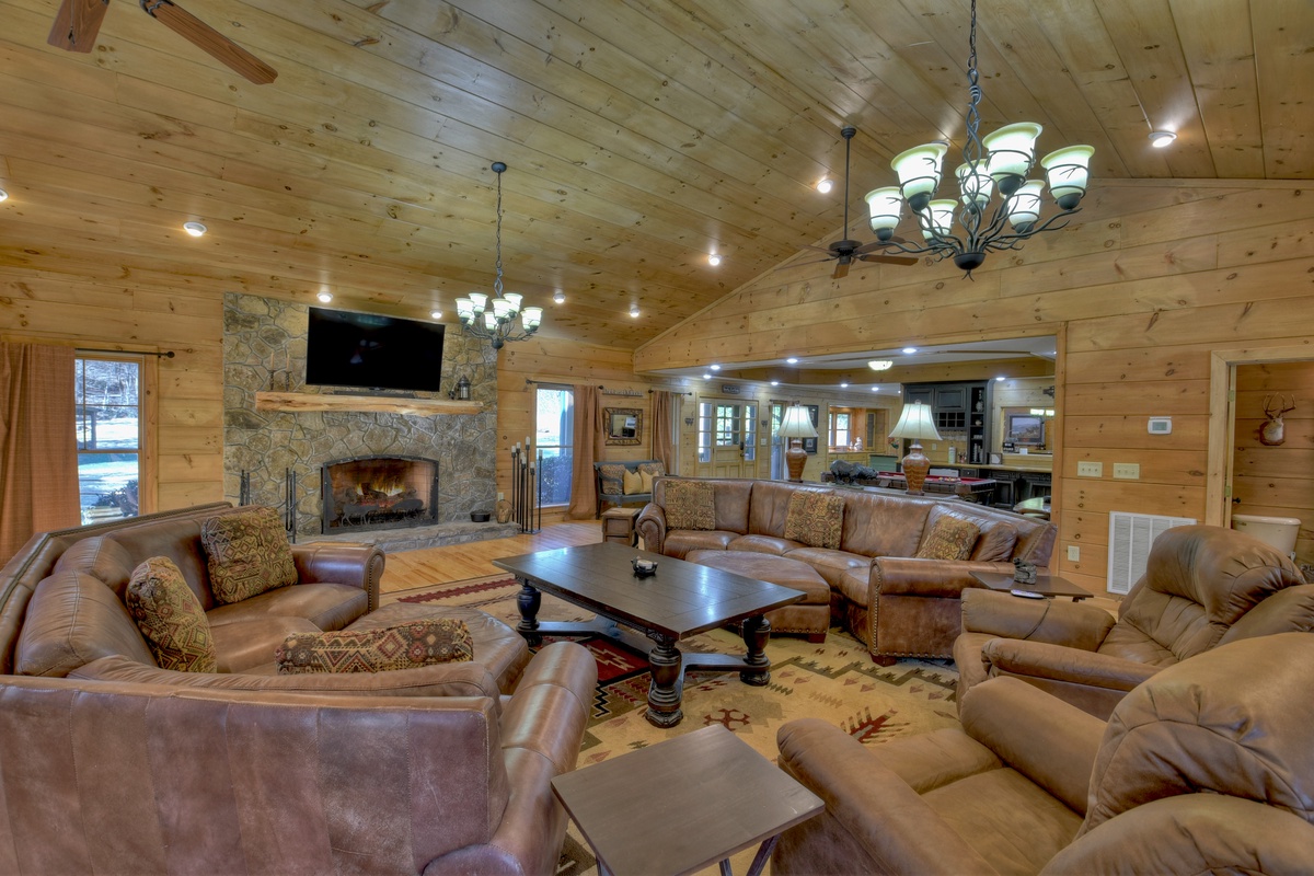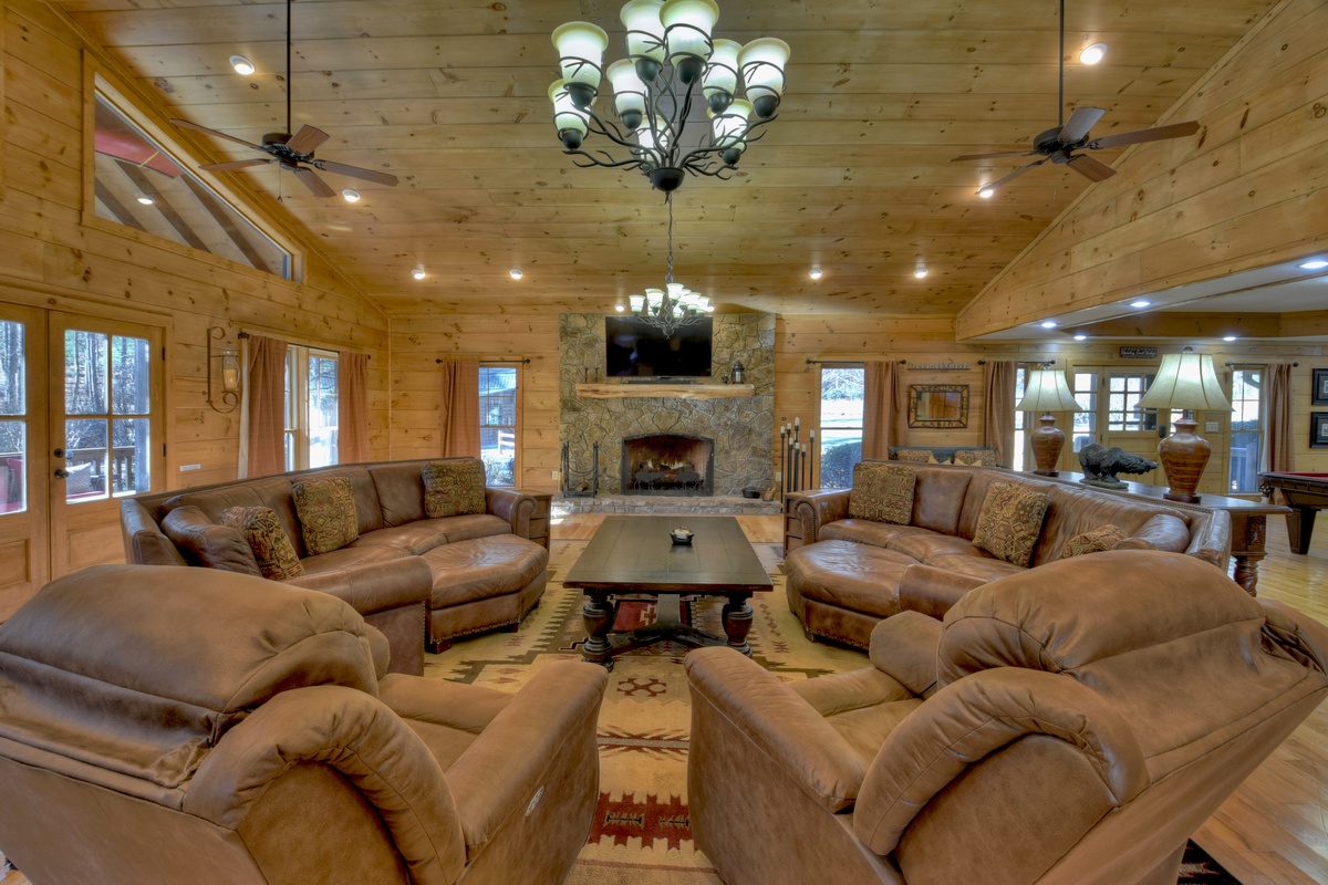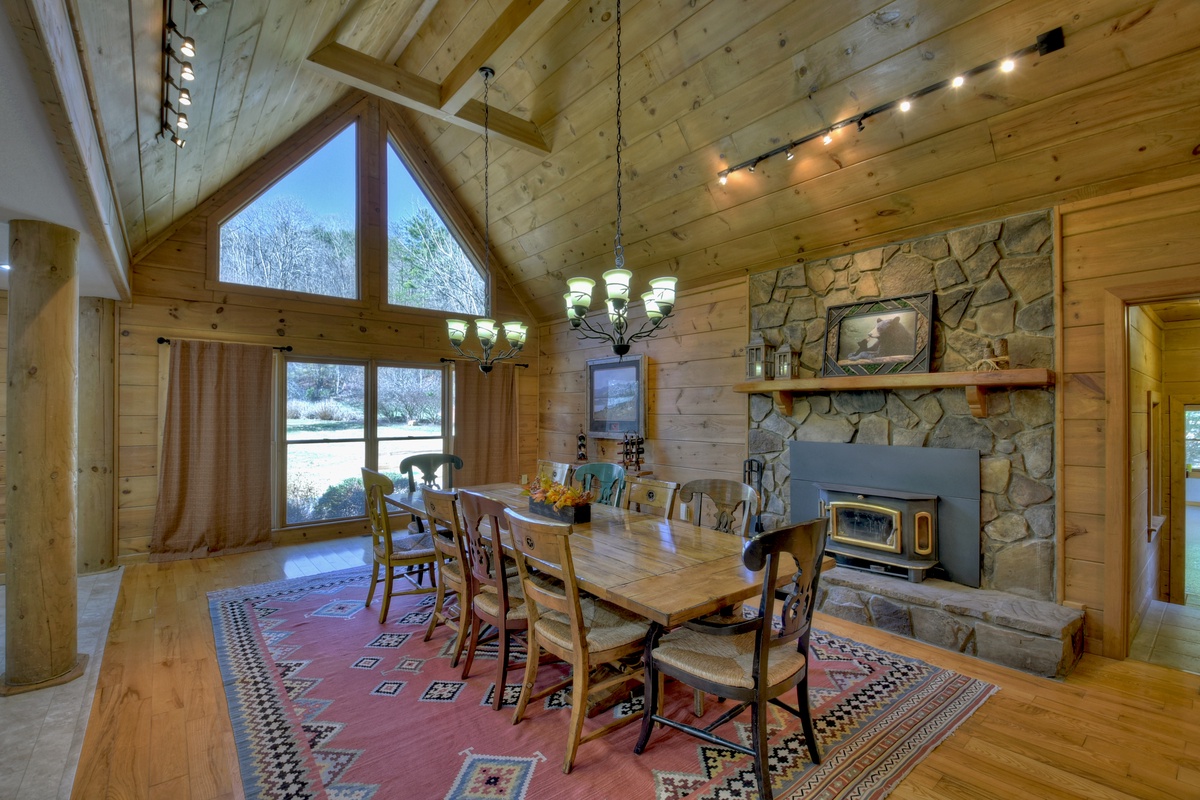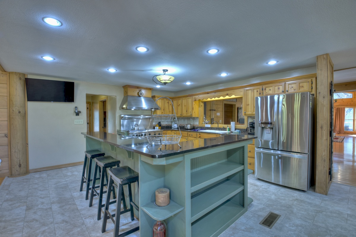 As you drive up to the secluded lodge, you will be greeted by the gated outdoor pool and the sounds of the rushing Stanley Creek waters. The true lodge feel envelops you as you enter the front door. The bar and pool table are awaiting game night and happy hour. To the right is the open living room with soaring log ceilings and a wood burning rock fireplace with entrance to the pool. To the left you will find a fully equipped chef's kitchen with stainless-steel appliances including an 8 burner stove and double oven and serving bar area with new wine refrigerator plus another wood-burning fireplace and dining area.