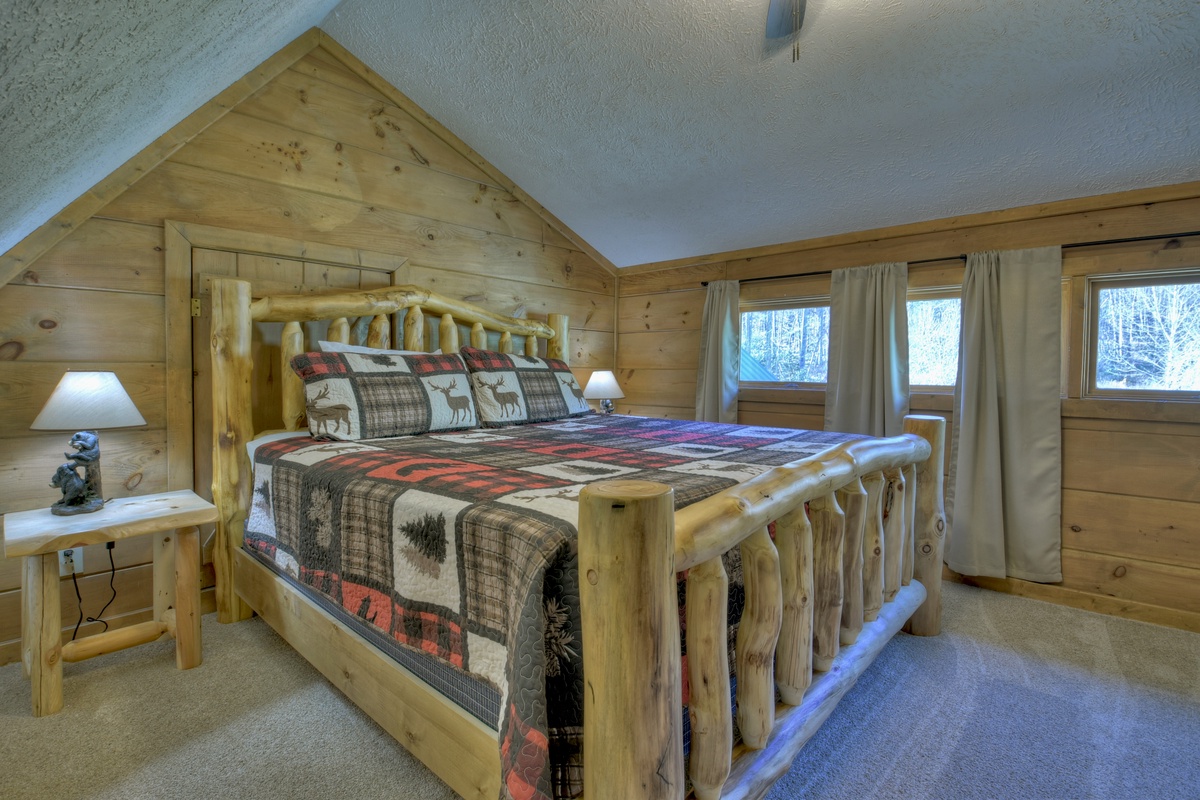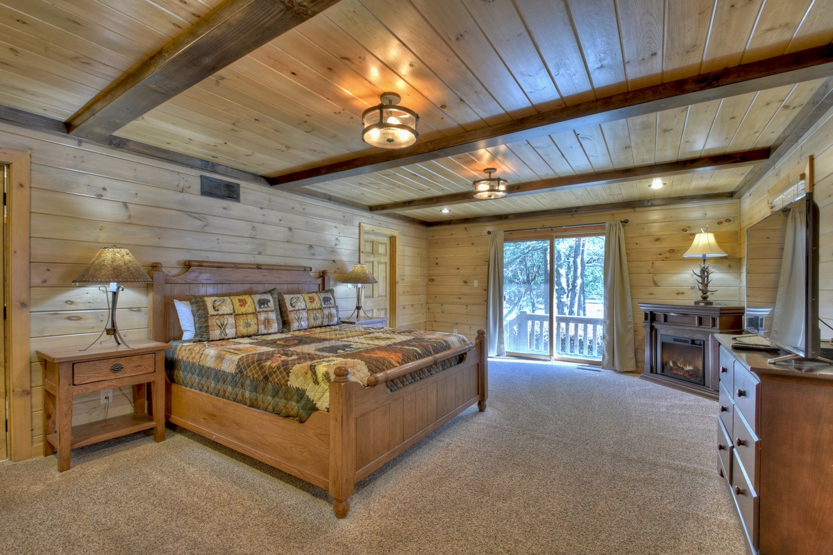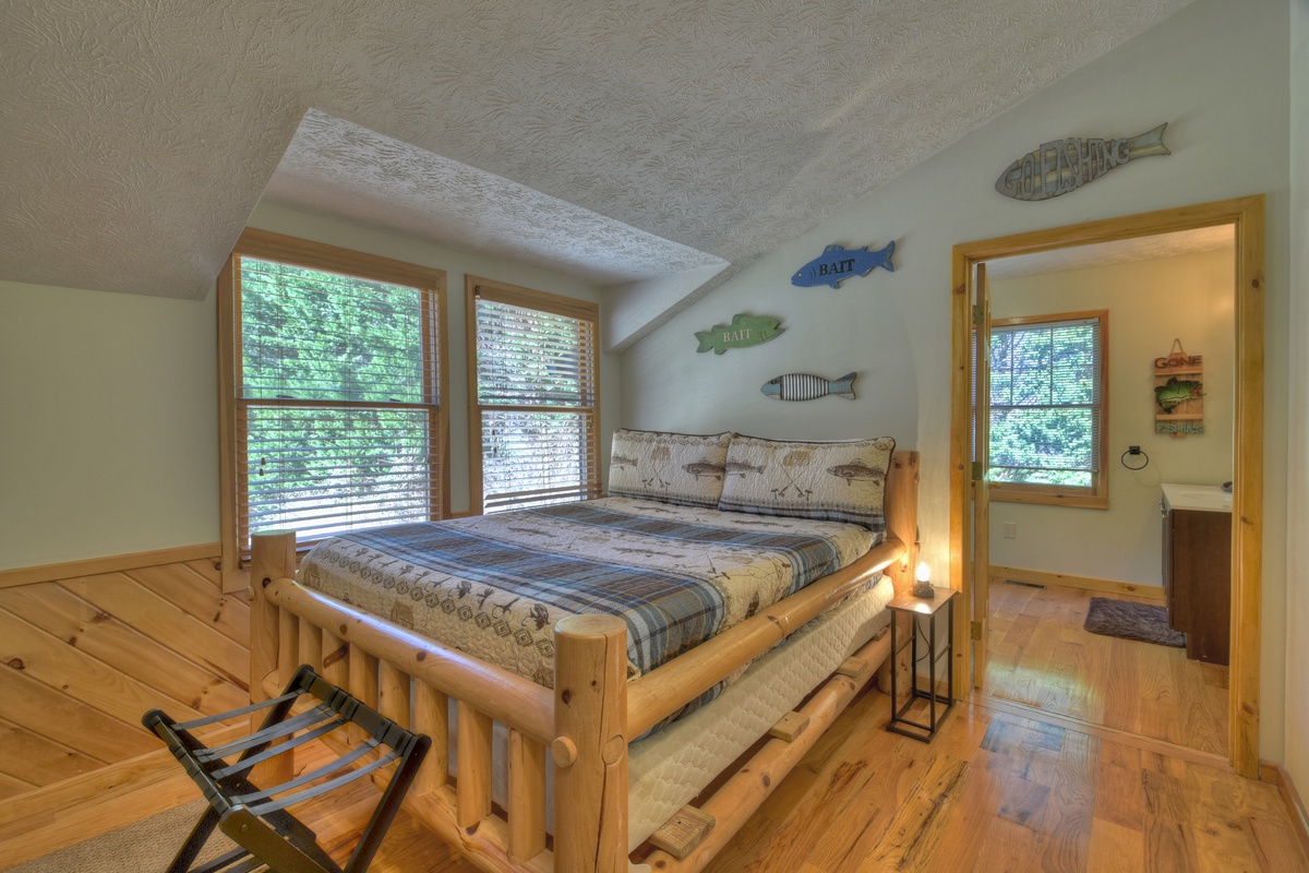 Find your way down the hallway to the master king suite, over-looking the creek, and full bath with jetted tub and private entry to the oversized outdoor hot tub. Upstairs over the master king is another room with a king bed and a full bath with shower/tub combo. On the other end find the attached garage where you will find a game room with a pool table, card table, ping pong, and shuffleboard on the lower level. Upstairs above the garage are two more bedrooms. A beautiful view of Stanley Creek awaits you in the master suite that holds a king size bed, twin bunk bed and a full private bathroom with jetted tub. The other suite holds a queen size bed, twin bunk bed and a private bathroom with a shower.