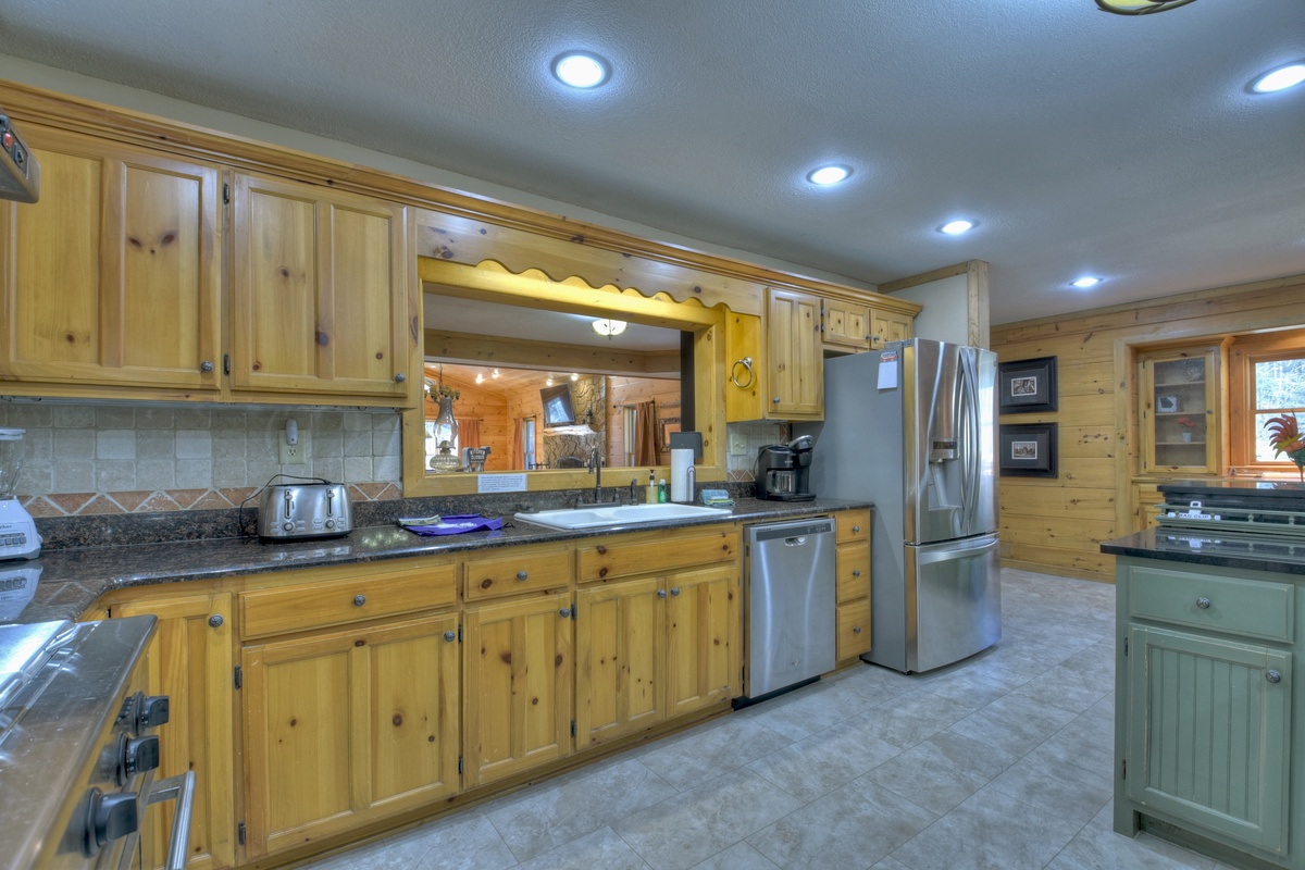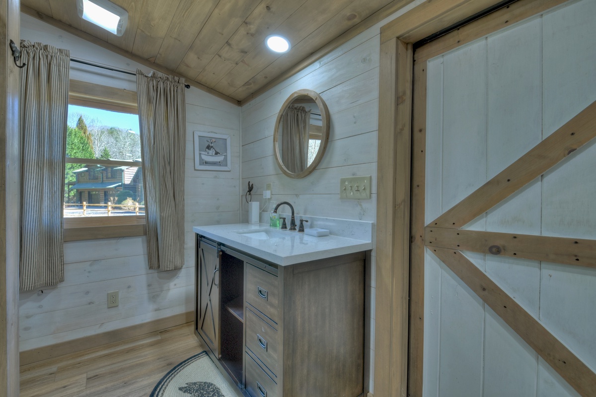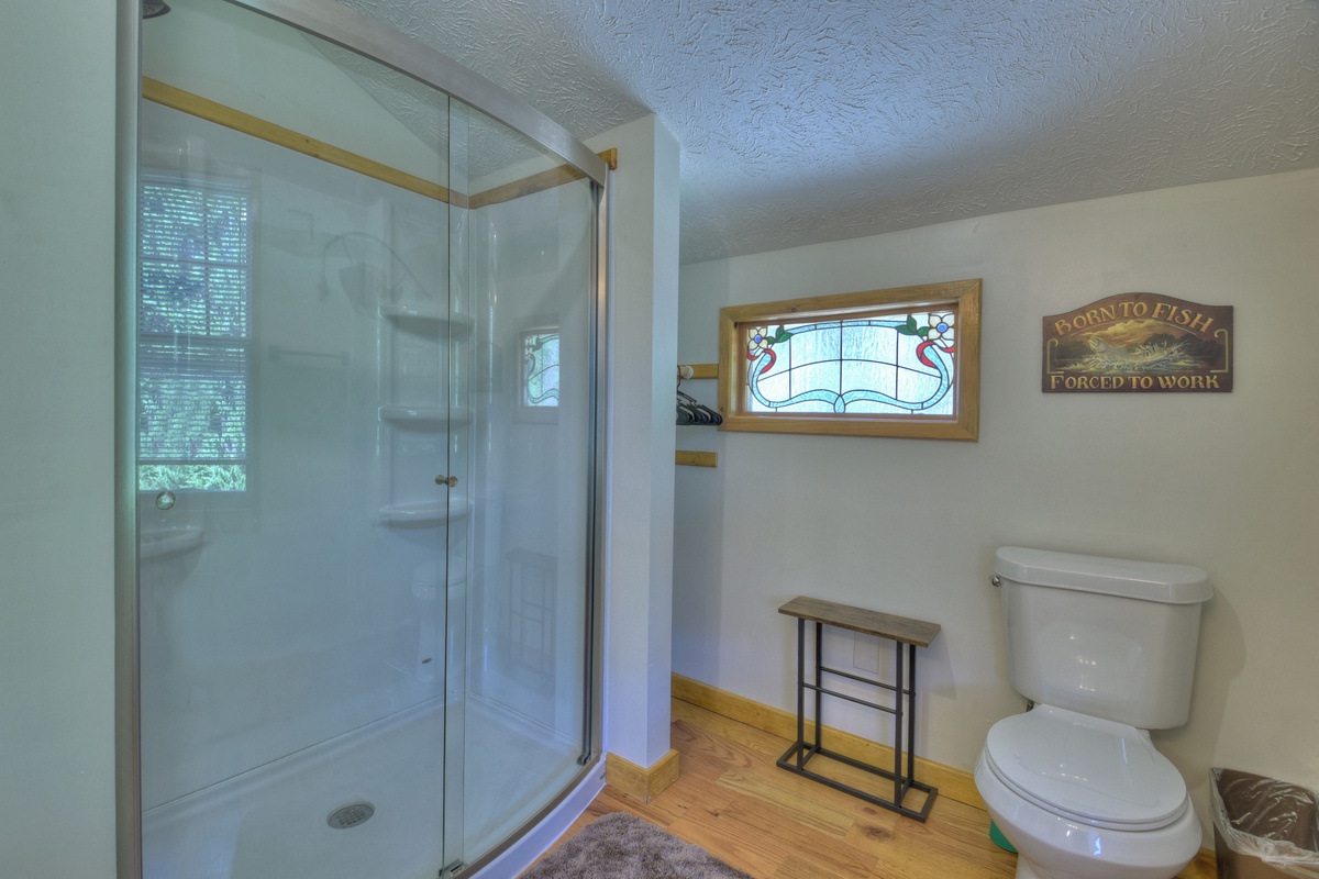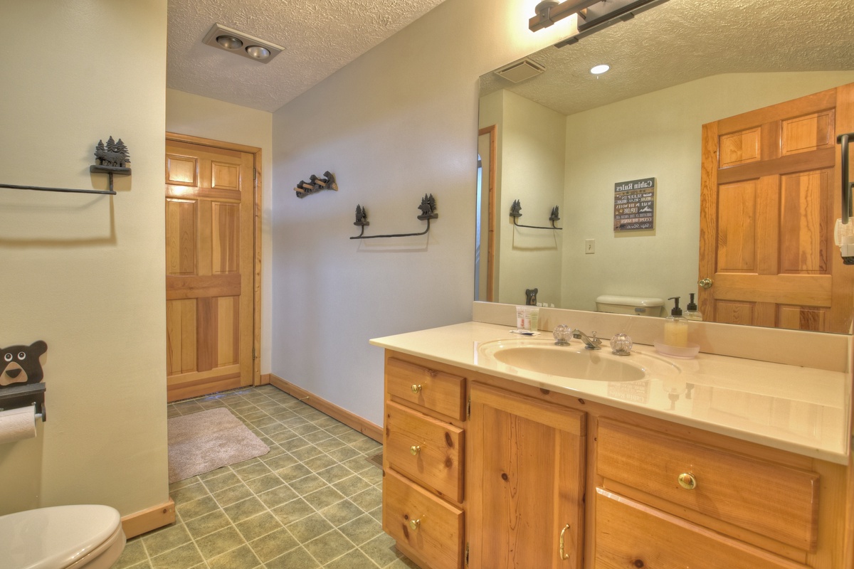 Find your way down the hallway to the master king suite, over-looking the creek, and full bath with jetted tub and private entry to the oversized outdoor hot tub. Upstairs over the master king is another room with a king bed and a full bath with shower/tub combo. On the other end find the attached garage where you will find a game room with a pool table, card table, ping pong, and shuffleboard on the lower level. Upstairs above the garage are two more bedrooms. A beautiful view of Stanley Creek awaits you in the master suite that holds a king size bed, twin bunk bed and a full private bathroom with jetted tub. The other suite holds a queen size bed, twin bunk bed and a private bathroom with a shower.