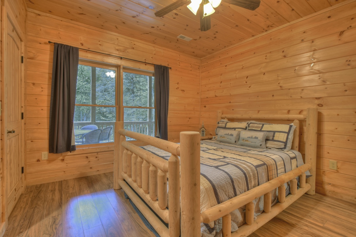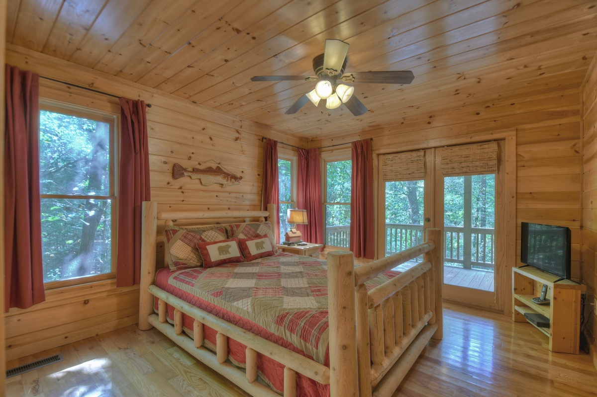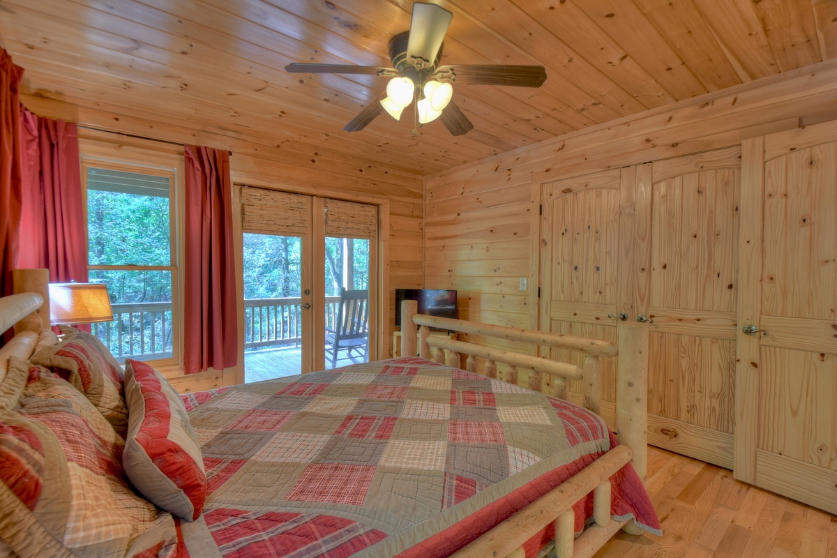 - Queen suite with TV and private balcony overlooking Ellijay River