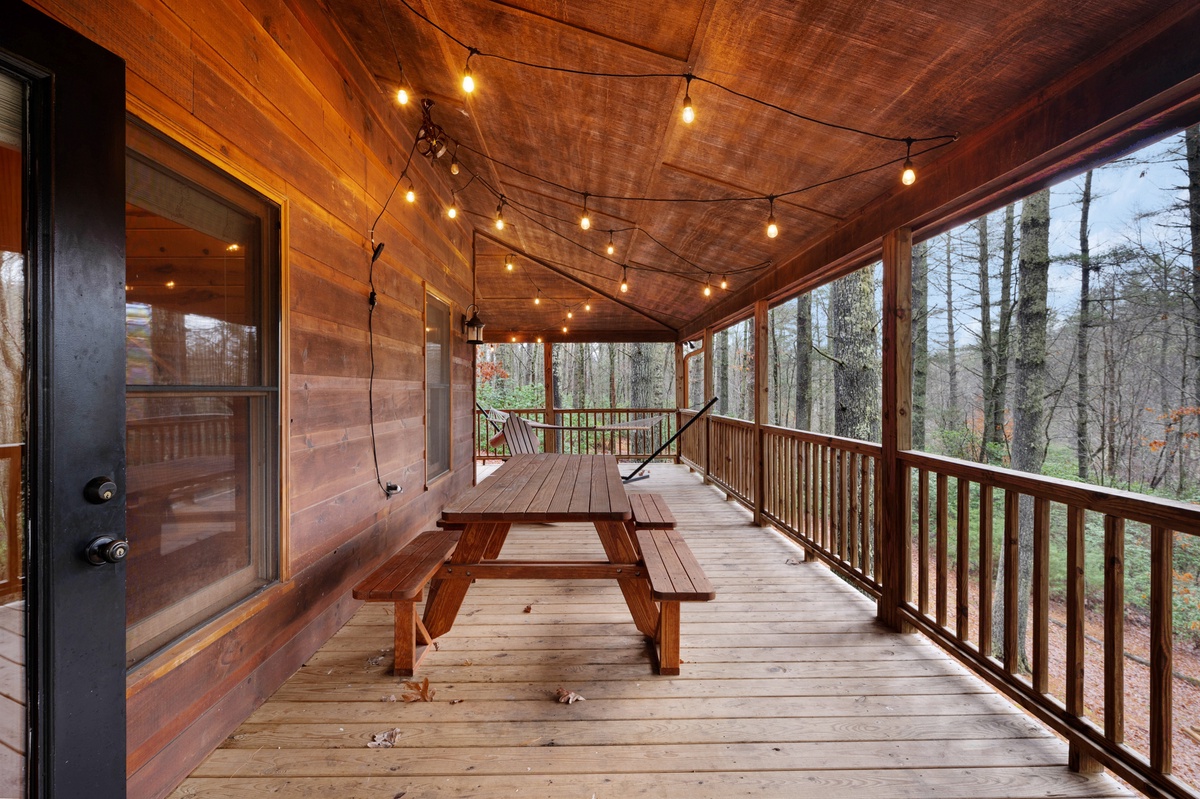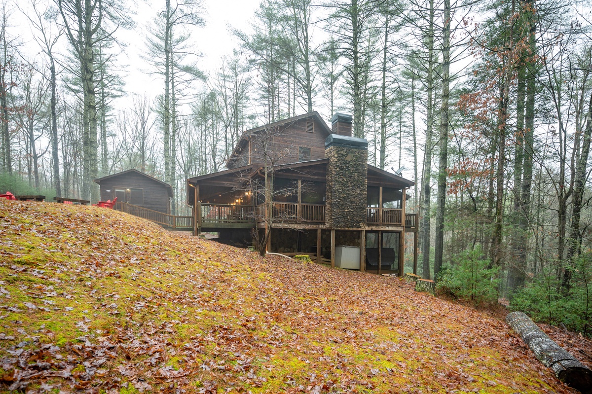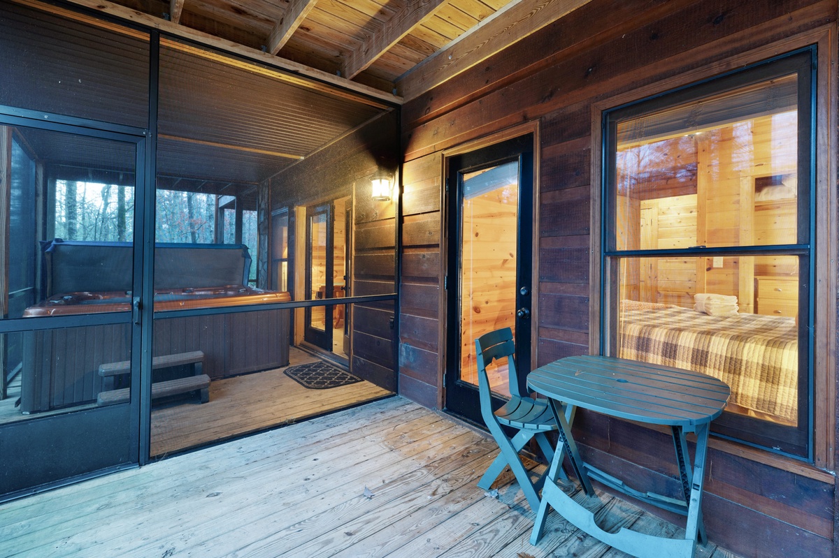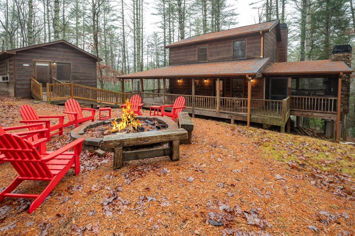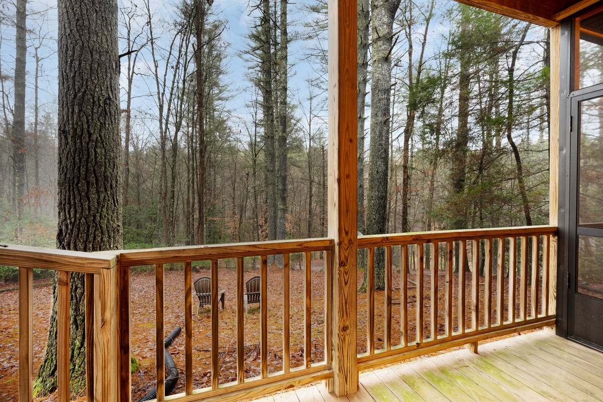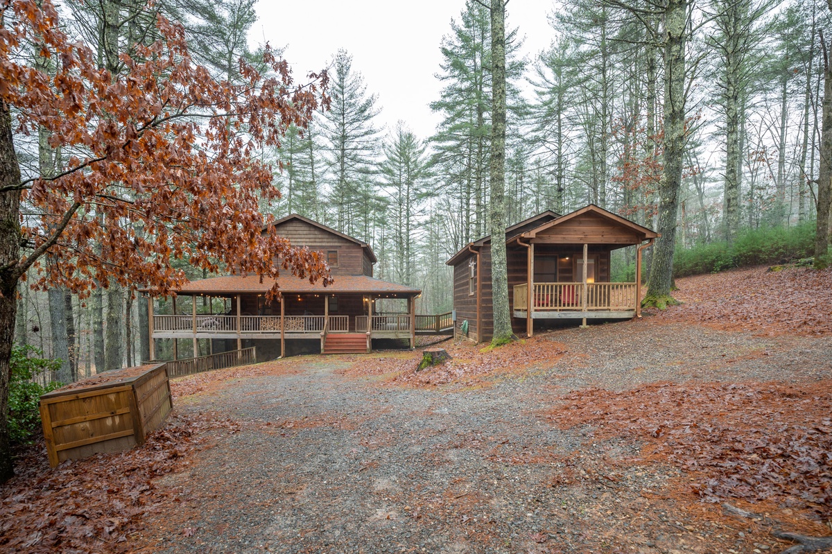 Nestled in a gated and secluded property, Storybook Hideaway is a quiet retreat from the hustle and bustle of daily life, perfect for gatherings of family or friends. The main cabin and detached cottage feature spacious outdoor living areas and ample seating to enjoy the wooded vistas, songbirds, and the frequent deer families that make our property home. As our ancestors knew, the best place to tell stories of your own is around a communal fire, and this property provides three options: a large outdoor firepit, recently regraded and graveled, and two wood-burning fireplaces. One is in a beautiful fully screened porch and the other in the cozy living room inside the cabin. The main cabin is entirely surrounded by a wide porch featuring mountain pioneer style furniture, a picnic table, and string lights. You can find more photos of the cabin on our Instagram page @StorybookHideaway.