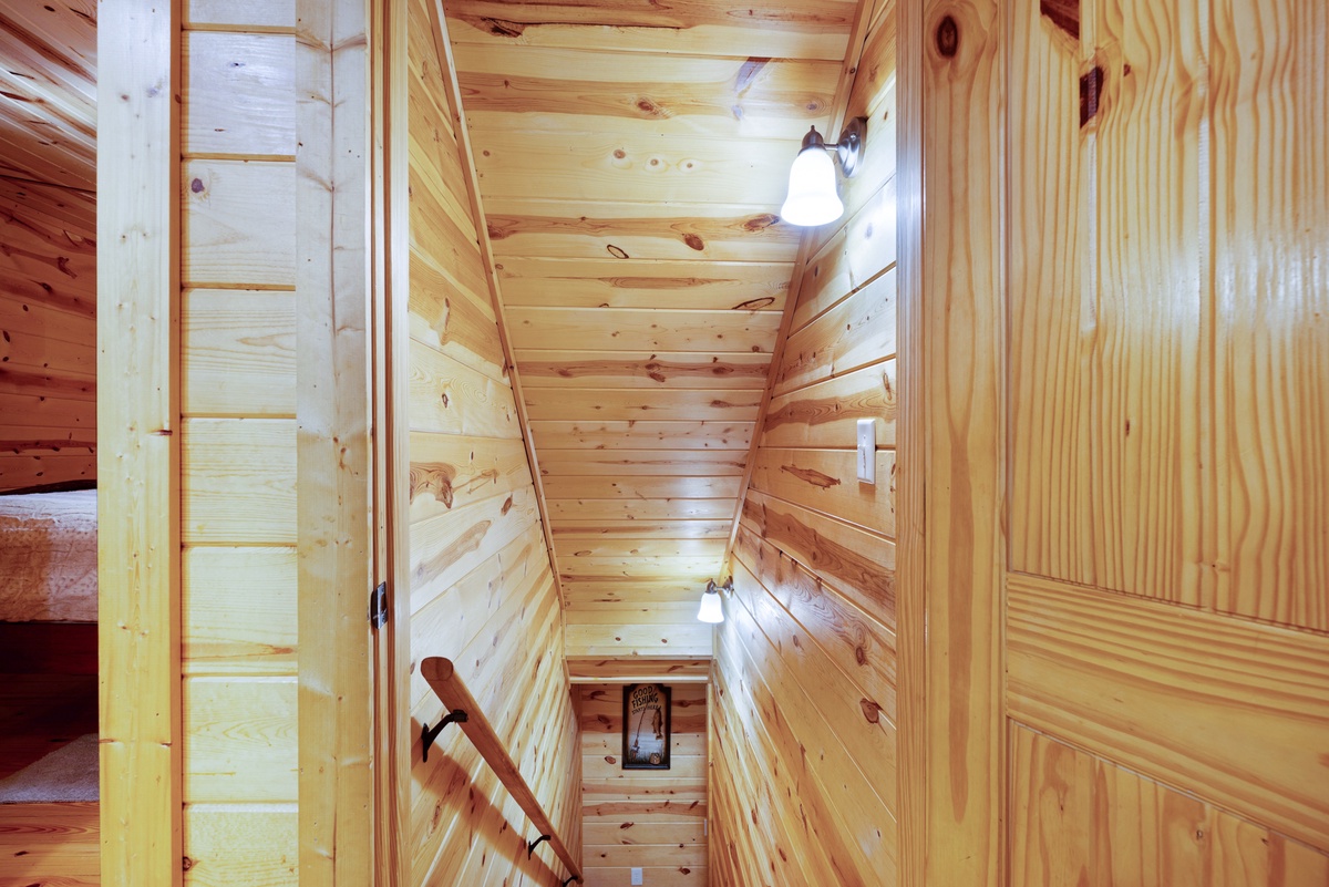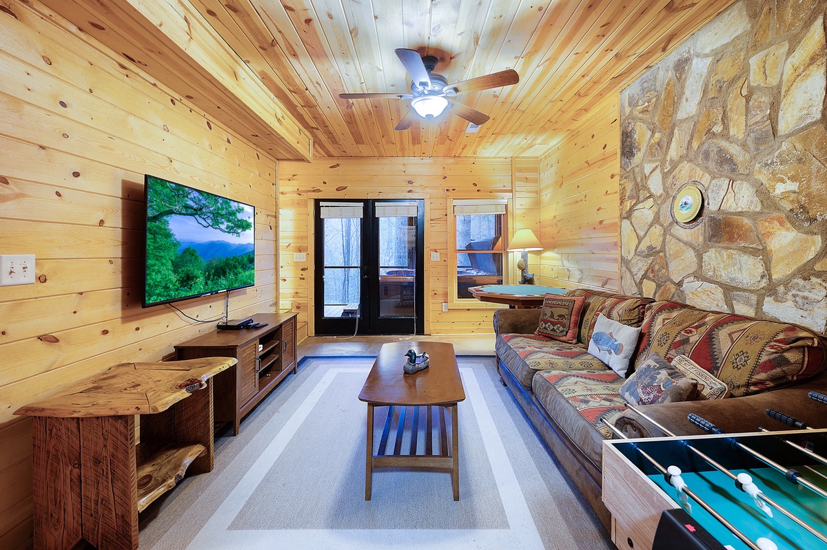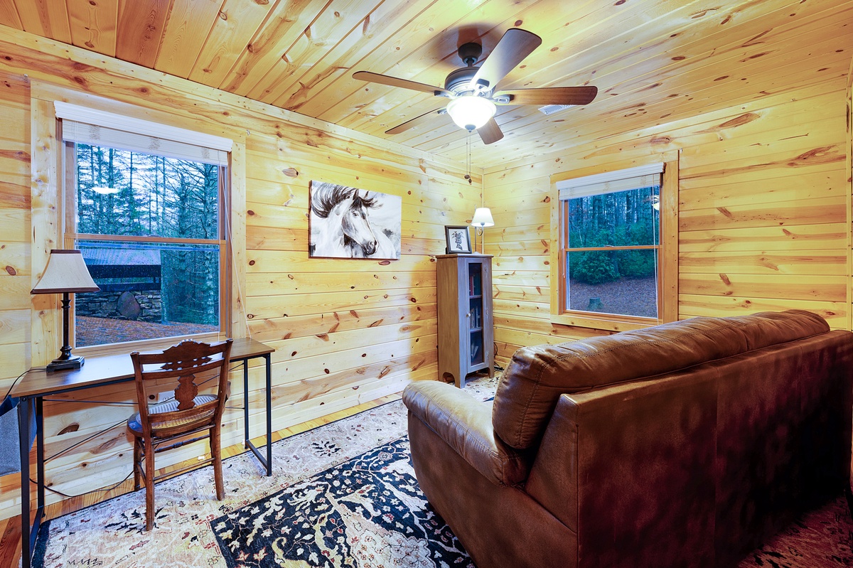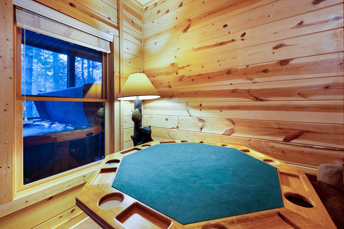 Each of the bedrooms is tastefully themed in the fashion of storybook favorites. In the large, main cabin there is a fully appointed kitchen and dining table, living room, the Call of the Wild bedroom, and one bathroom. Upstairs, a loft, with sofa, desk, and bookshelves, provides a quiet place for those who either need to finish a couple of quick work details or escape to another place and time with their favorite book. The Huckleberry Finn and Little House on the Prairie bedrooms and one bathroom are on the upper level as well. On the lower level of the house is a two-player indoor basketball game, foosball table that coverts to ping-pong and other games, a card table that converts into bumper pool table, and a 55” TV with DVD player and Wii console. The lower level also has a laundry room, bathroom, and the Legend of Sleepy Hollow bedroom, with its own entrance onto a private porch. The hot tub is in a fully screened porch off of the entertainment room.