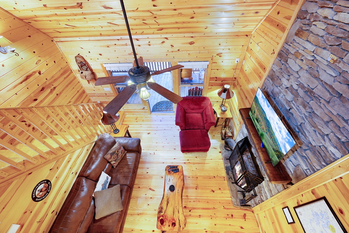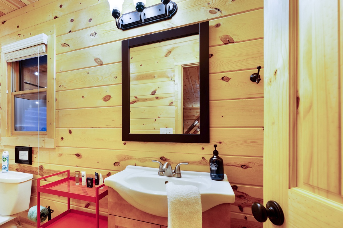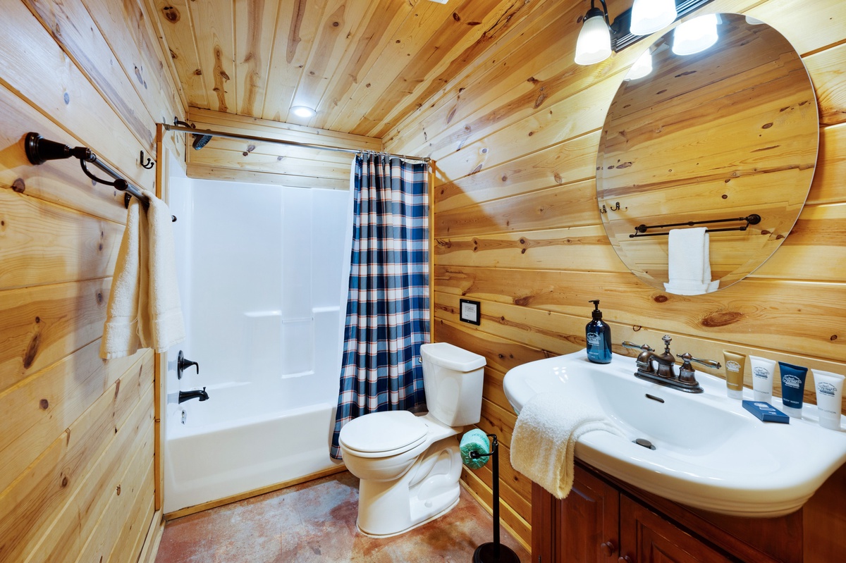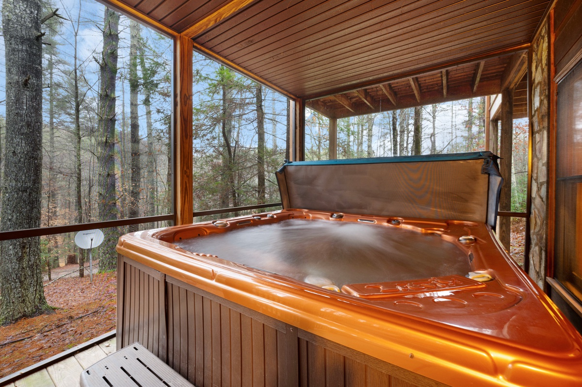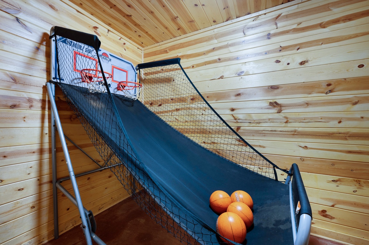 Each of the bedrooms is tastefully themed in the fashion of storybook favorites. In the large, main cabin there is a fully appointed kitchen and dining table, living room, the Call of the Wild bedroom, and one bathroom. Upstairs, a loft, with sofa, desk, and bookshelves, provides a quiet place for those who either need to finish a couple of quick work details or escape to another place and time with their favorite book. The Huckleberry Finn and Little House on the Prairie bedrooms and one bathroom are on the upper level as well. On the lower level of the house is a two-player indoor basketball game, foosball table that coverts to ping-pong and other games, a card table that converts into bumper pool table, and a 55” TV with DVD player and Wii console. The lower level also has a laundry room, bathroom, and the Legend of Sleepy Hollow bedroom, with its own entrance onto a private porch. The hot tub is in a fully screened porch off of the entertainment room.