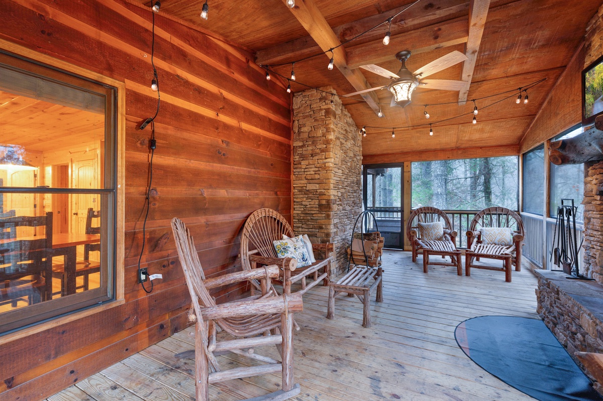- Right side: Screened in area holding stone laid wood burning fireplace, rocking chair, 2 lounge chairs, love seat, table for 2 and TV