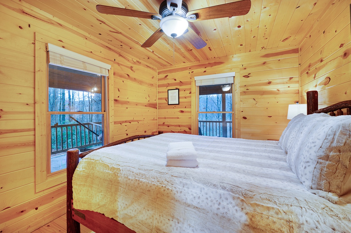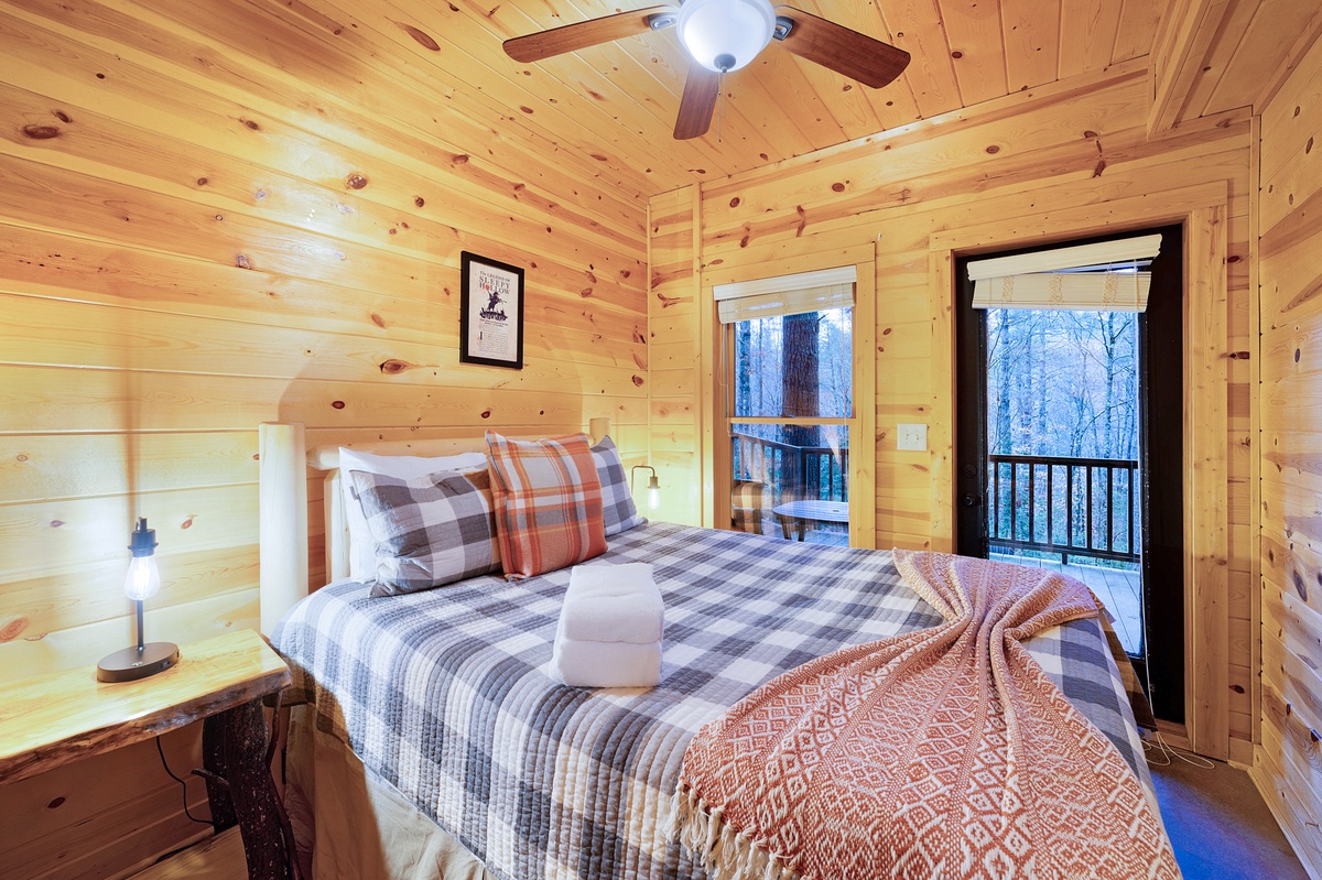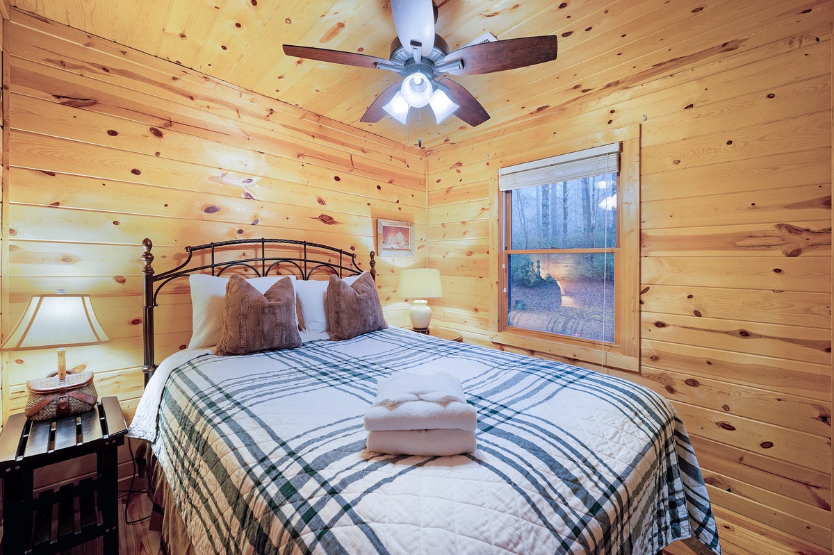 You’ll find three unique bonuses at Storybook Hideaway. First is the Hansel and Gretel cottage, which provides a little extra privacy for those newlyweds in the family or those celebrating the silver years of their journey together. The cottage has its own kitchenette (stove, oven, microwave, sink, and full-sized refrigerator/freezer), private bedroom, bathroom, and its own front porch. Second, it's a wonderful place for your furry friends to explore, as it is dog-friendly, with heavy wooden gates that close off the stairs to the porch, allowing you to keep your pup gated while you both watch for squirrels. Third, there is an 8-minute walk to the Toccoa River from the property. While it’s a steep walk, up and down, if you can bring folding chairs or find a mossy seat it’s worth it to enjoy the rushing water. In the summertime, wave to the tubers floating by!