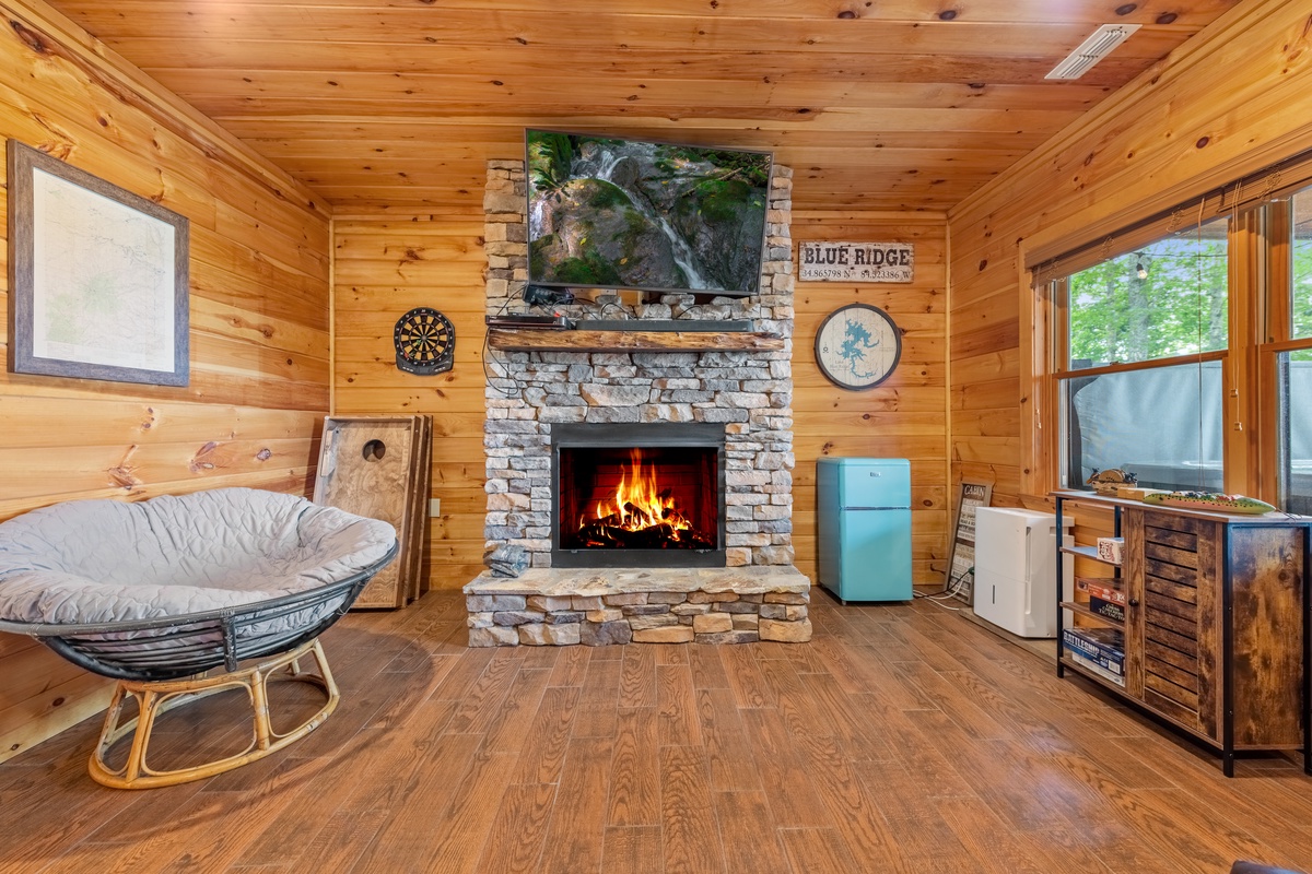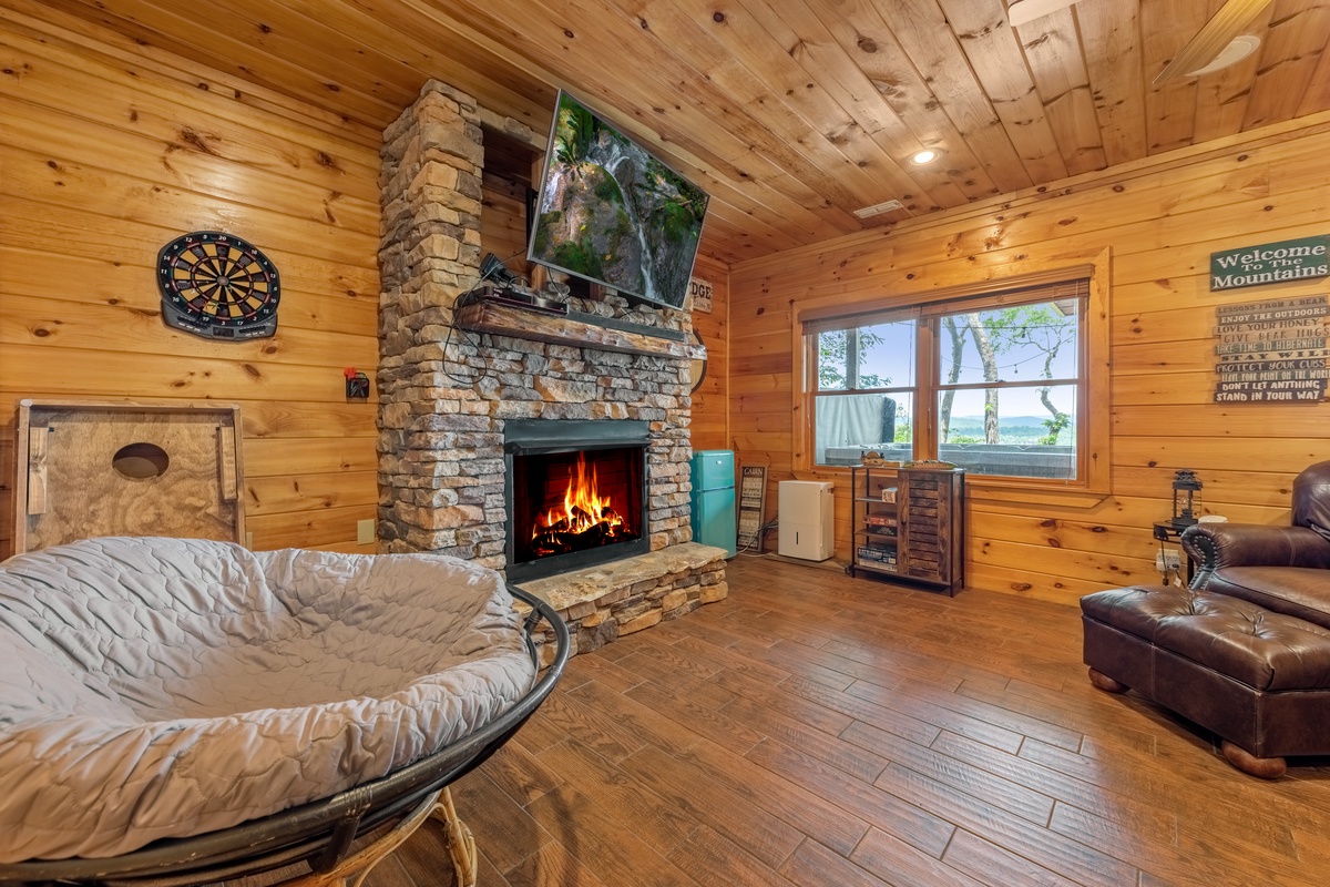 - Gas fireplace with 55” TV, mini fridge and dart board