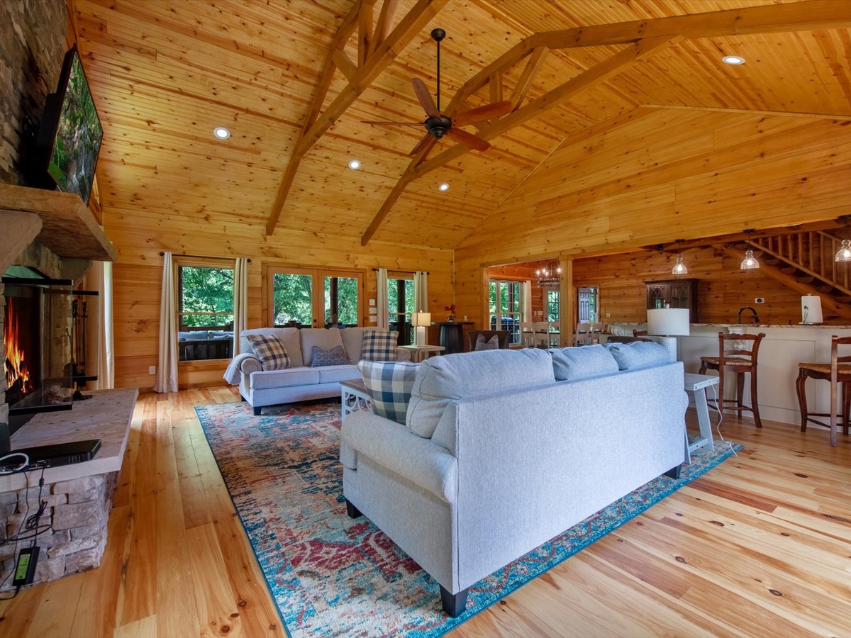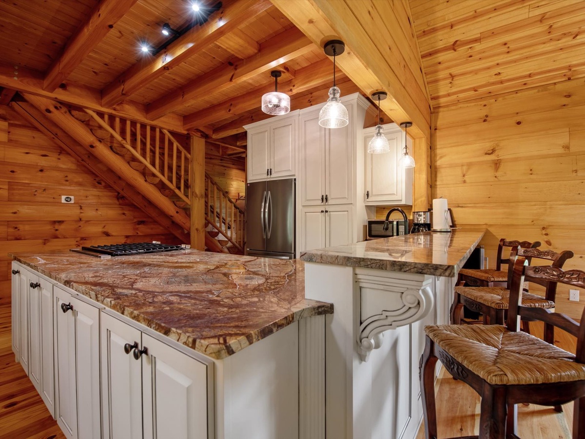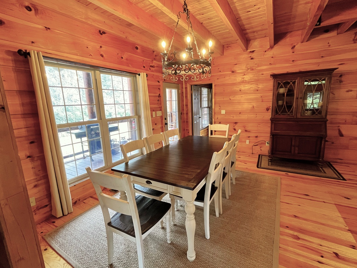 When you enter the cabin’s kitchen, you’ll enjoy the open floor plan as you are greeted by the beautiful living room with its large fireplace and comfortable seating. The dining area, with table seating 8, is separated from the kitchen by a counter top that makes serving your hot meals smooth and easy.