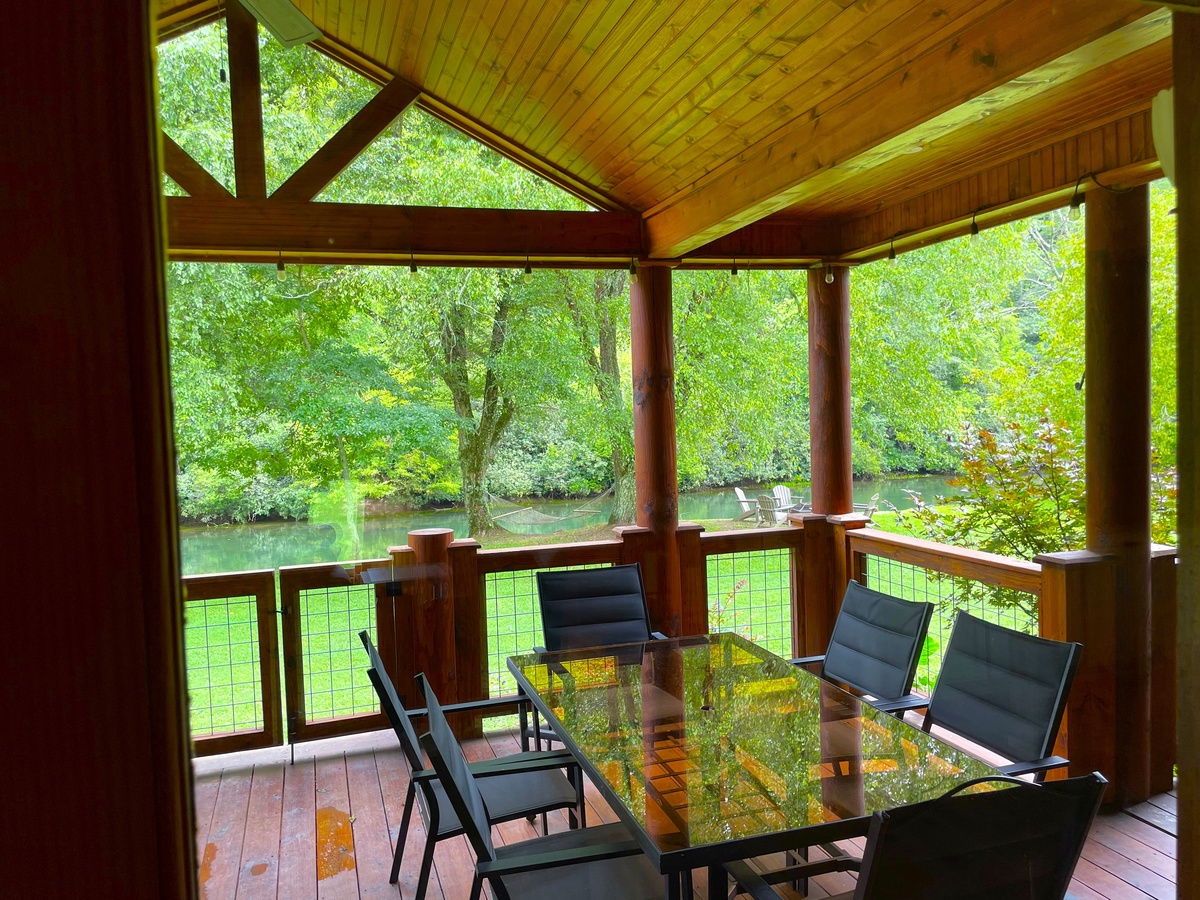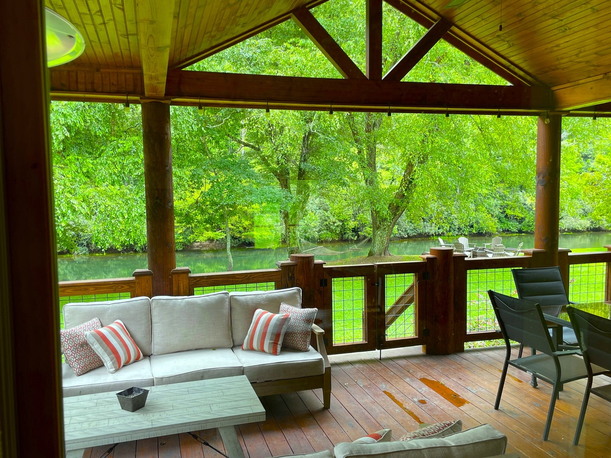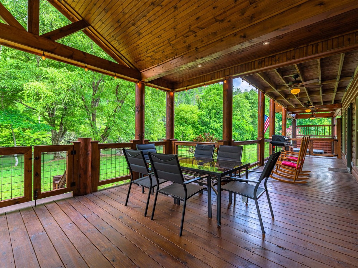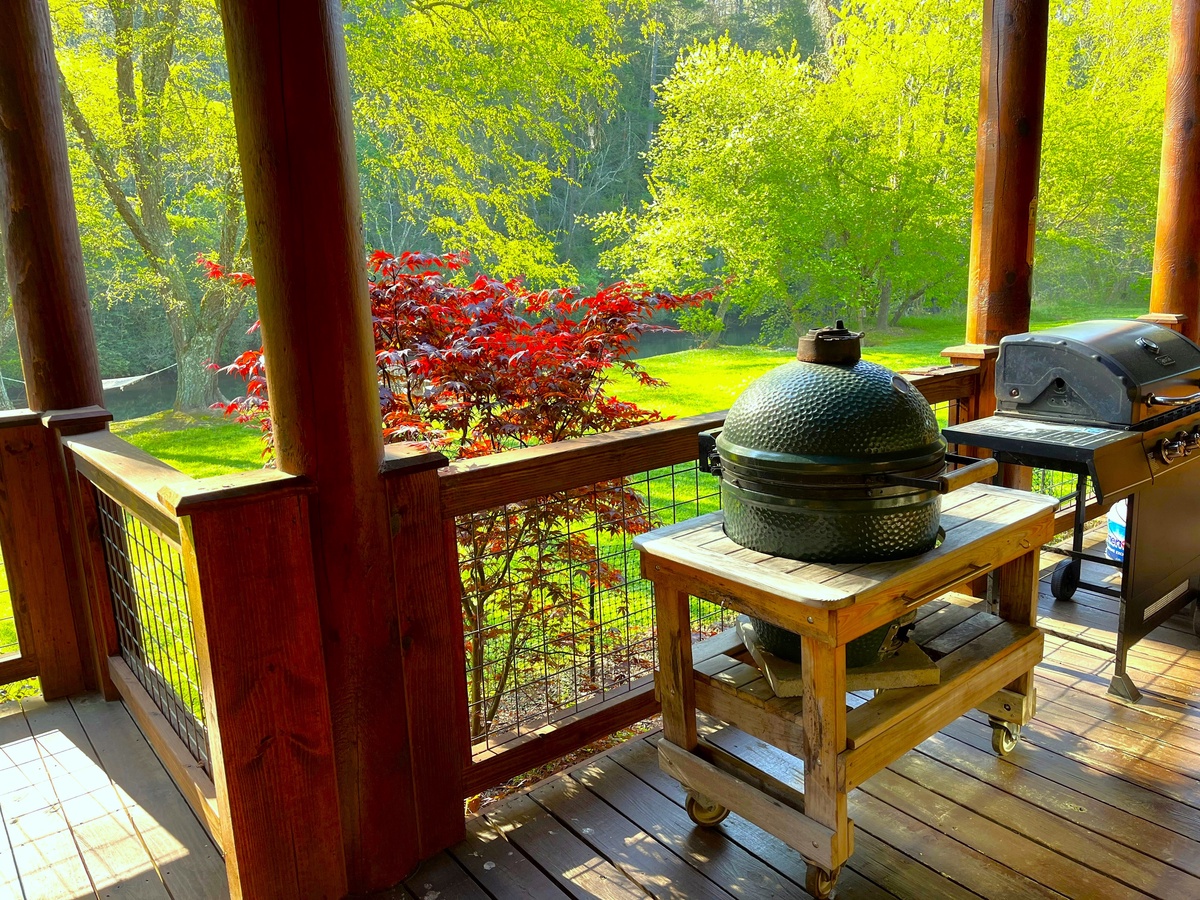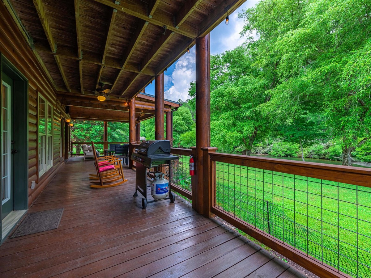 The back deck has a gas and Green Egg grill, two rocking chairs, 55”TV, dining table seating 6 and a seating area with 2 sofas, each seatting 3. Off the back deck is the hot tub with a view of the Toccoa River.