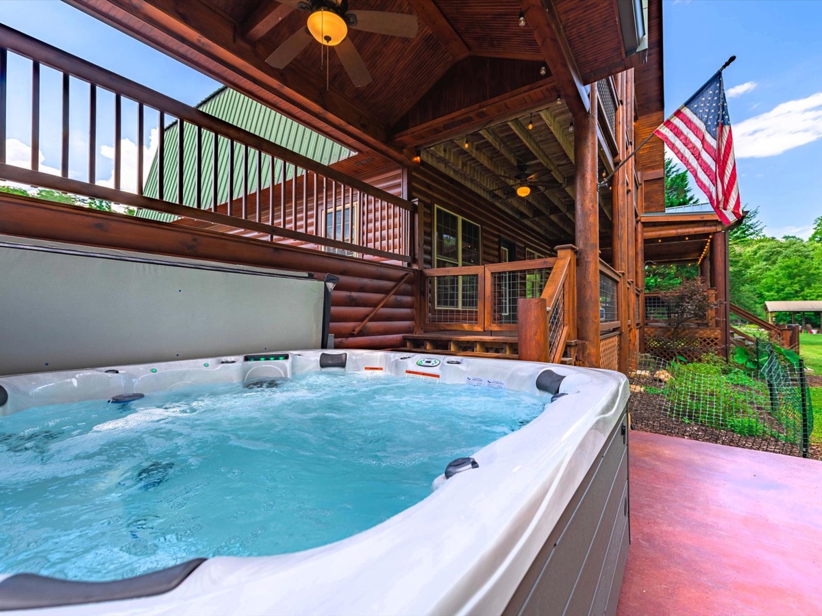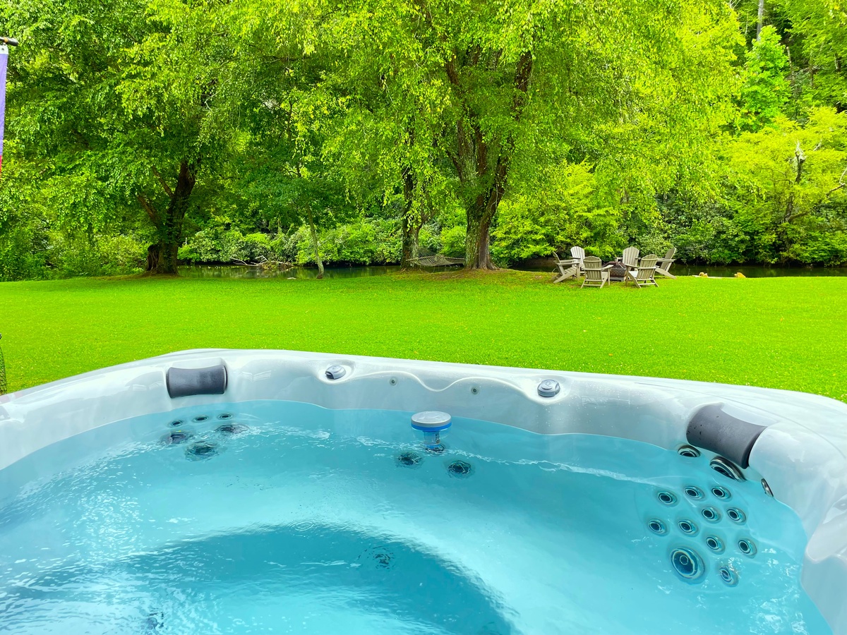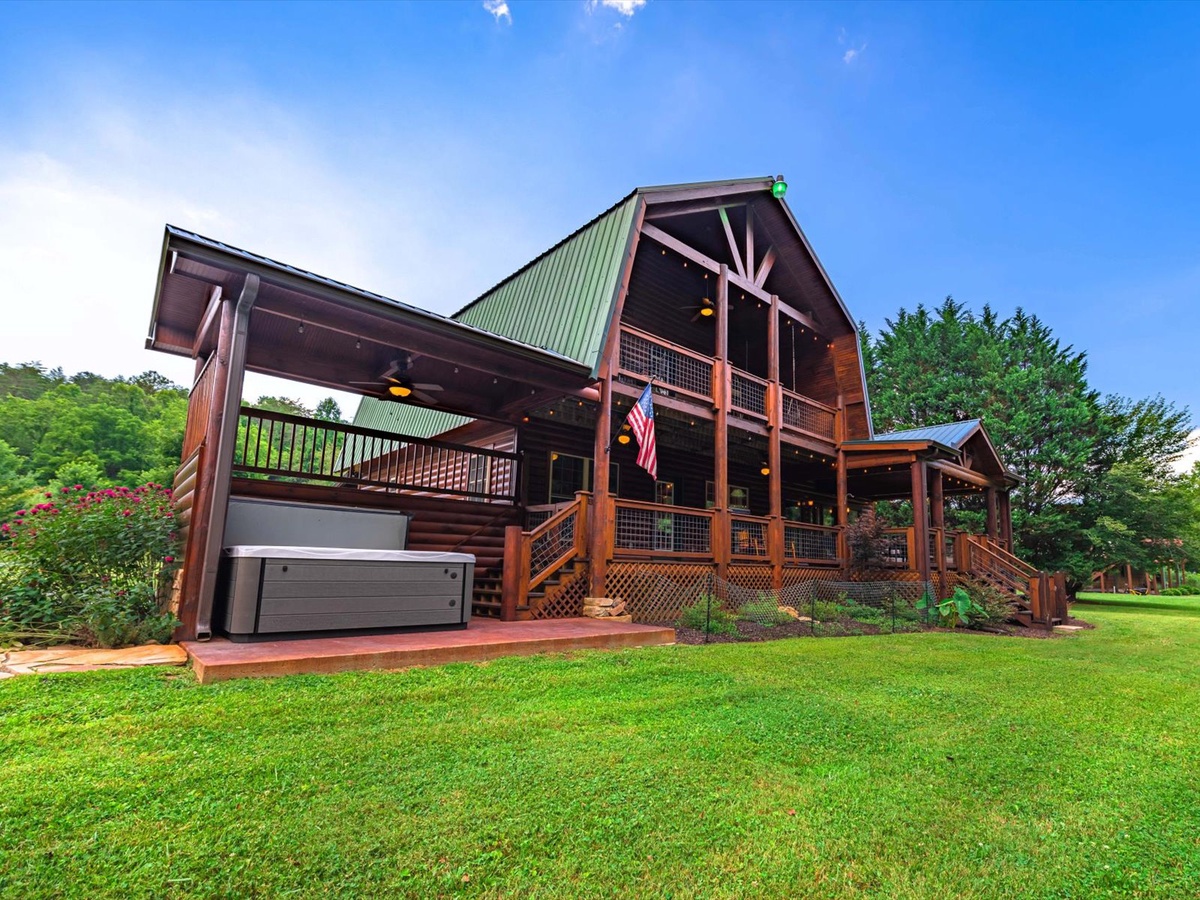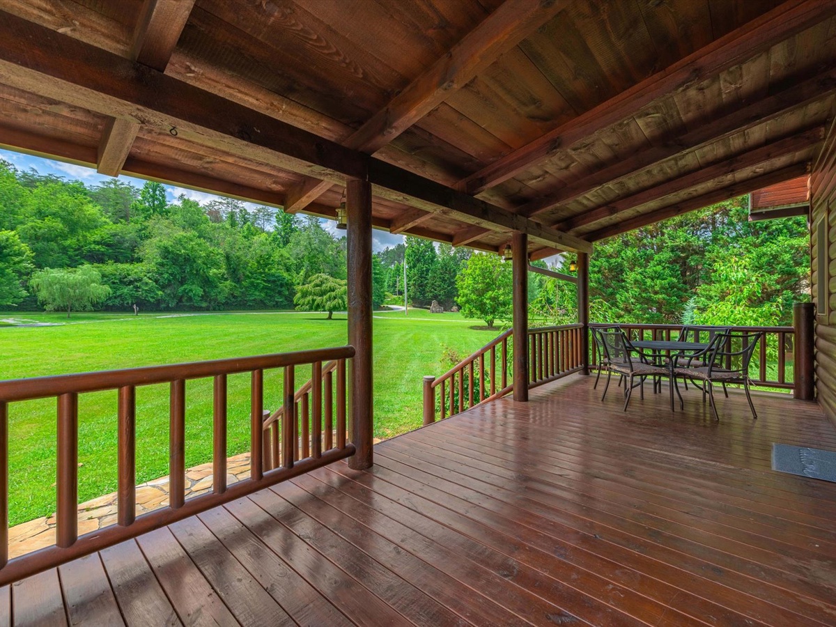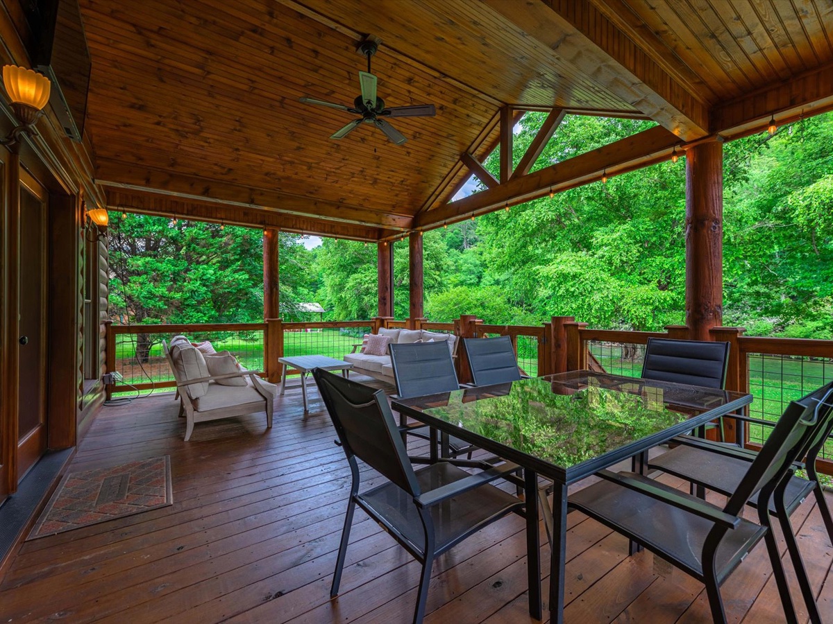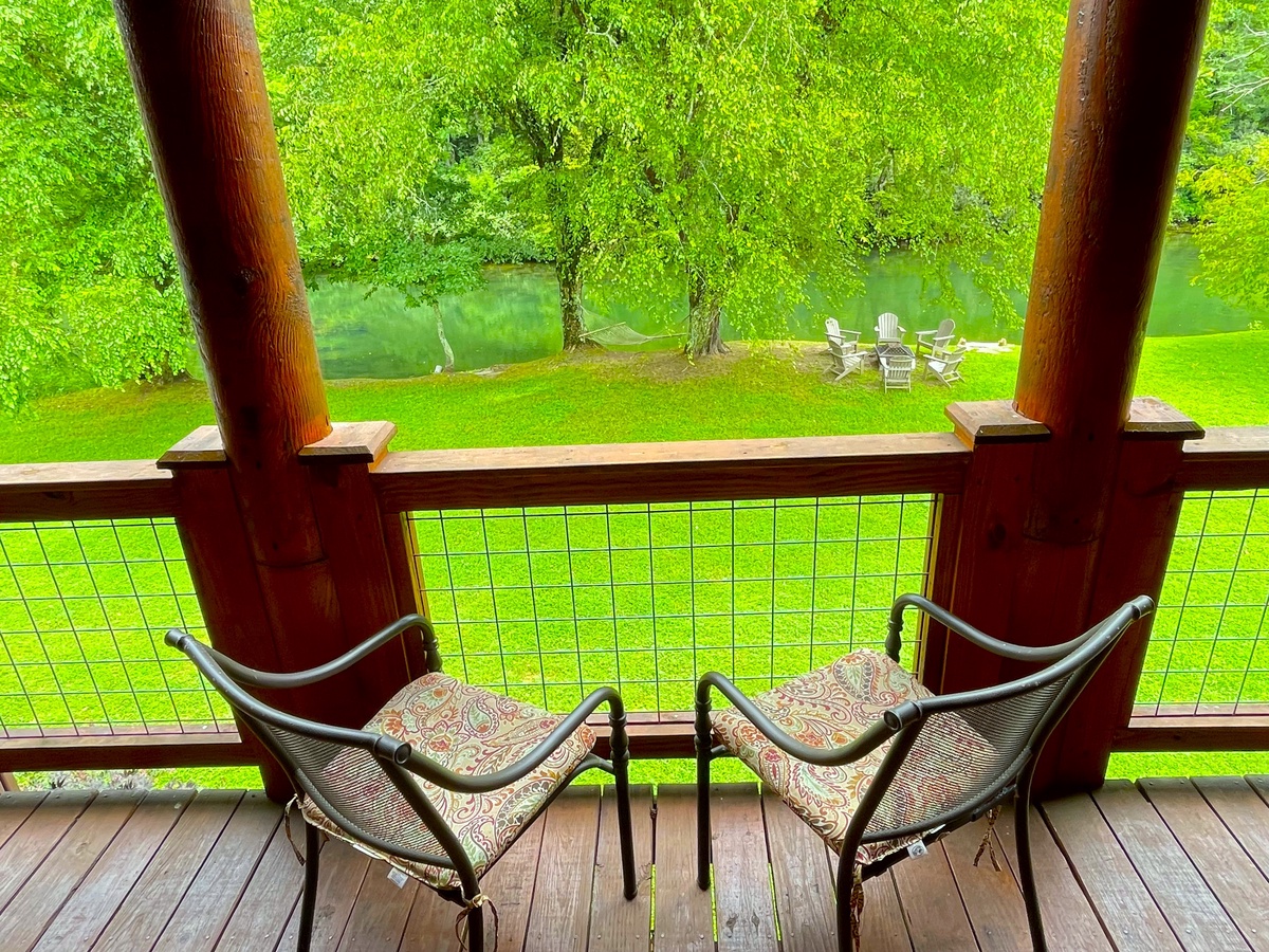 The back deck has a gas and Green Egg grill, two rocking chairs, 55”TV, dining table seating 6 and a seating area with 2 sofas, each seatting 3. Off the back deck is the hot tub with a view of the Toccoa River.
