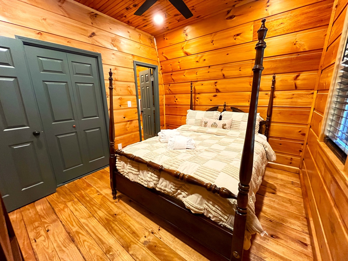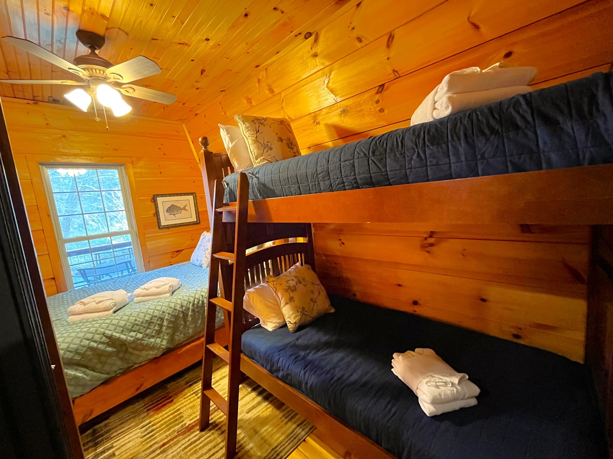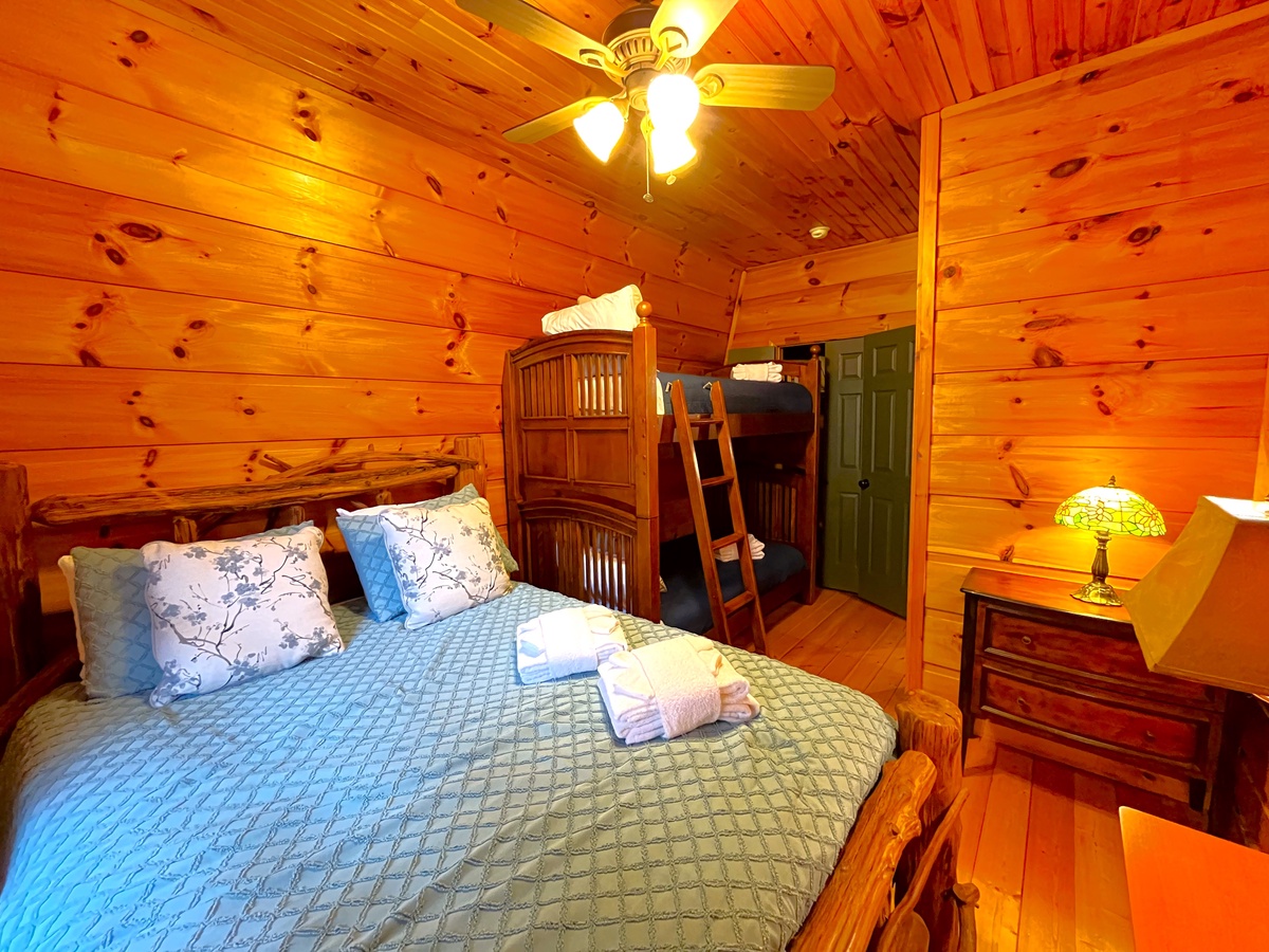 - Queen size bedroom with bunkbeds, view of the river and closet