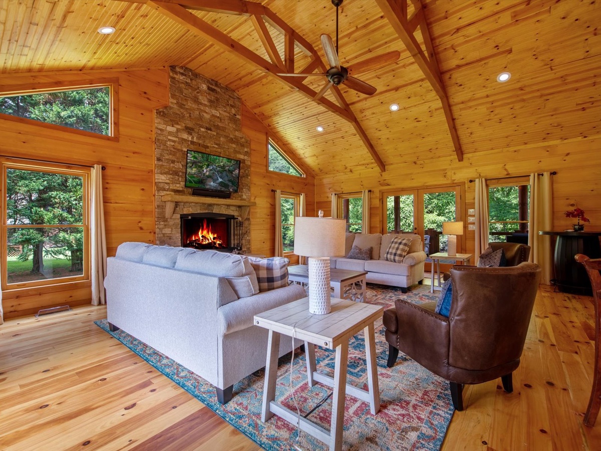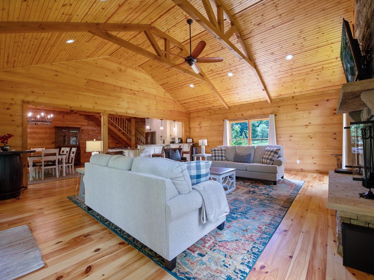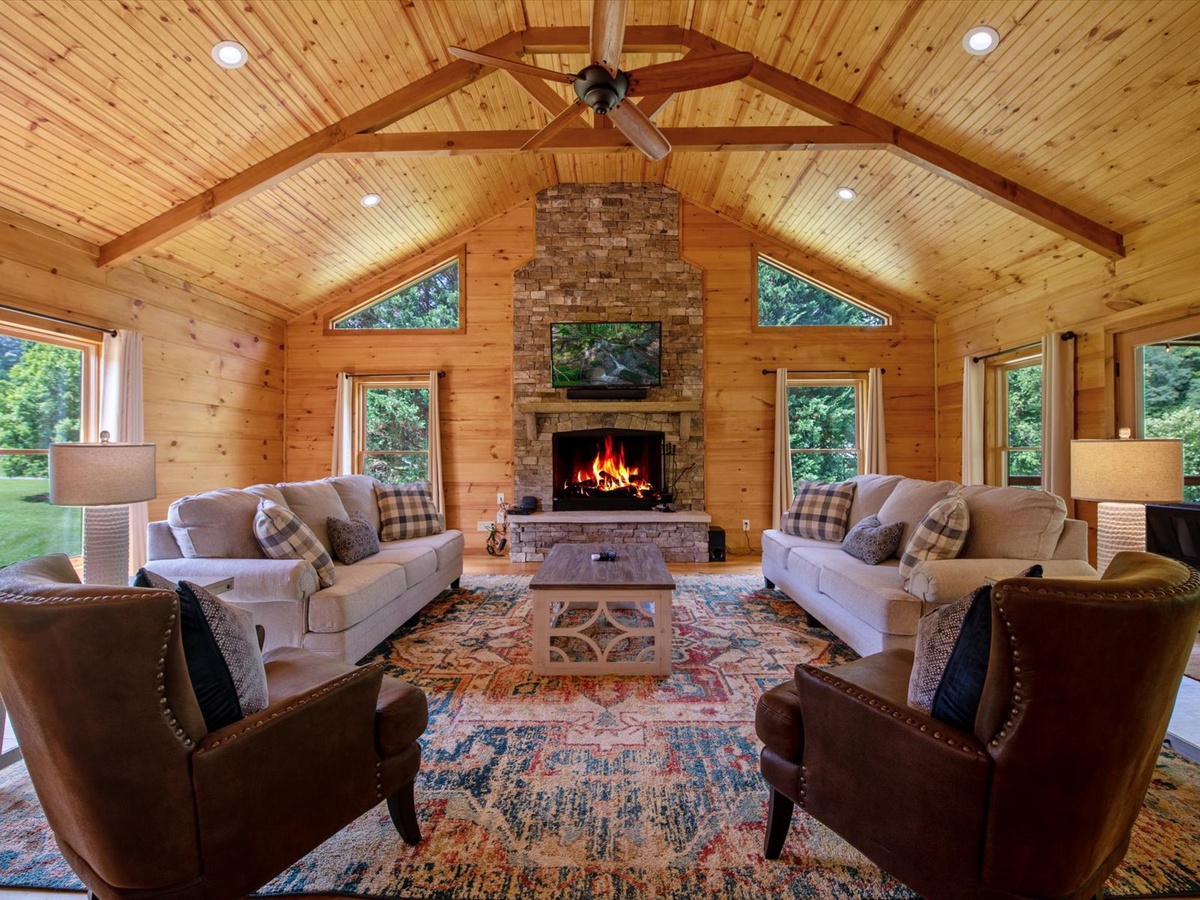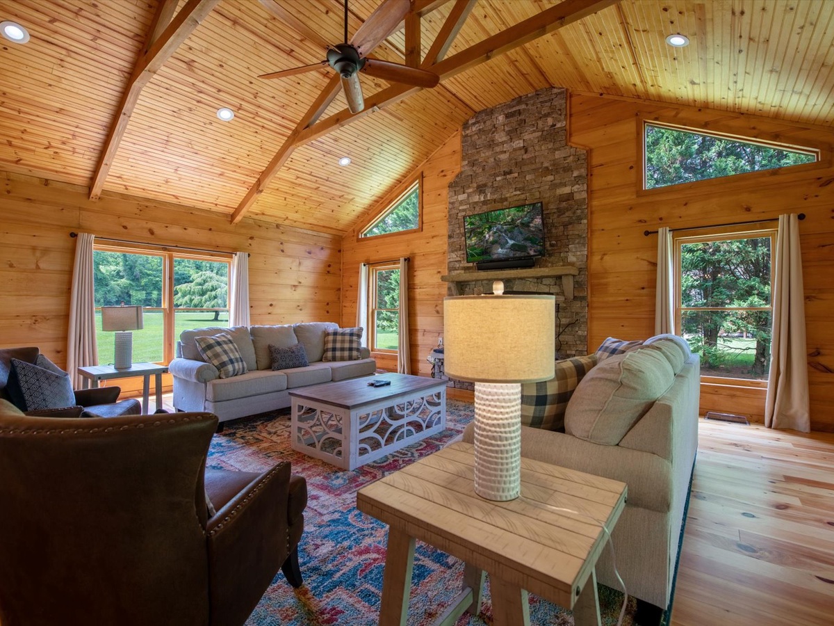 - Living room with wood burning fireplace, 55” TV, 2 sofas seating 3 each, 2 arm chairs, barrel table for 4.