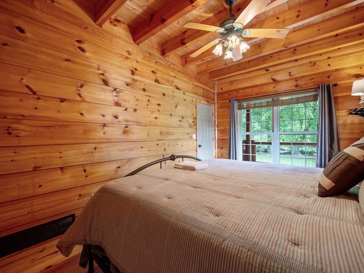 Off the dining area is the master bedroom, bathroom and laundry. Upstairs you’ll encounter a king ensuite bedroom with private bathroom, queen bedroom with attached full-size shared bathroom and queen bedroom with bunkbeds providing a view of the river. Here to is the balcony which has a porch swing and table for 4 overlooking the river and fire pit.