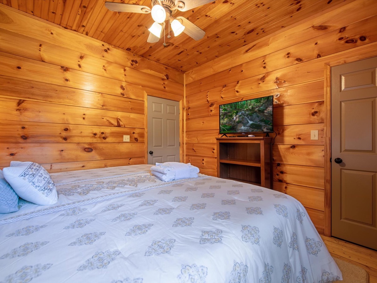- Queen size bedroom, TV, closet, view of the river and attached full-size shared bathroomÂ