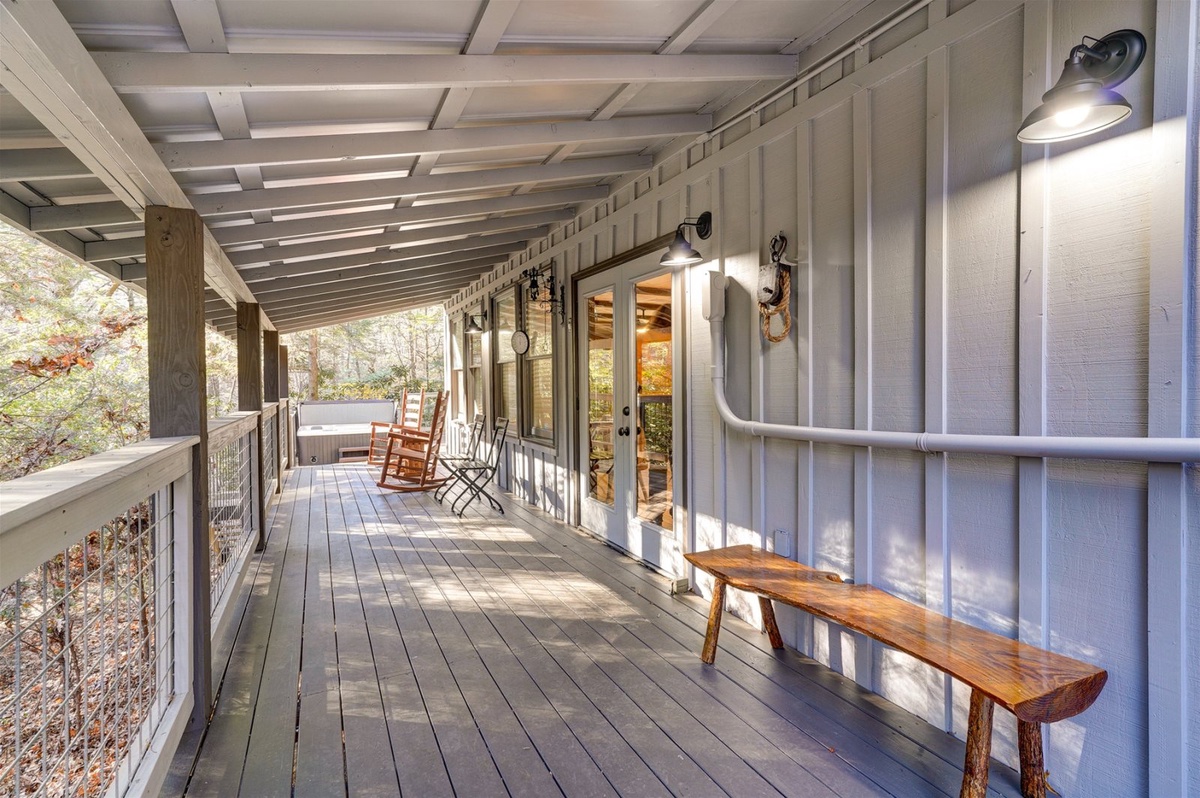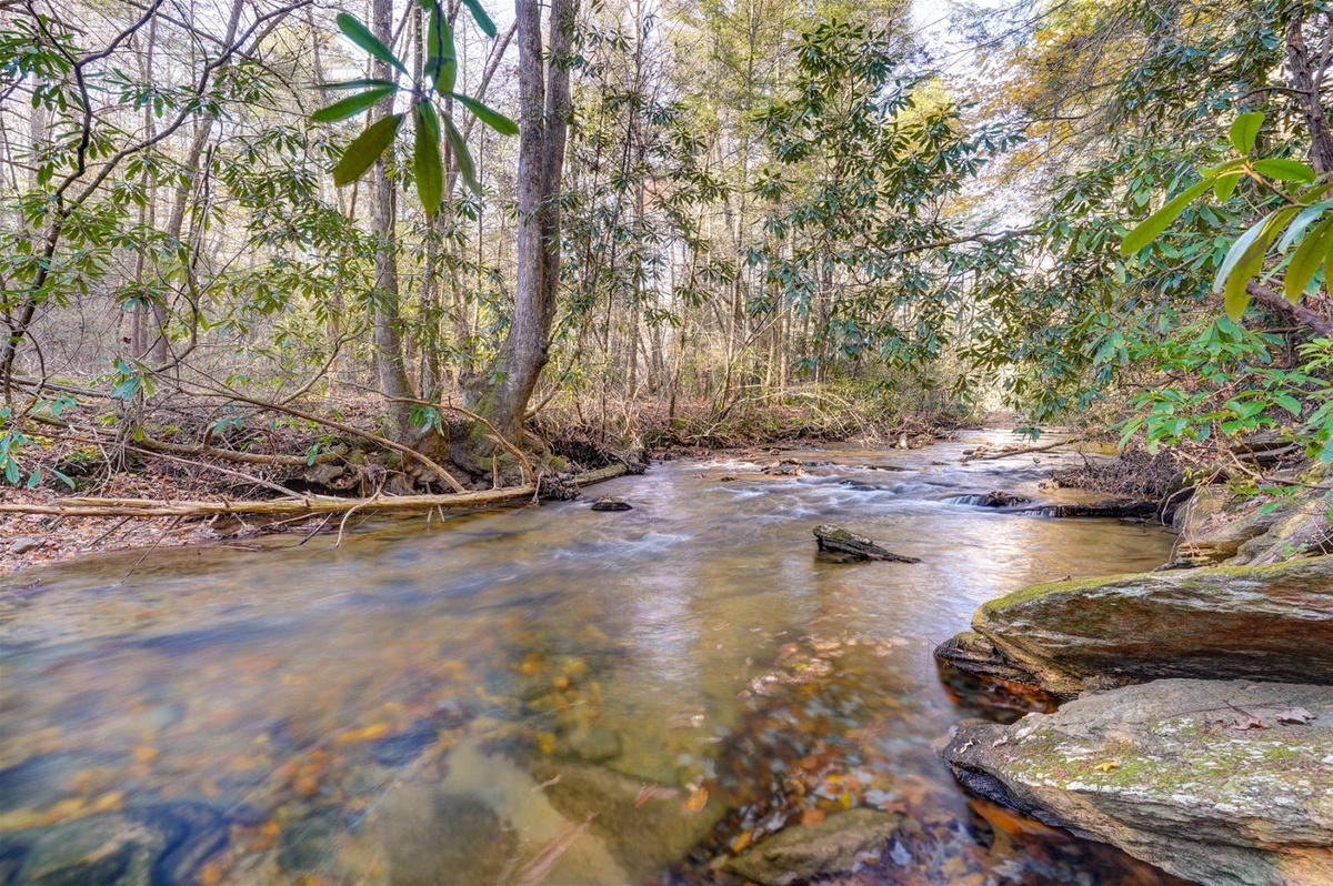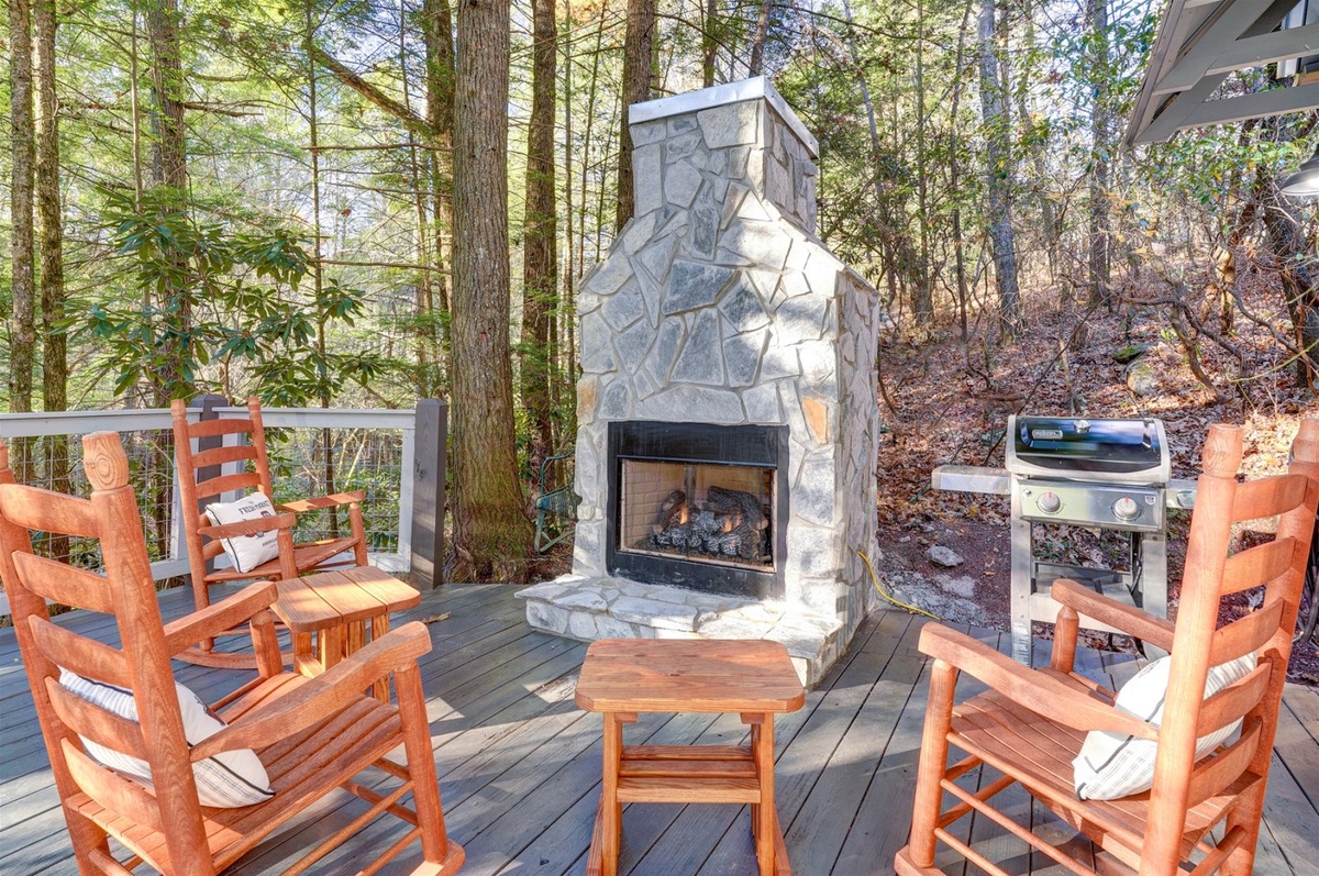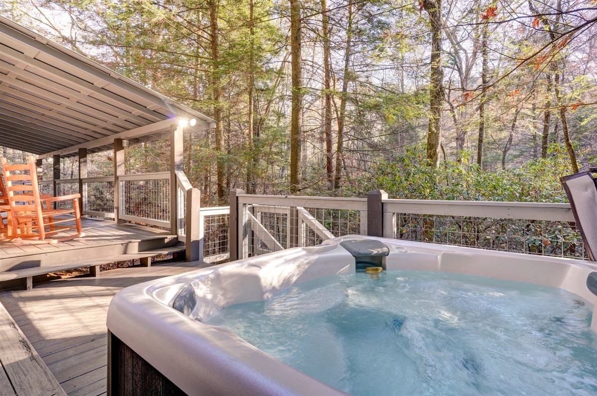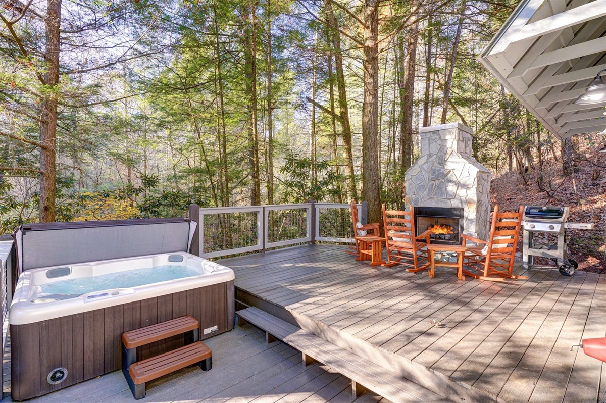 Sit for a spell in the hot tub, perched on the porch just steps from the firepit, which overlooks the creek. Inside, you will find a wonderfully appointed kitchen with granite countertops, stainless steel appliances, and all the dinner and cookeware you could ask for. In the living room, relax in the dual reclining leather sofa for a movie on the flat screen TV while the gas fireplace creates a wonderful ambience for relaxation. Upstairs, you will find a master suite with queen bed and a full bath, the perfect place to rest after a fun day in Blue Ridge. Don't forget to open the creekside windows upstairs, and let the peaceful sounds of Fightingtown Creek help you drift off to sleep.