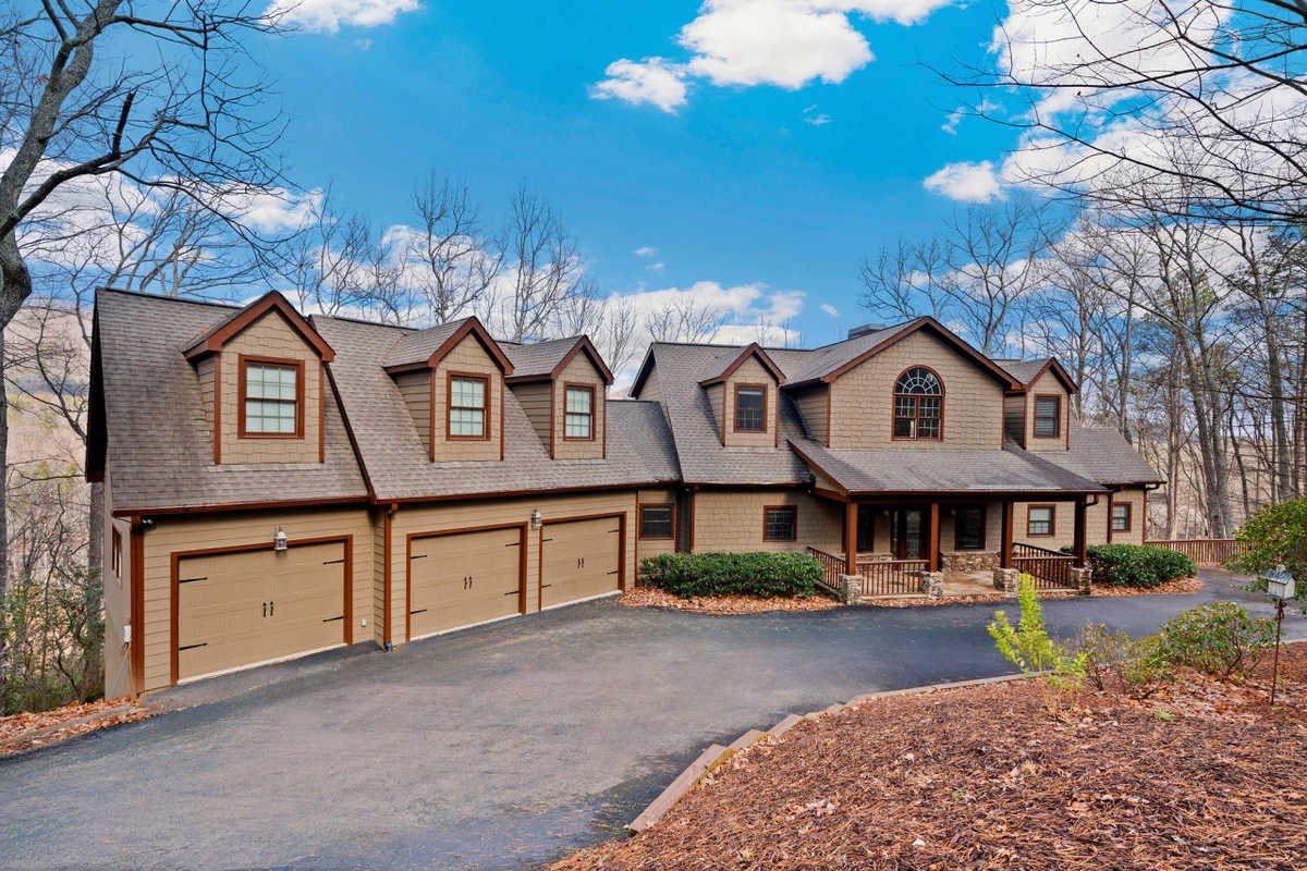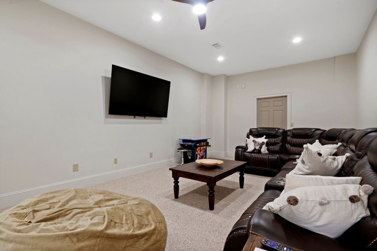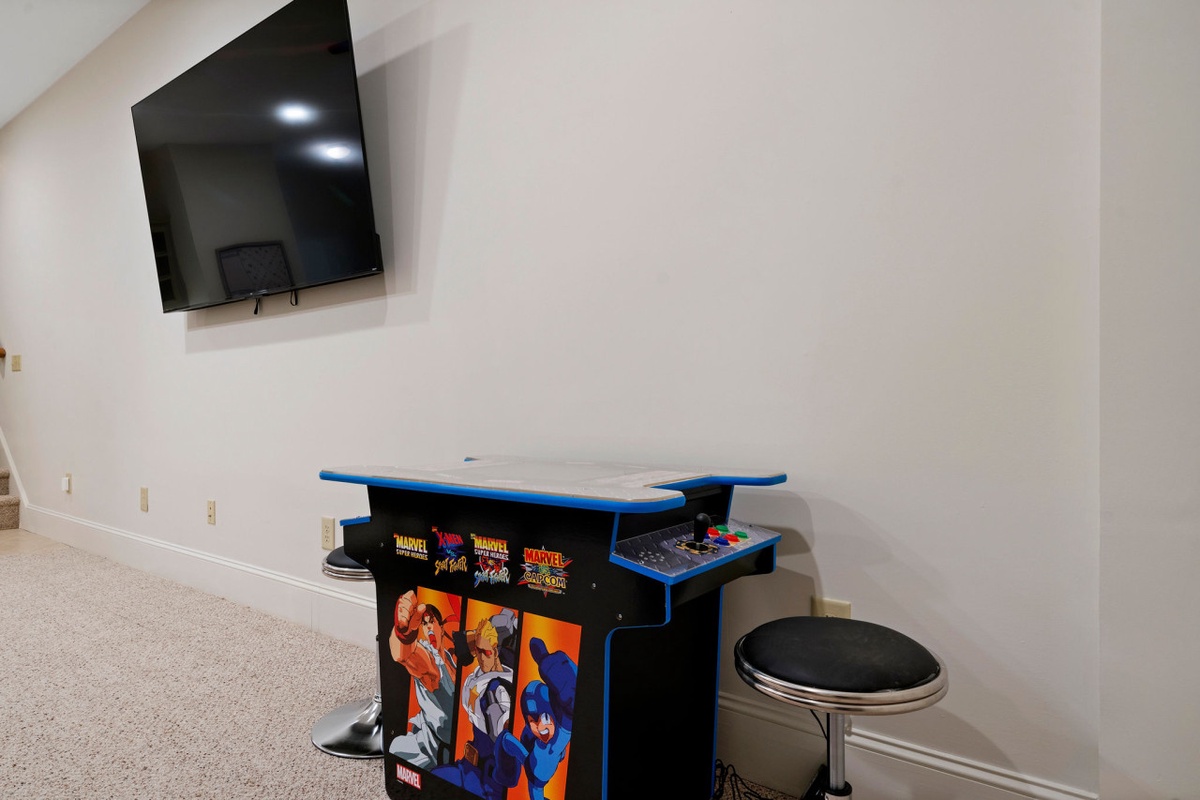 Downstairs, the terrace level is designed for fun and relaxation, featuring a spacious game lounge with arcade machine, wet bar, large sectional sofa, and smart TV. Two additional bedrooms, each with private porches and ensuite bathrooms, offer comfort and privacy for larger groups. With multiple living spaces, five bedroom suites, dual fireplaces, and lake views from nearly every room, Thrush Turn Manor is an ideal mountain gathering place for family reunions, couples retreats, or memorable celebrations.