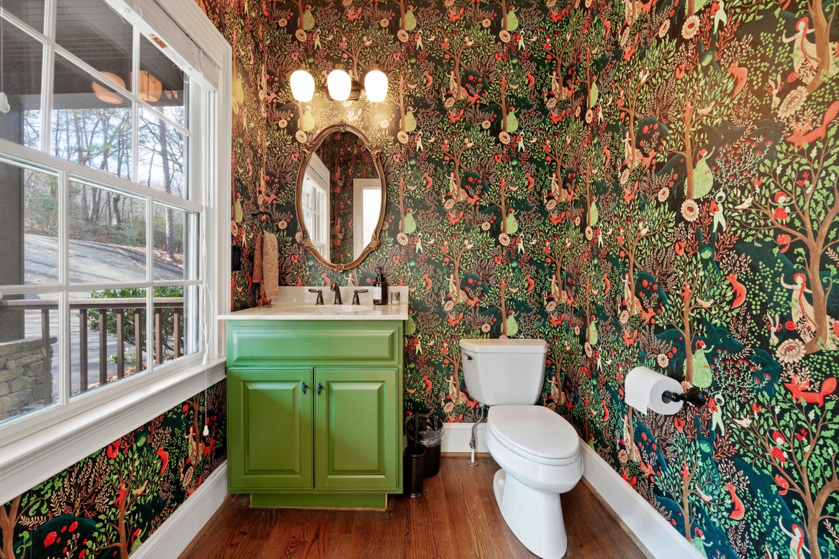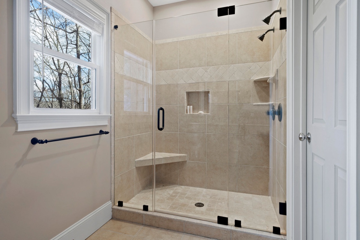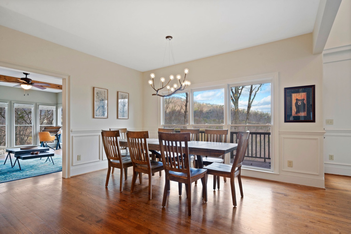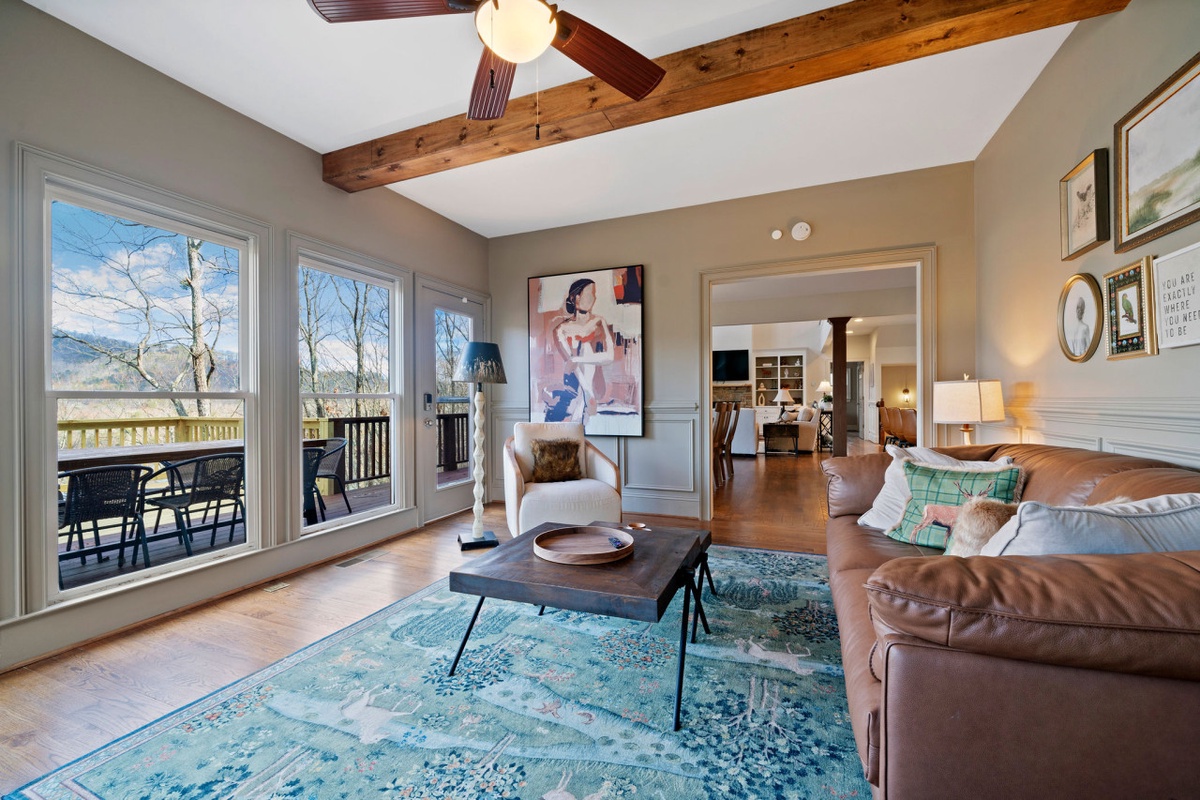 Downstairs, the terrace level is designed for fun and relaxation, featuring a spacious game lounge with arcade machine, wet bar, large sectional sofa, and smart TV. Two additional bedrooms, each with private porches and ensuite bathrooms, offer comfort and privacy for larger groups. With multiple living spaces, five bedroom suites, dual fireplaces, and lake views from nearly every room, Thrush Turn Manor is an ideal mountain gathering place for family reunions, couples retreats, or memorable celebrations.