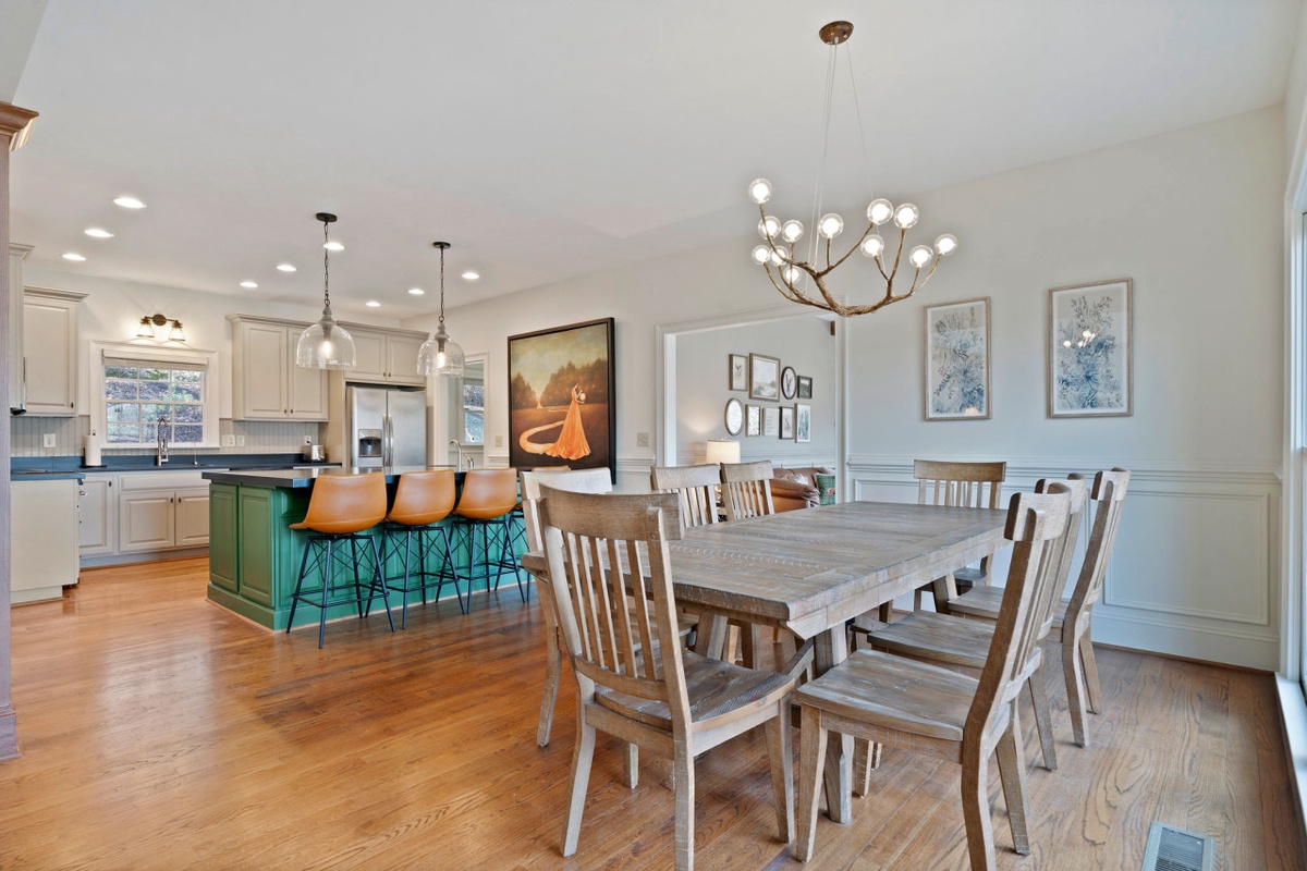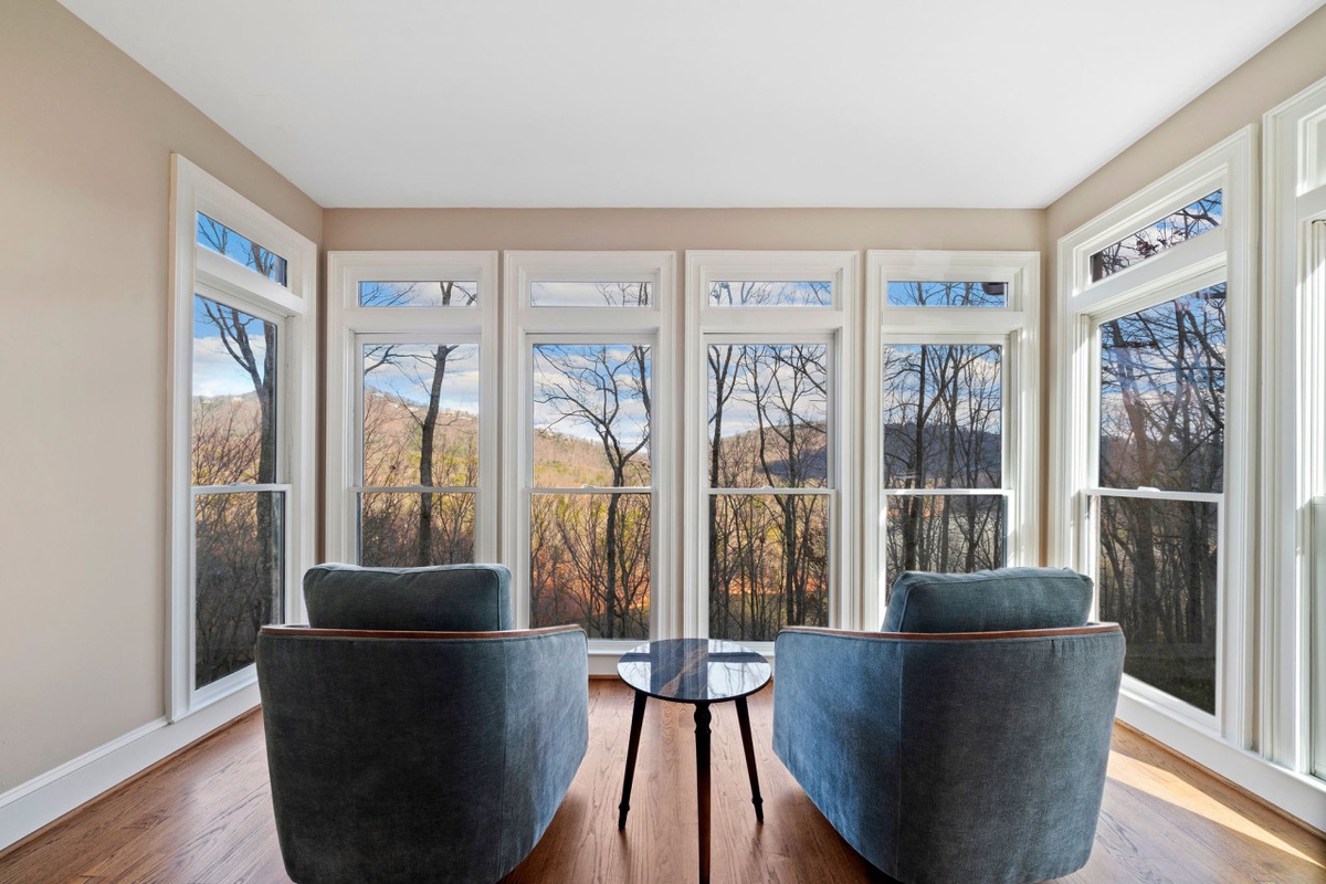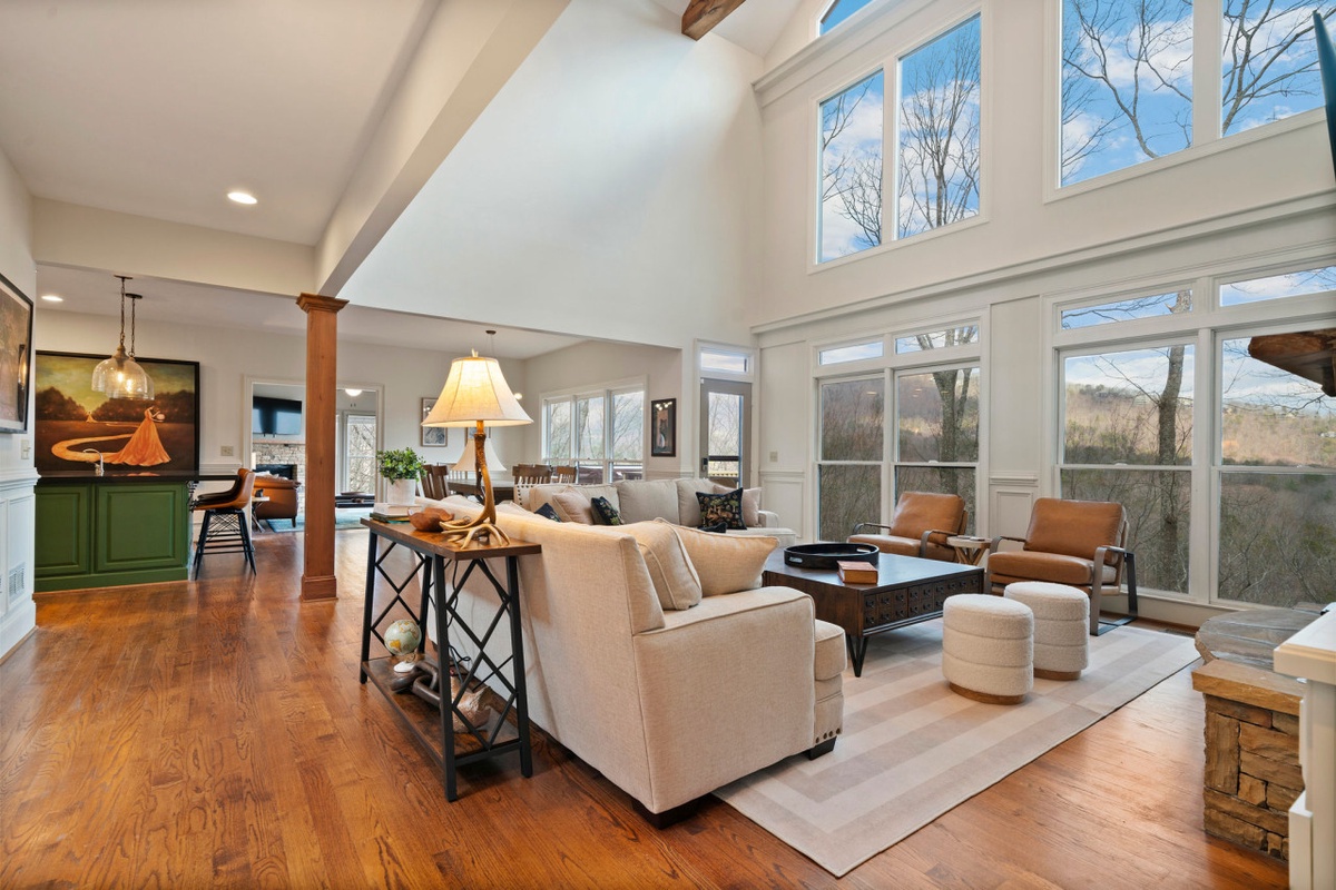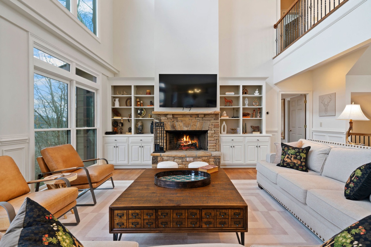 Perched above a serene private cove of Lake Petit, Thrush Turn Manor offers one of Big Canoe’s most breathtaking settings. From nearly every room, guests enjoy sweeping views of shimmering water and the Blue Ridge Mountains beyond. As you step inside, you're greeted by a dramatic three-story wall of windows in the Great Room, allowing natural light and scenery to fill the space. The open-concept main level brings everyone together with a warm stone wood-burning fireplace, lake-view living area, and a large chef’s kitchen with island seating, stainless steel appliances, and easy access to the dining room and second gathering space with its own fireplace.