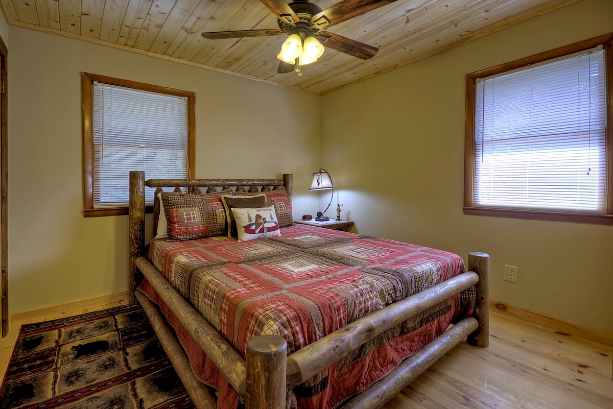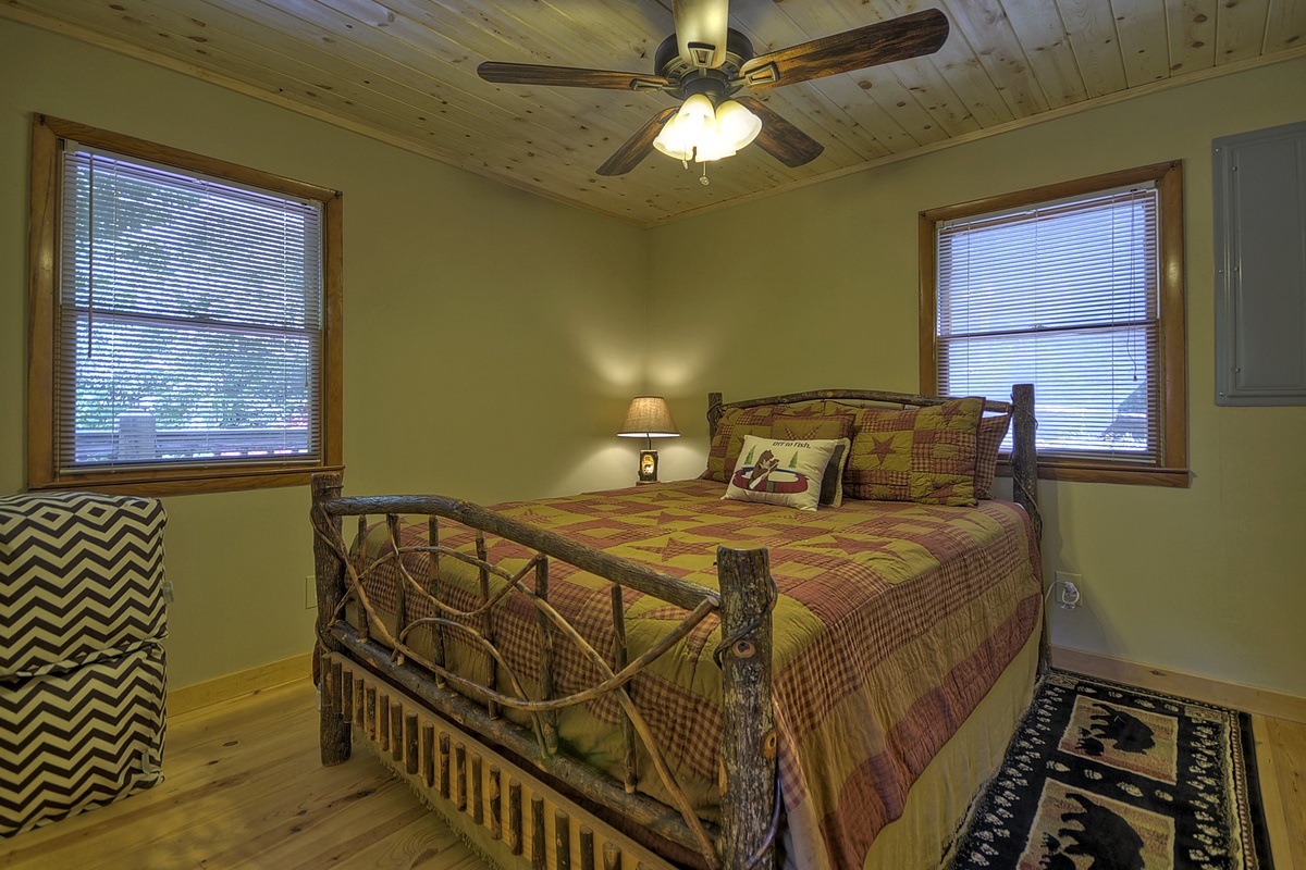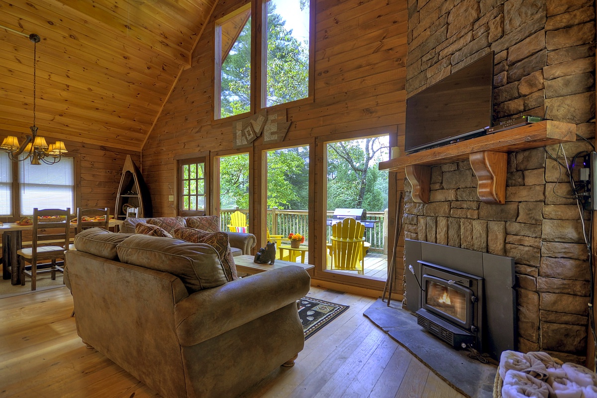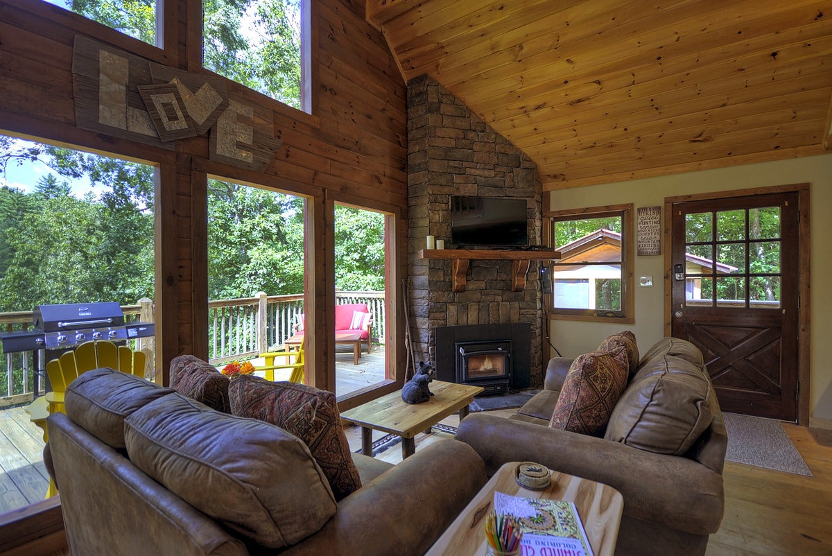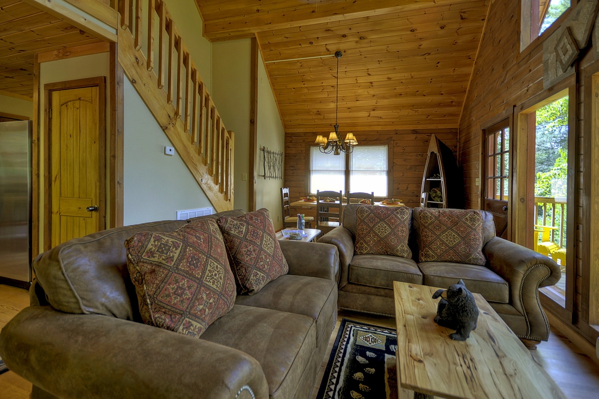 The entry level offers an open floor plan including a spacious and fully equipped kitchen, a living room with a 42" Flat Panel TV and an adjacent dining area with a beautiful handcrafted wooden table that seats 6. Just off the living room area, you can access the outdoor deck perfect for grilling out, or reading a book while you listen to the sounds of the Toccoa River.