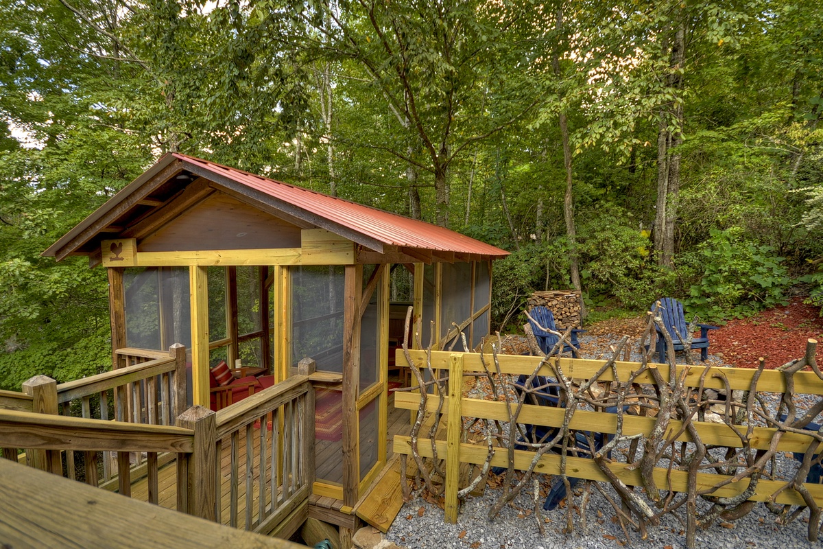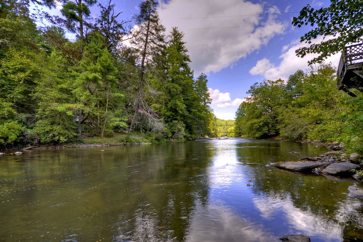 Come back outside to the wonderful and convenient screened-in hot tub on the porch. Soak your worries away while you listen to some relaxing tunes, or watch your favorite TV show on the 40" Flat Panel TV. Don't forget the fire pit where roasting marshmallows and hotdogs is a must. Enjoy a private deck on the scenic Toccoa River, perfect for relaxing by the water! Please note that the deck is conveniently located just across the road from the cabin. Access is easy, with a short drive from the cabin.