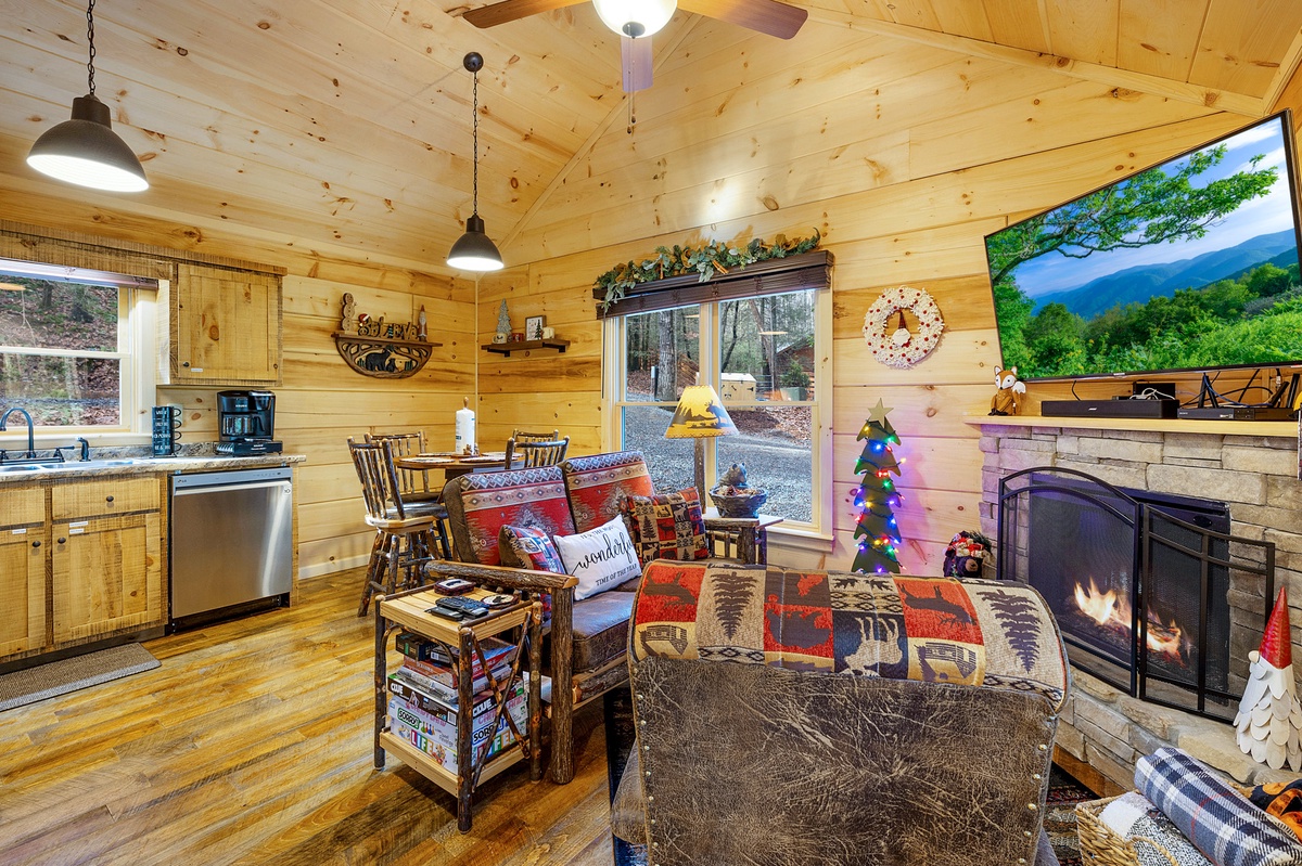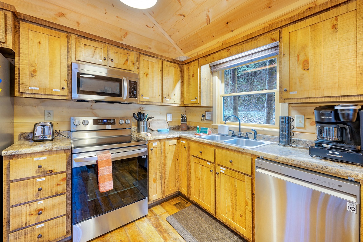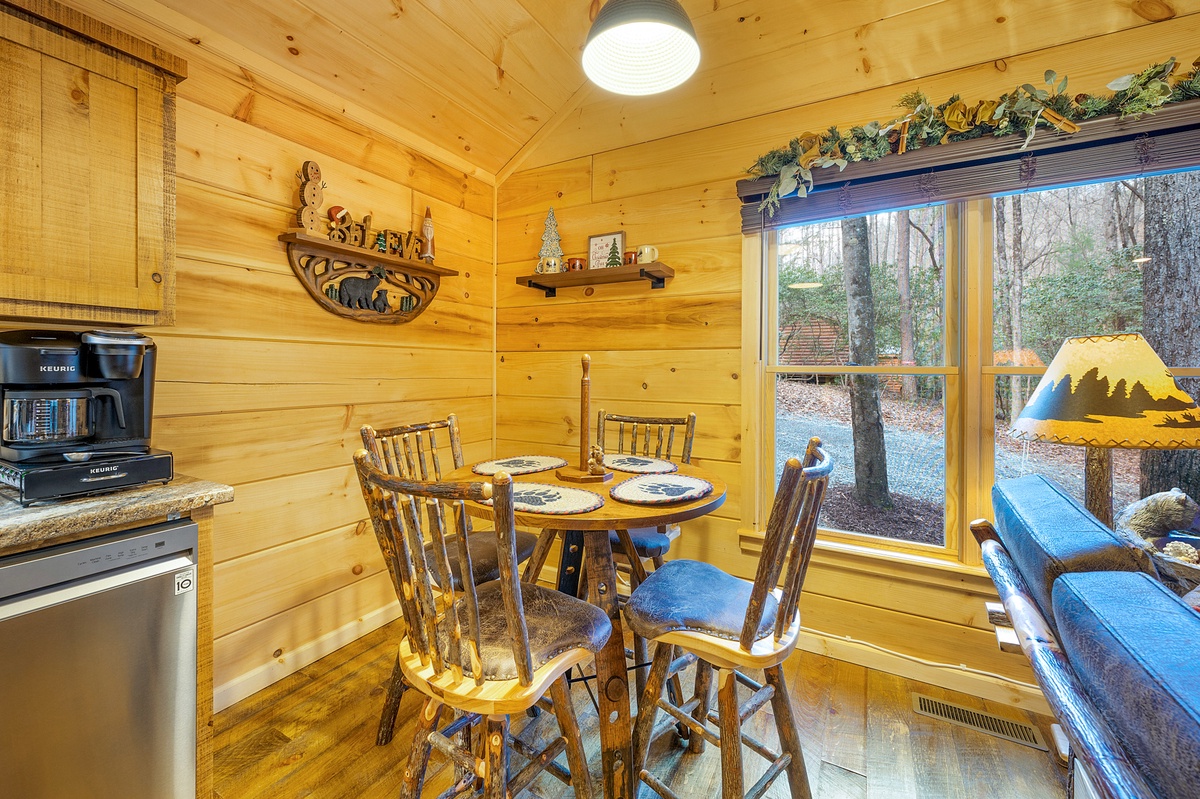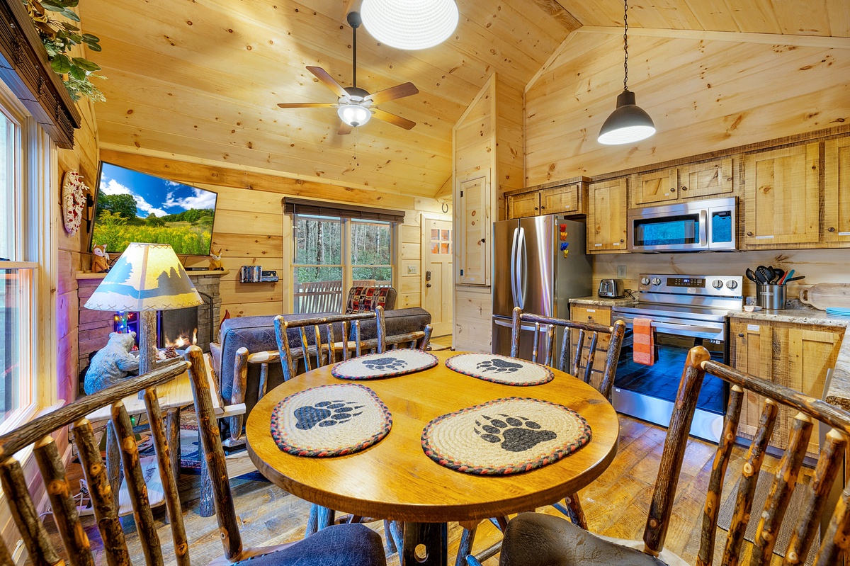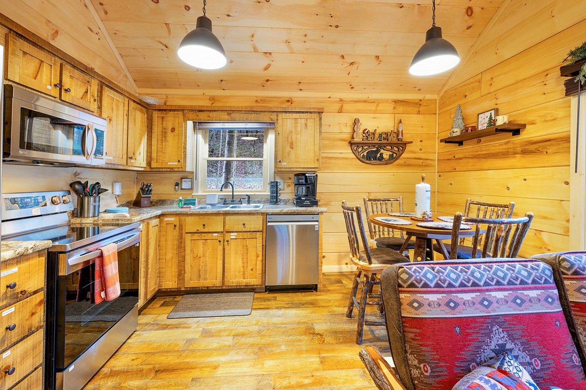 After a day in town, the peaceful atmosphere of Trail Side Retreat will be much appreciated. The living room is open and inviting, boasting hardwood floors, and a stone gas fireplace. Curl up in front of the fireplace with a good book or flip on the 55”TV and watch shows and ball games. The fully equipped kitchen provides all the essentials you’ll need for preparing meals in the comfort of your cabin. The dining area seating 4 can easily seat the whole family for a nice mountain inspired meal.