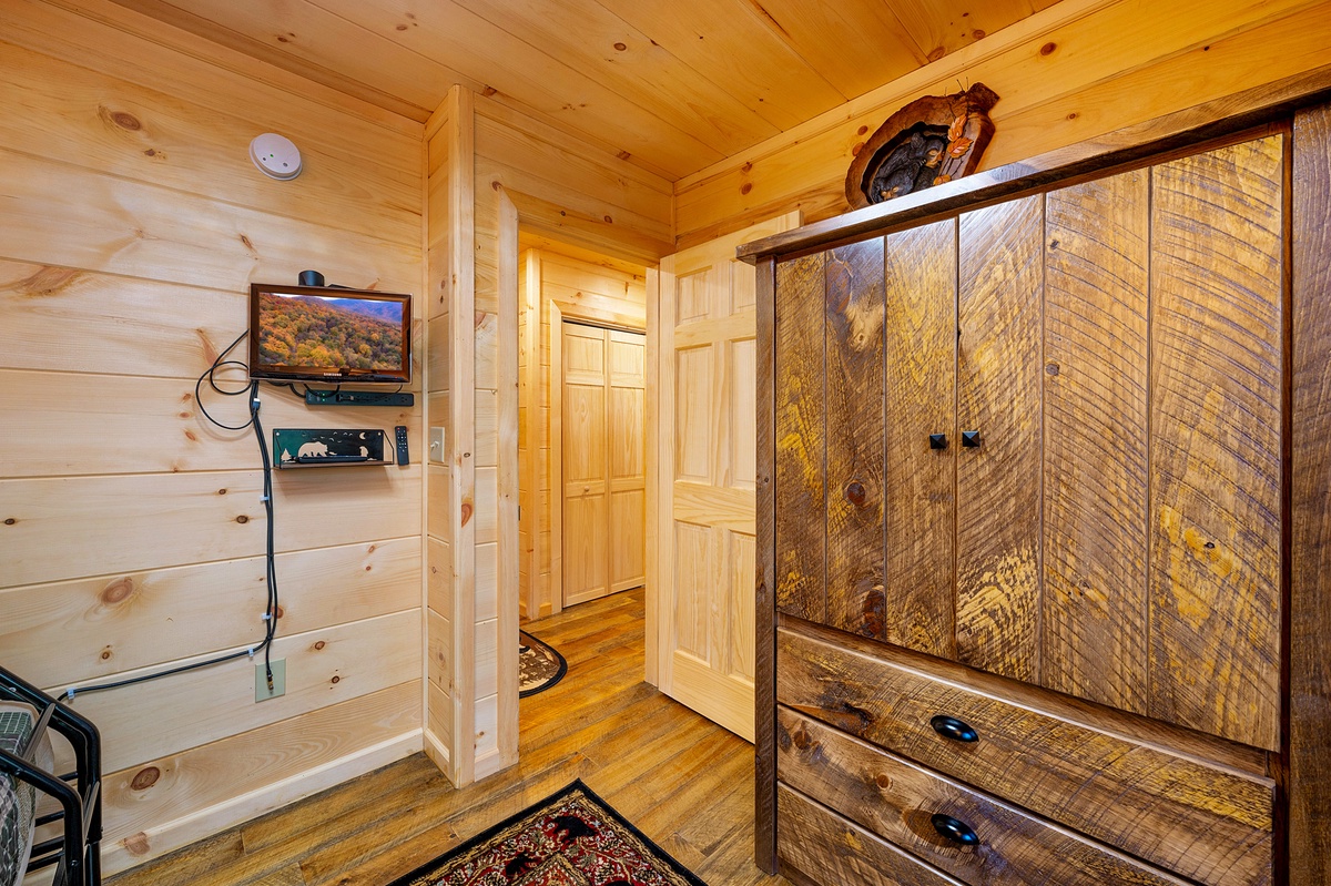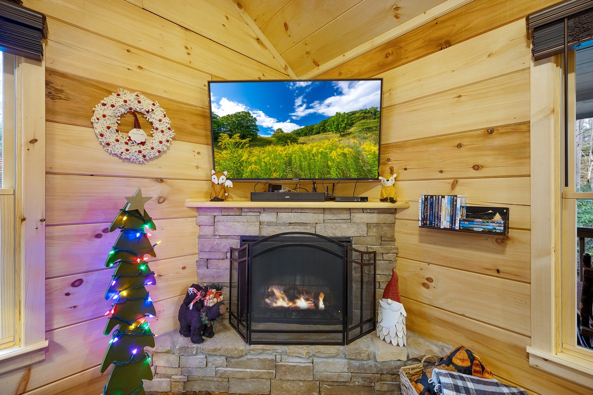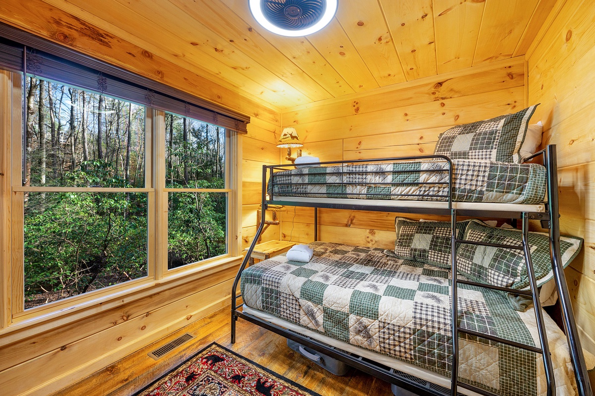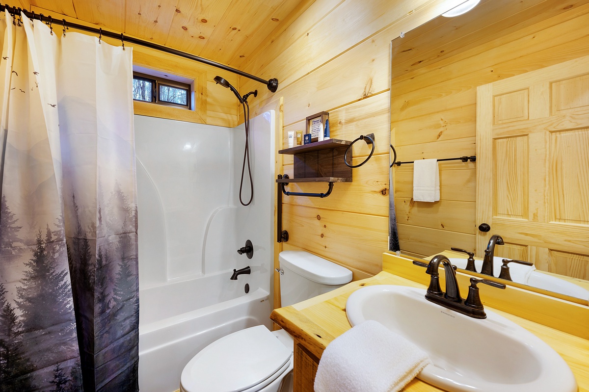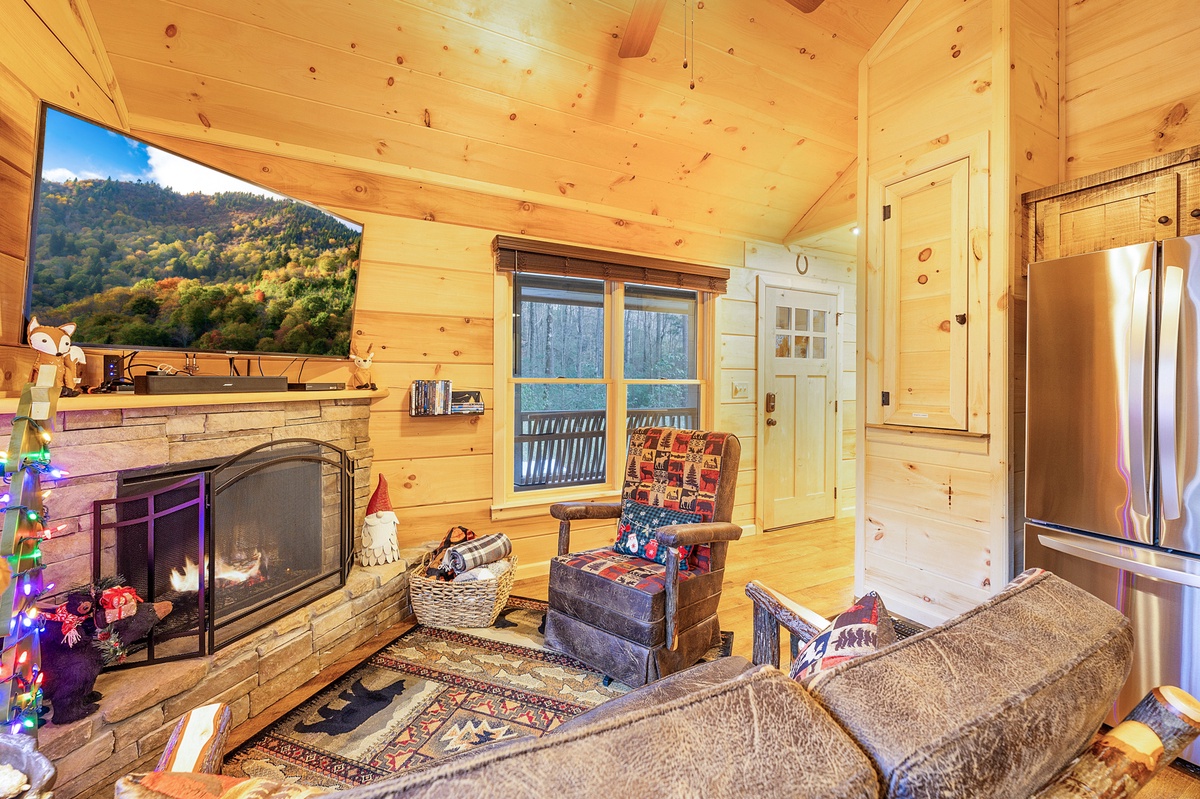 After a day in town, the peaceful atmosphere of Trail Side Retreat will be much appreciated. The living room is open and inviting, boasting hardwood floors, and a stone gas fireplace. Curl up in front of the fireplace with a good book or flip on the 55”TV and watch shows and ball games. The fully equipped kitchen provides all the essentials you’ll need for preparing meals in the comfort of your cabin. The dining area seating 4 can easily seat the whole family for a nice mountain inspired meal.