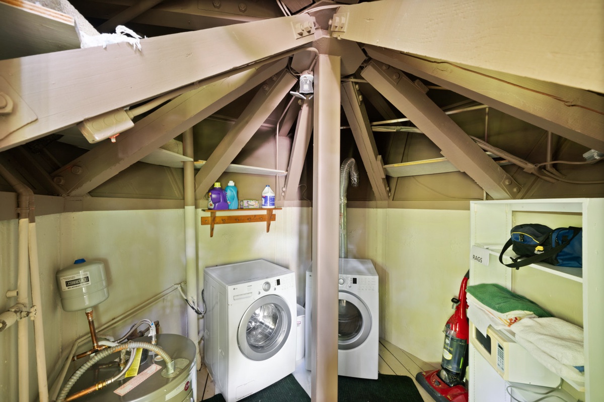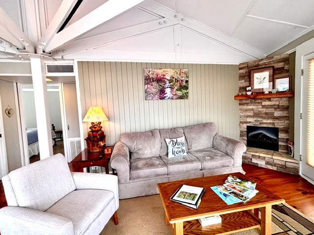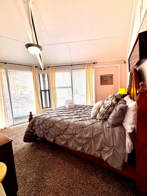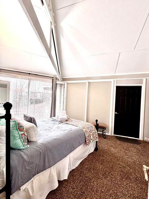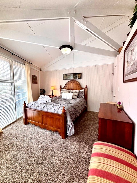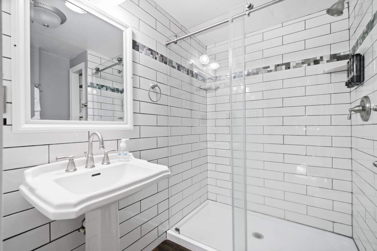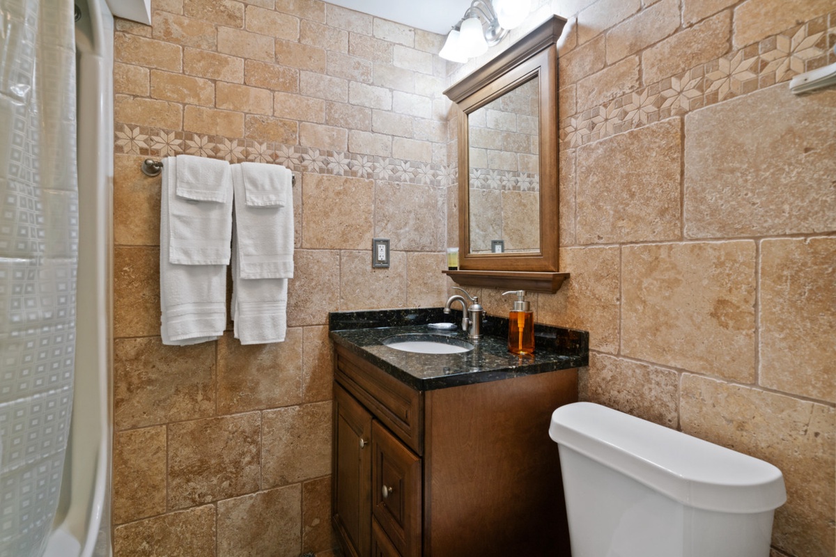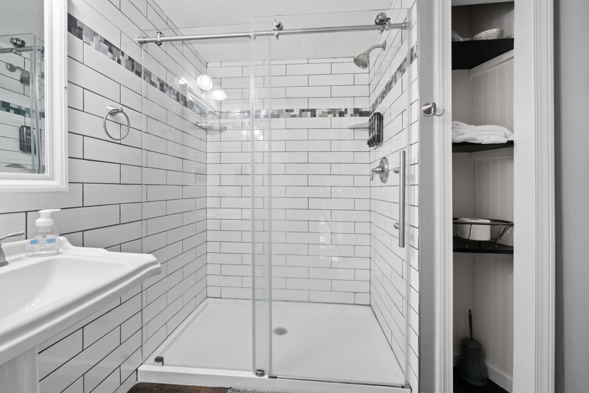 Step outside to the wraparound deck, where mornings are made for sipping coffee in the crisp mountain air and evenings call for grilling, stargazing, and connection. Inside, two spacious bedrooms offer restful escapes—each with access to updated full bathrooms. The primary ensuite features beautiful subway tile, a glass-enclosed walk-in shower, vanity storage, and thoughtful built-in shelving. The guest bathroom includes a tub/shower combo with elegant tile accents. With vaulted ceilings, airy beams, and woodland views from nearly every window, this home effortlessly blends nature and comfort.