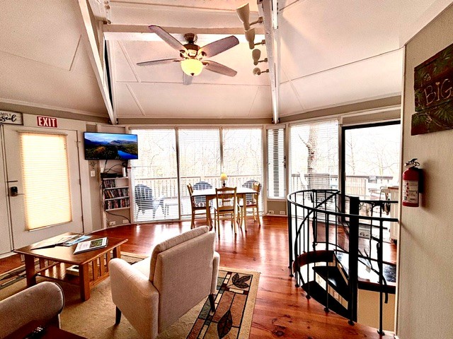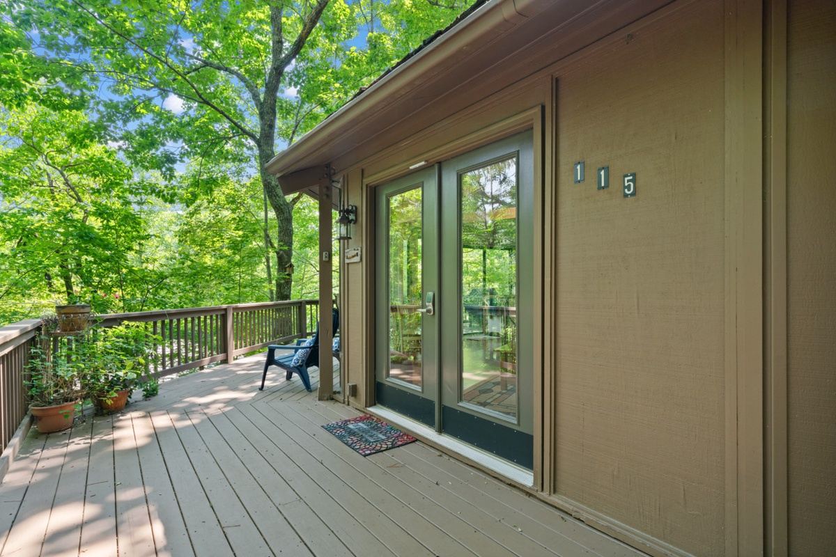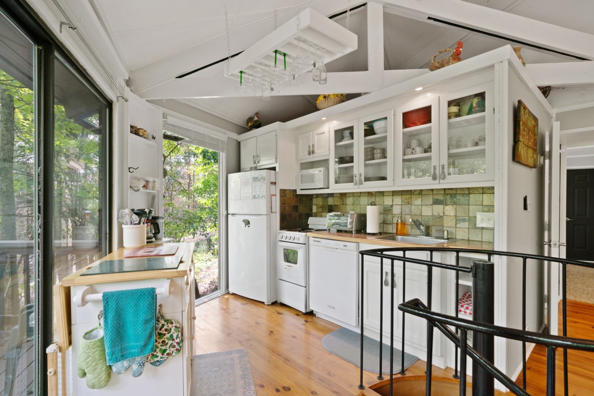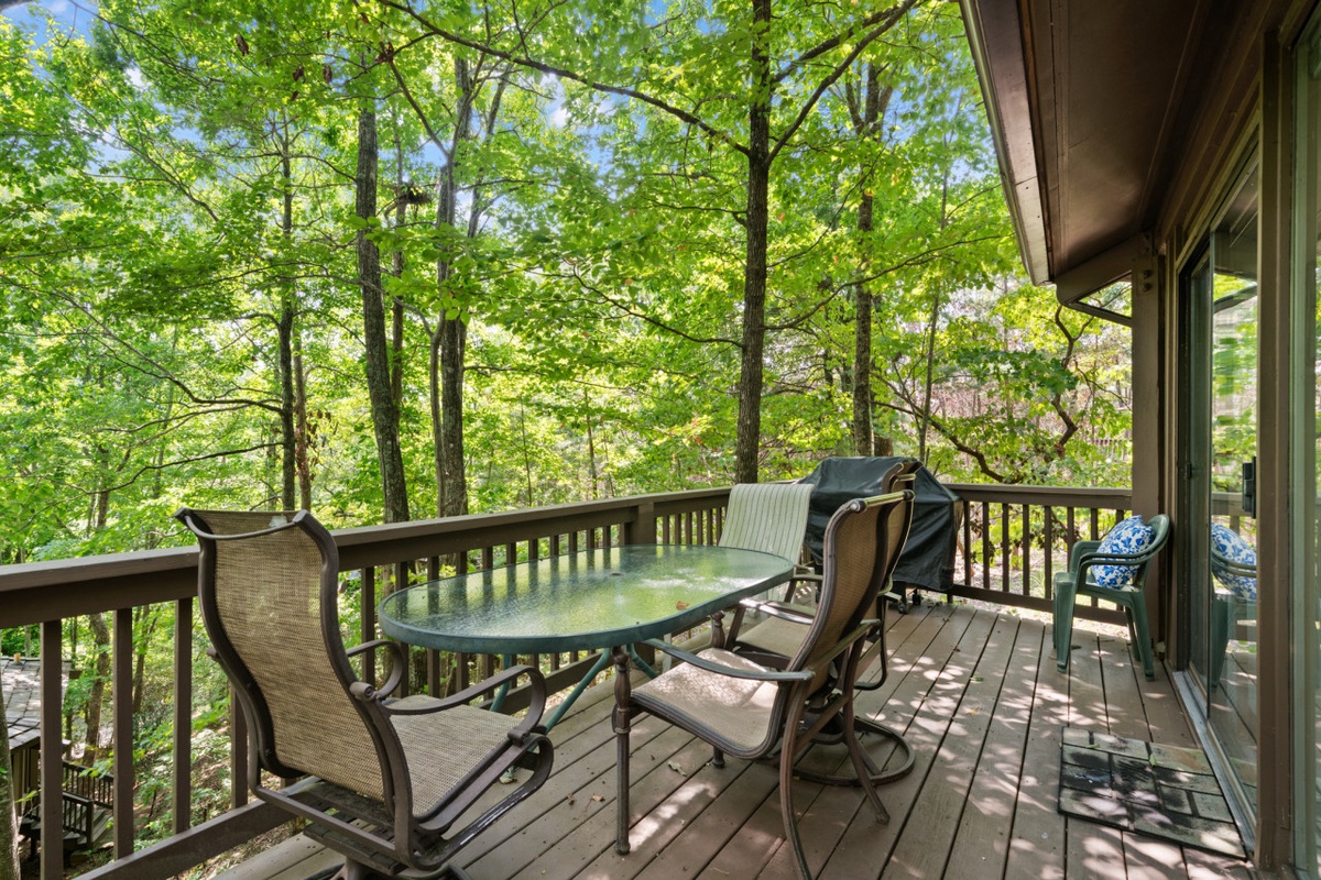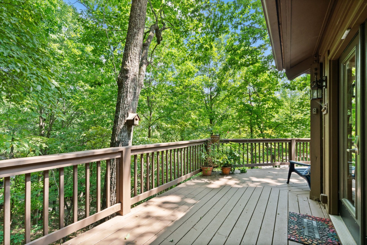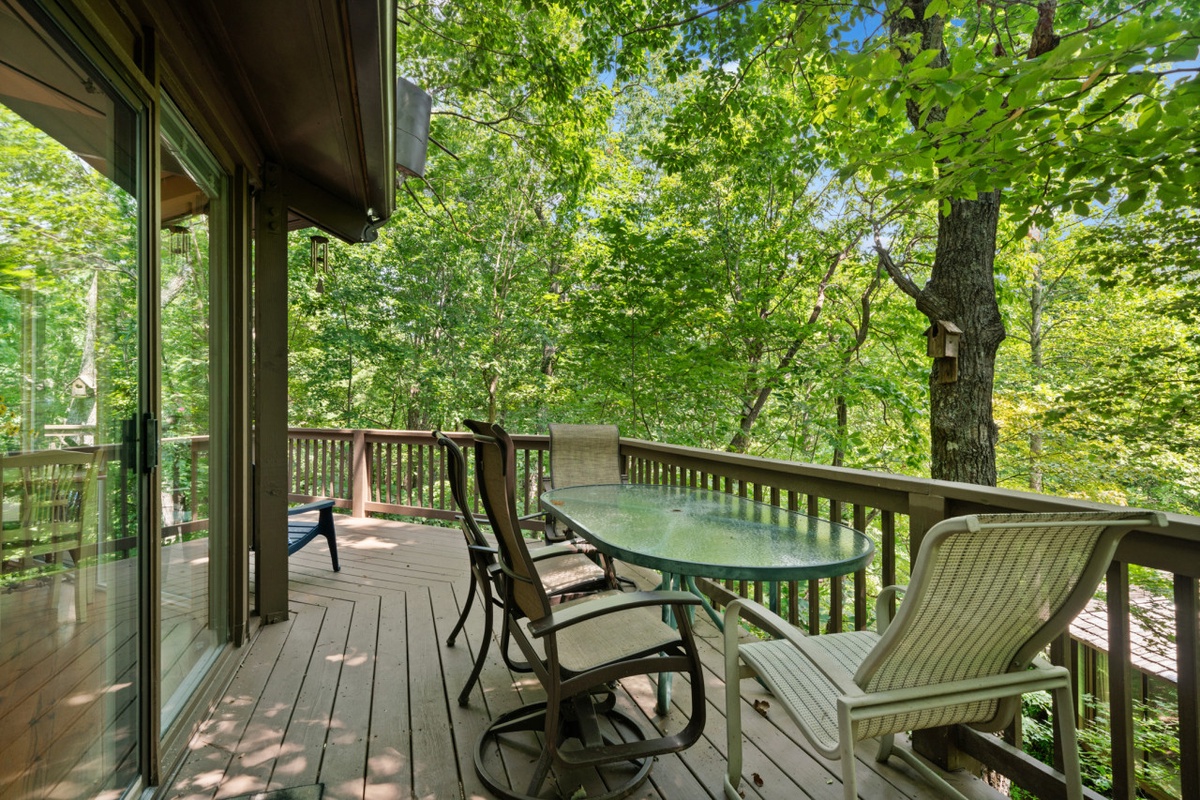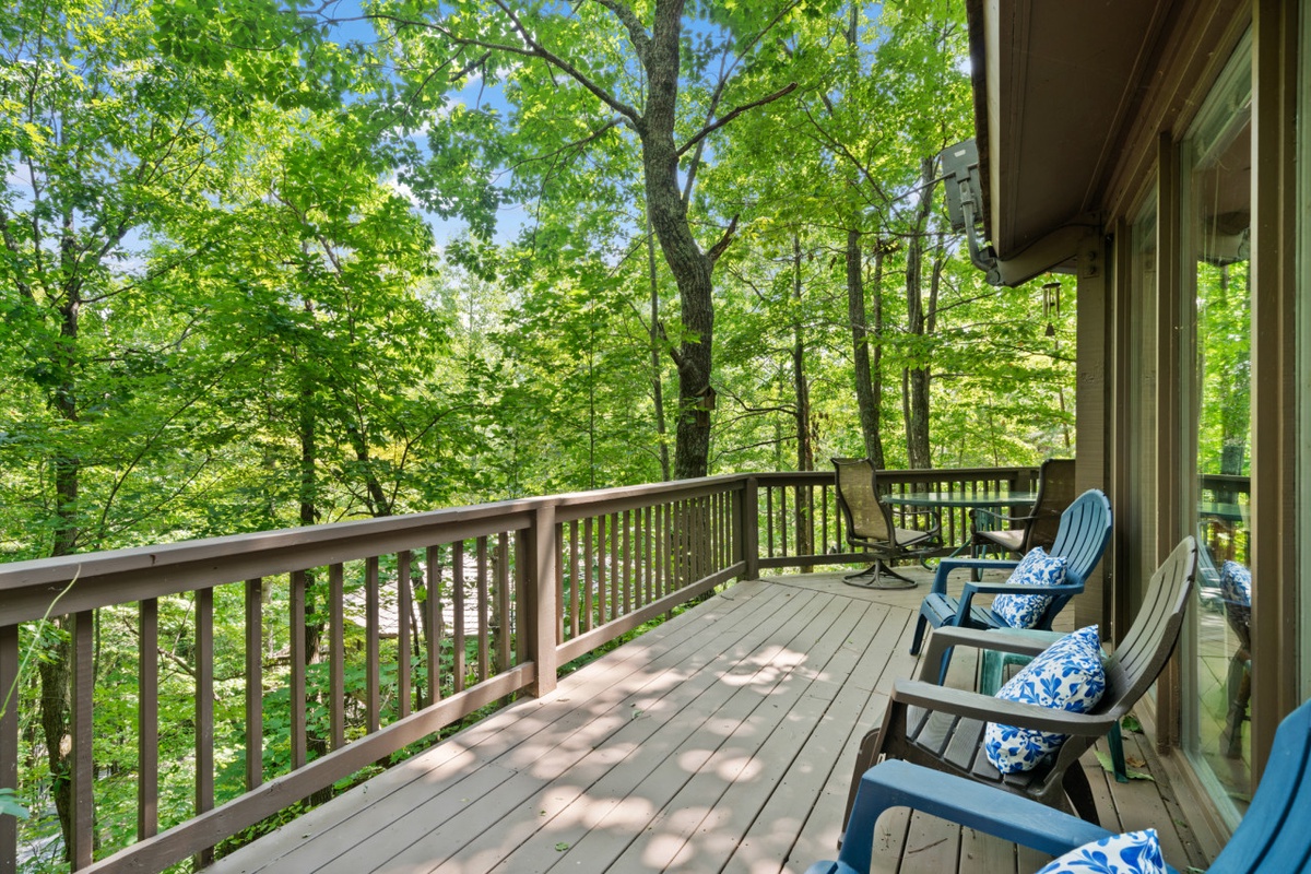 Tucked among the treetops and surrounded by the peaceful canopy of Big Canoe, Treetopper Knoll Chalet offers a one-of-a-kind mountain hideaway with all the comfort of a modern retreat. Completely renovated yet brimming with charm, this unique treehouse-style home features floor-to-ceiling windows that pull in natural light and give guests the feeling of living within the forest. The open-concept living area offers a cozy lounging space, dining nook with wooded views, and an inviting kitchen with sleek appliances, ample cabinetry, and stylish finishes that fit seamlessly into this bright and airy space.