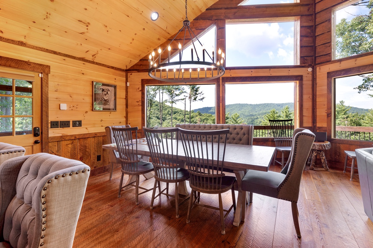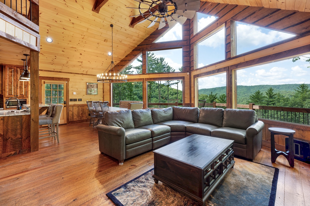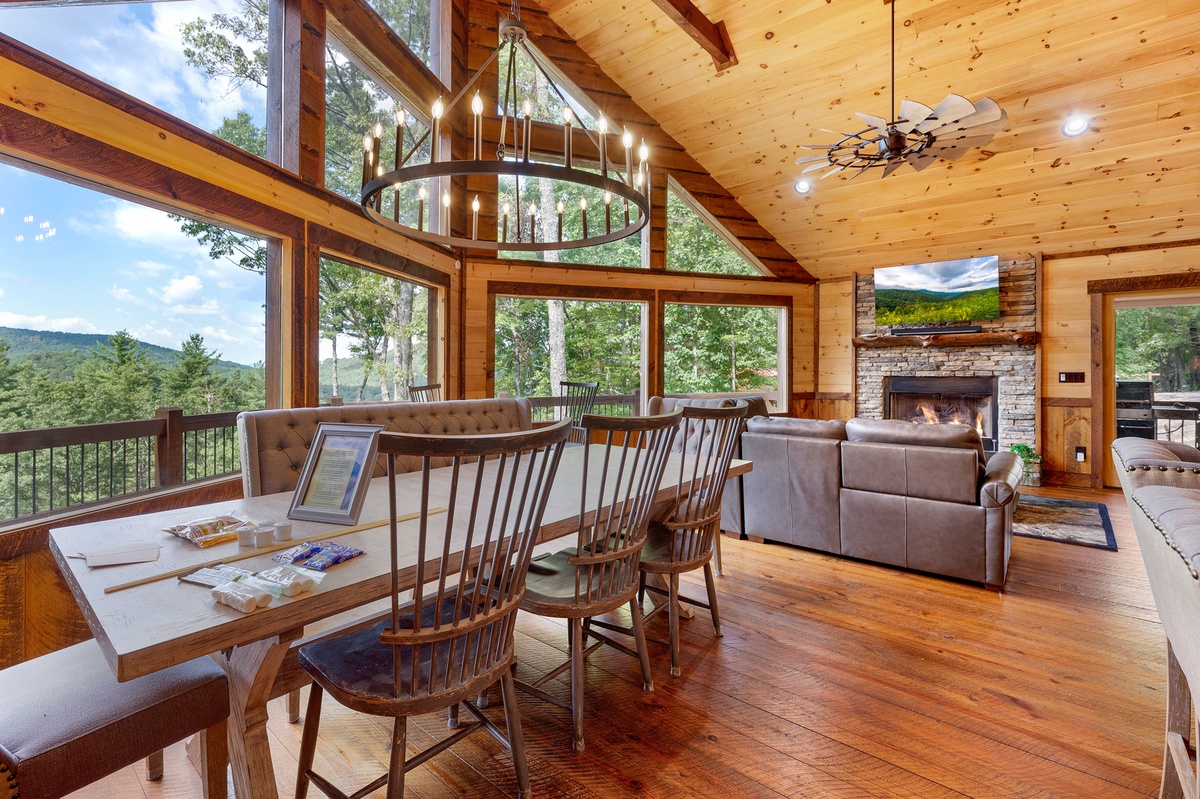 Entering your vacation home, your eyes will be drawn to the large windows of the living room with its breath-taking views of the mountains. Here you can cozy up in front of the fireplace while enjoying your morning or evening diversion of the sun setting or rising to greet you.