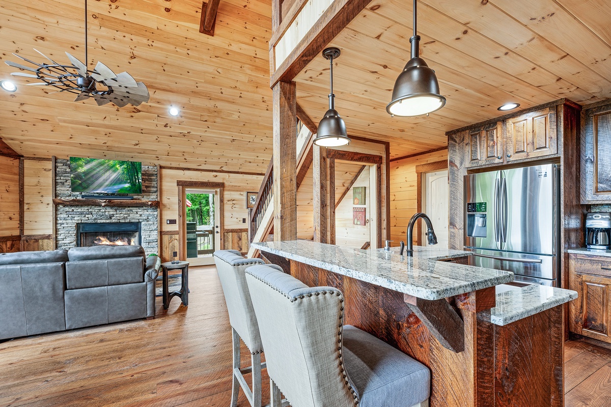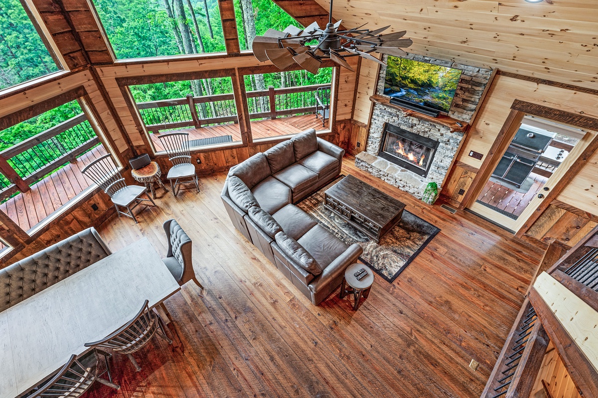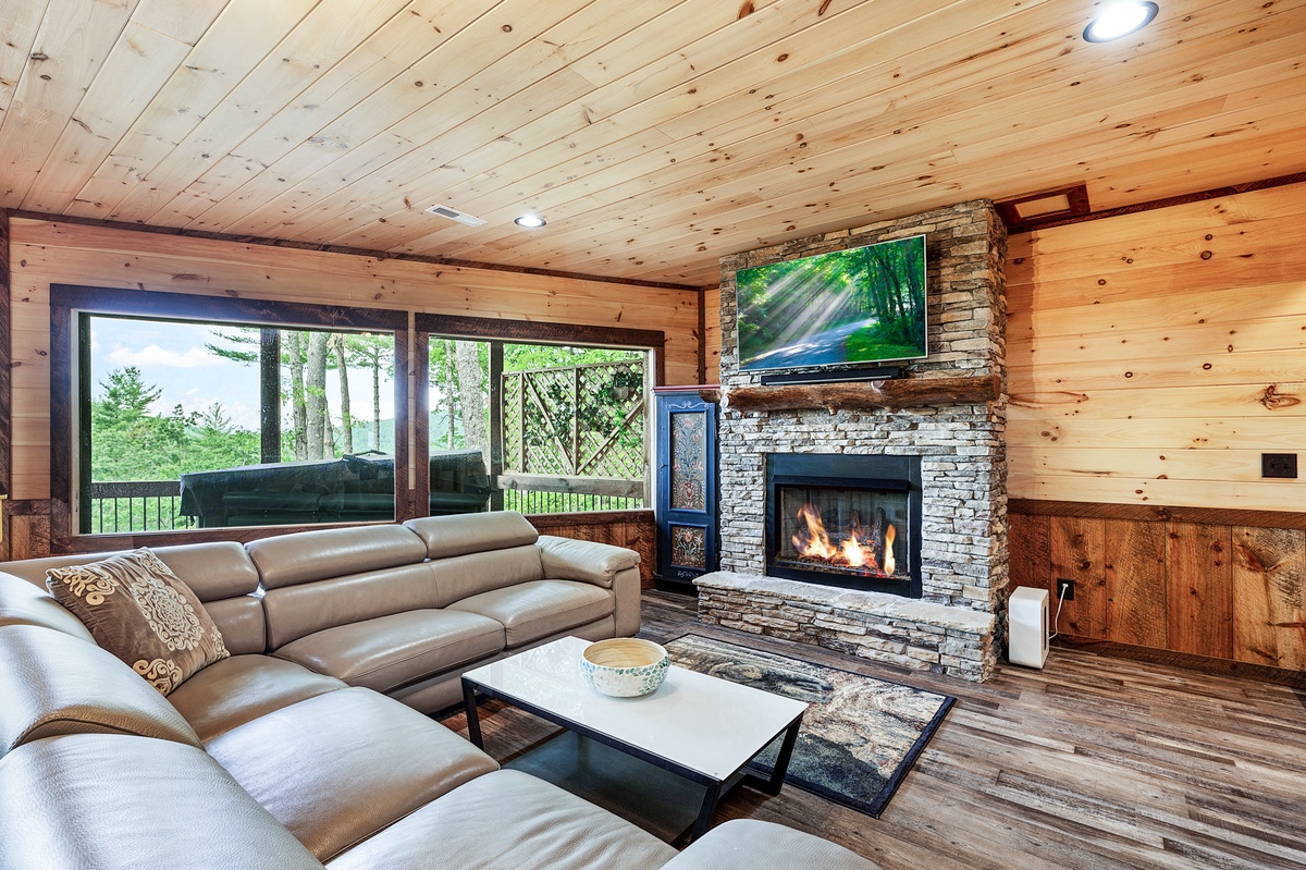 - Living area with stone gas fireplace, 55”TV, 6-7 seat sectional, cabinets, hat rack.