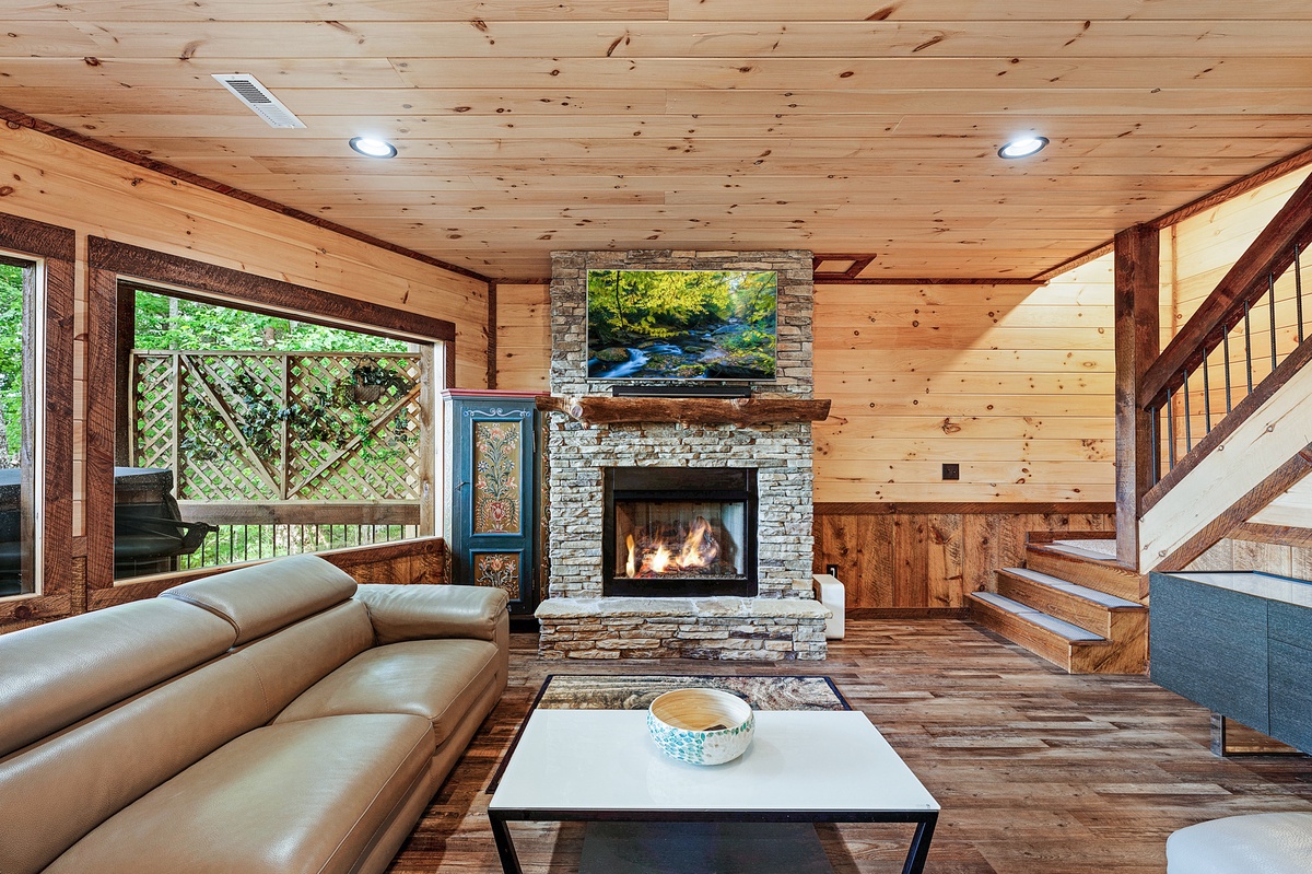 - Living room with stone gas fireplace