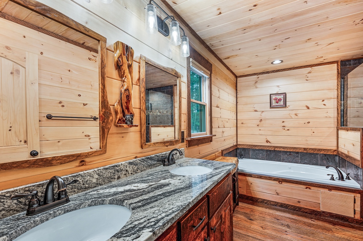 - Master bedroom with 2 dressers, chest, closet, 55”TV and private bathroom with double vanity, separate tub and tiled shower.