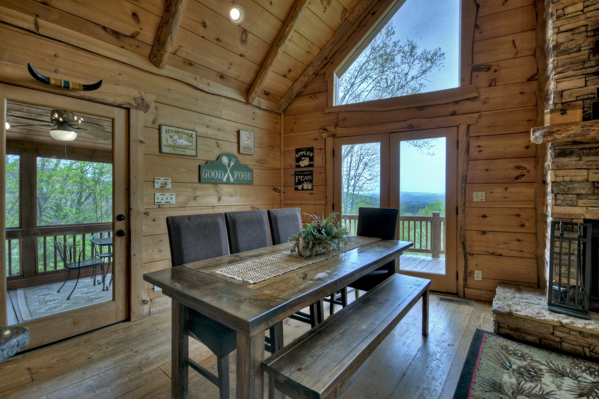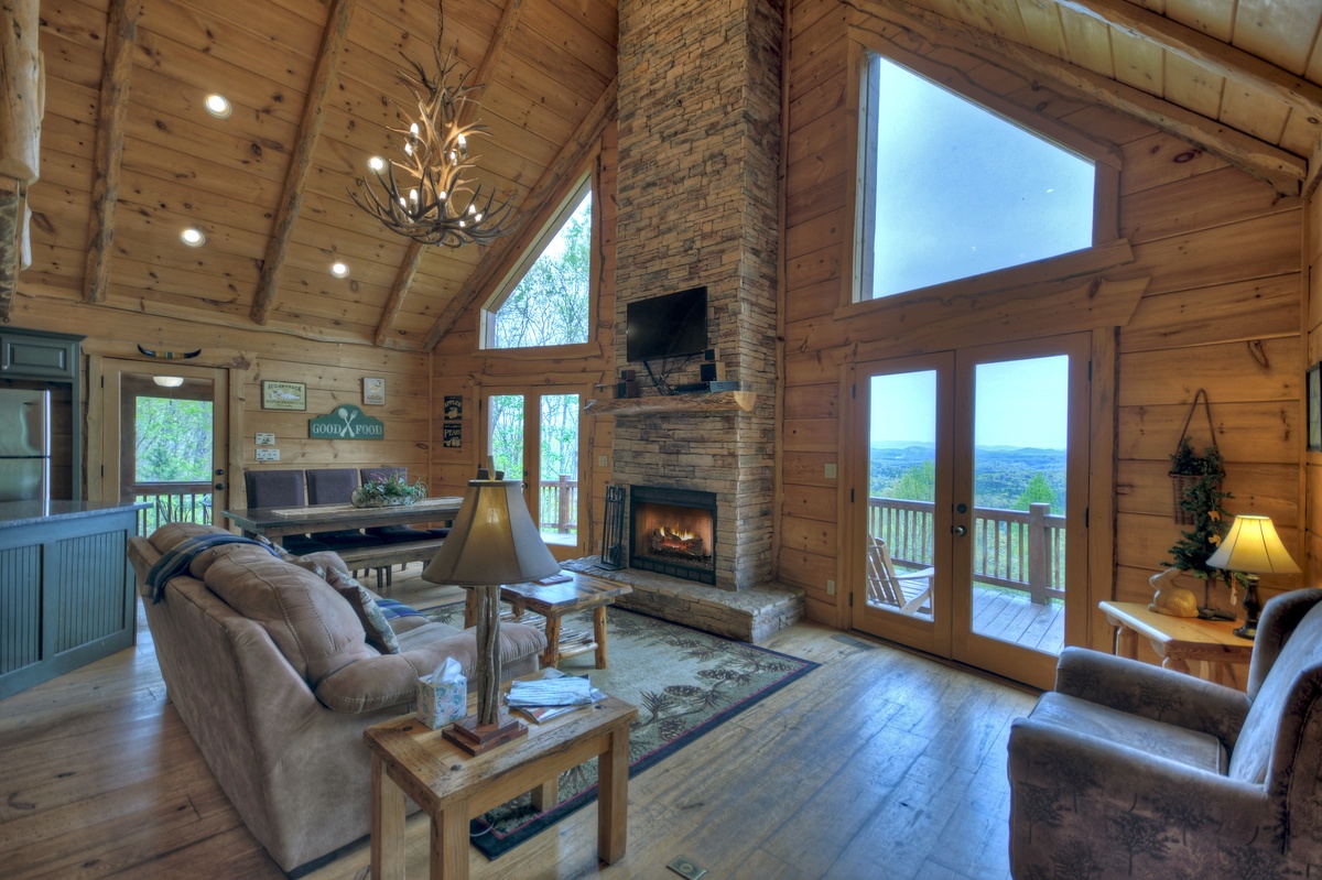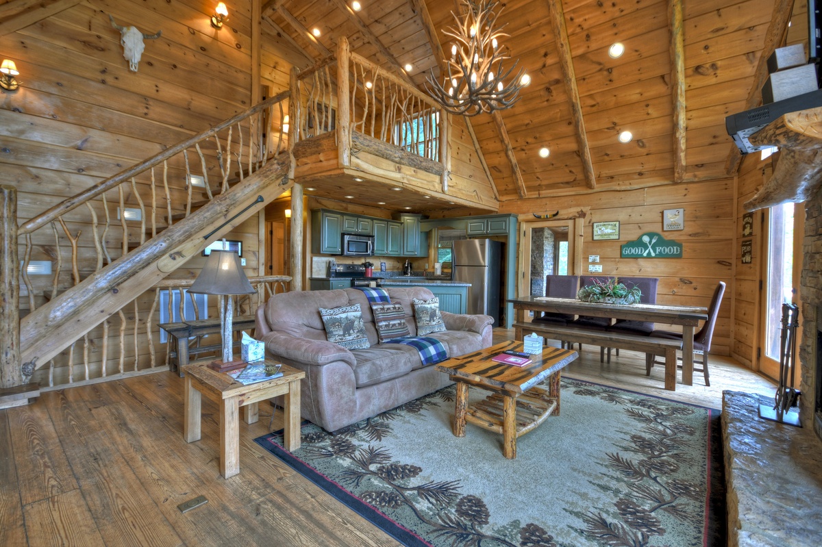 The fully equipped kitchen is perfect for preparing all and any meals during your retreat. The dining area is adjacent to the kitchen for ultimate convenience. Enjoying mealtime is an enjoyable experience at the gorgeous farmhouse table. The open floor plan means that family time easier than ever. The living room is spacious and offers a Mountain View out of the soaring prow front windows. The real log fireplace is perfect for a nice crackling fire while you cozy up on the couch and watch a movie with your honey.
