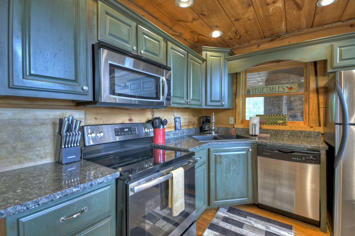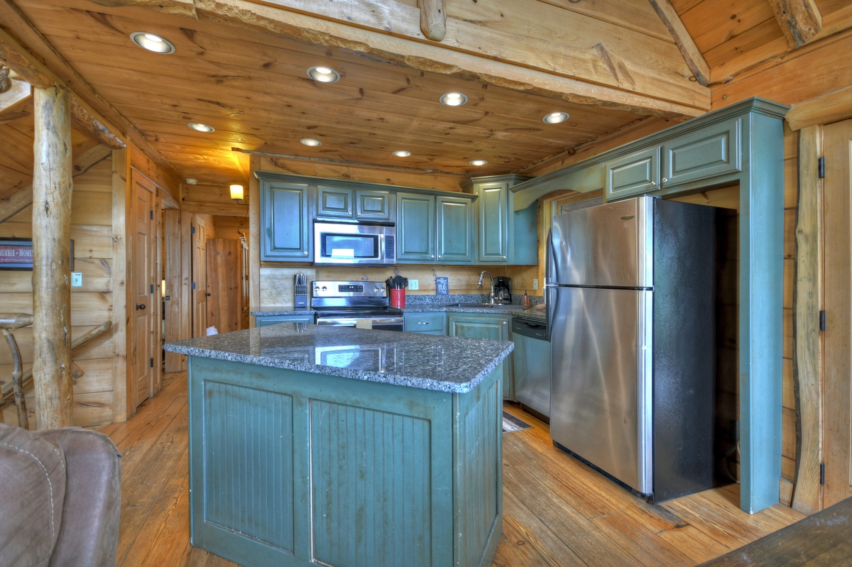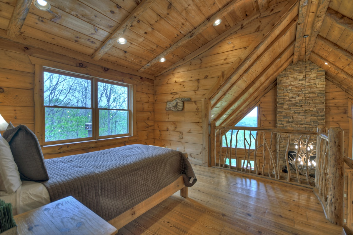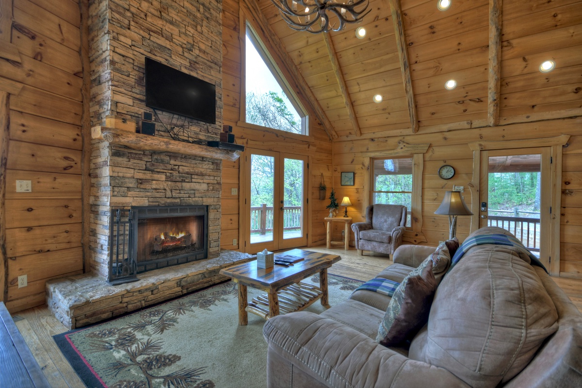 The fully equipped kitchen is perfect for preparing all and any meals during your retreat. The dining area is adjacent to the kitchen for ultimate convenience. Enjoying mealtime is an enjoyable experience at the gorgeous farmhouse table. The open floor plan means that family time easier than ever. The living room is spacious and offers a Mountain View out of the soaring prow front windows. The real log fireplace is perfect for a nice crackling fire while you cozy up on the couch and watch a movie with your honey.