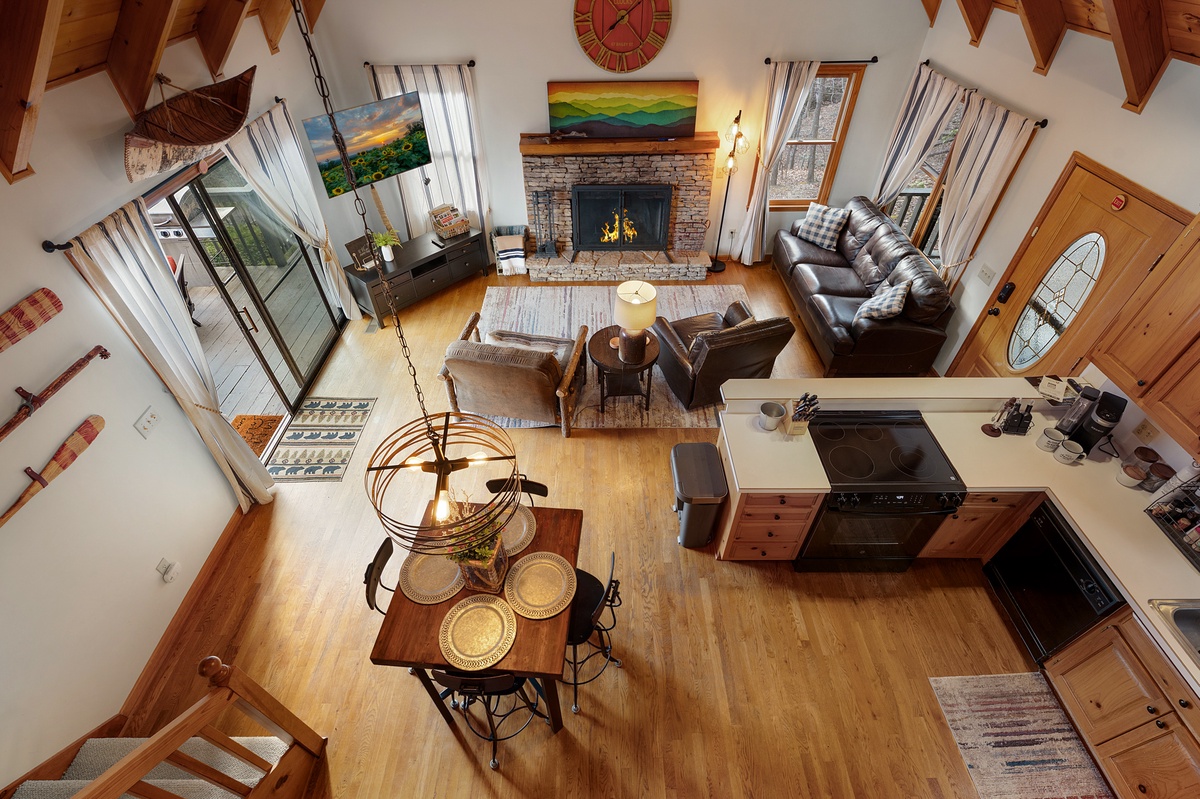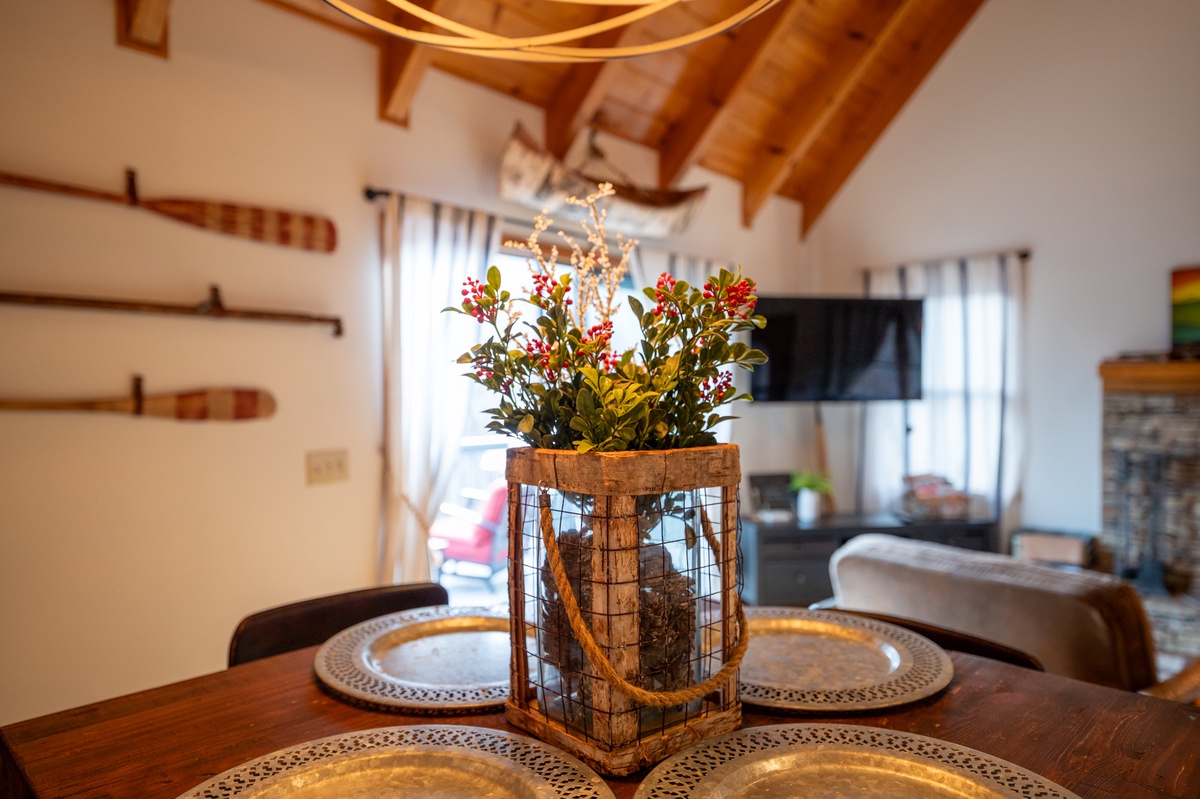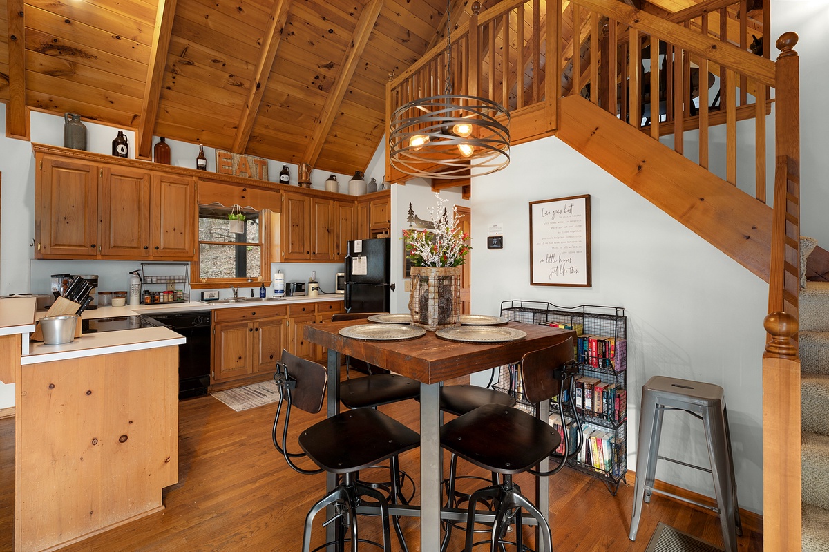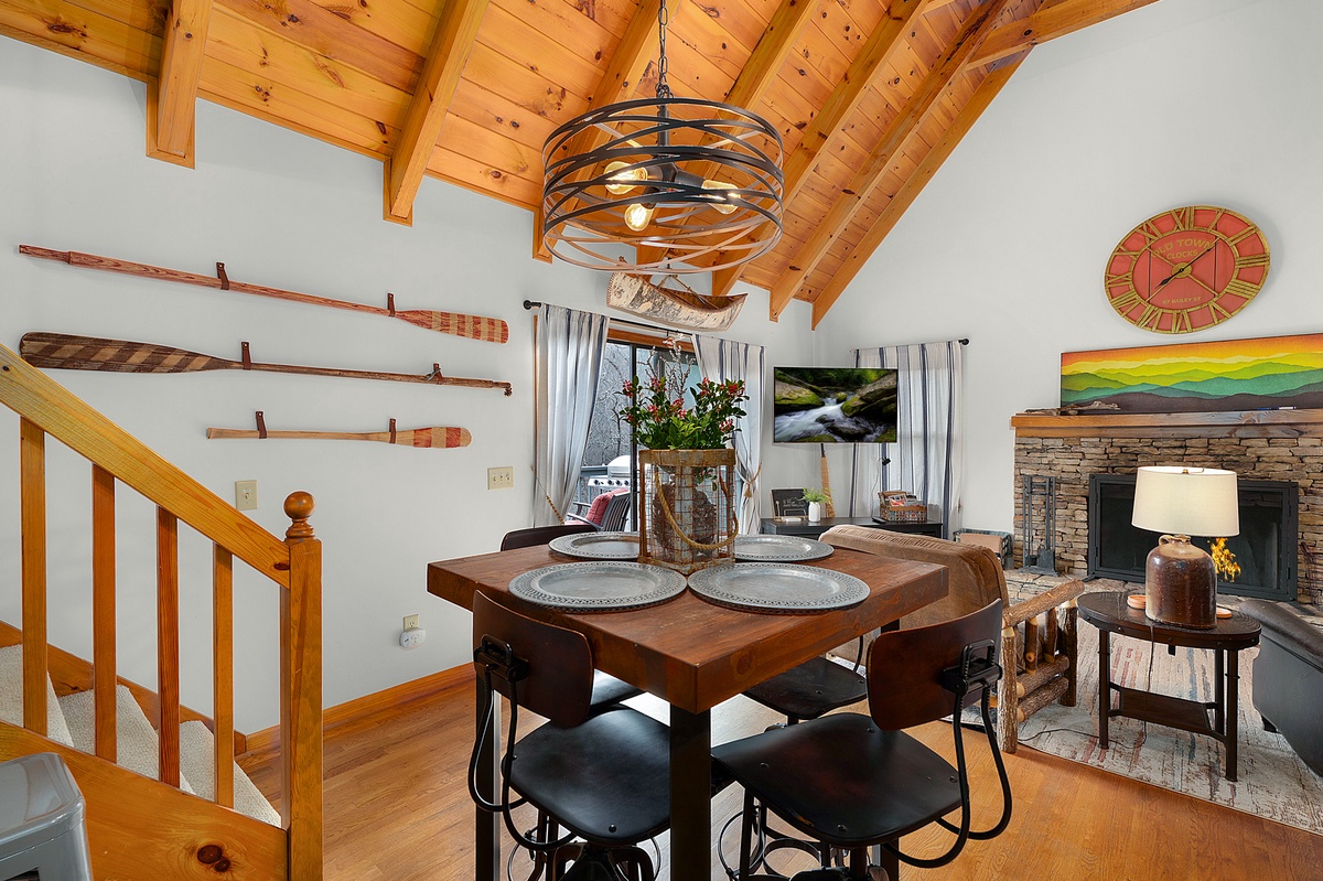 Just steps away, the fully equipped kitchen provides everything needed to prepare meals during your stay. The adjacent dining area seats four comfortably, perfect for enjoying breakfast before a hike or dinner after a day of exploring Big Canoe.