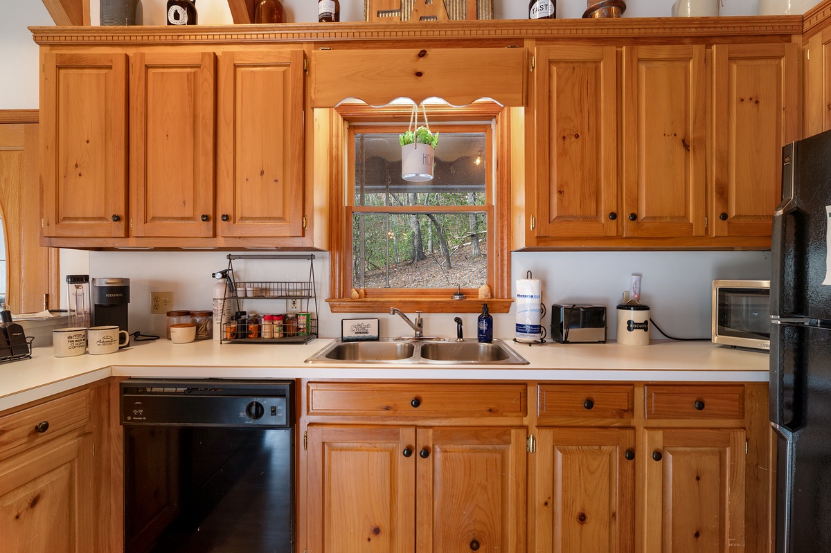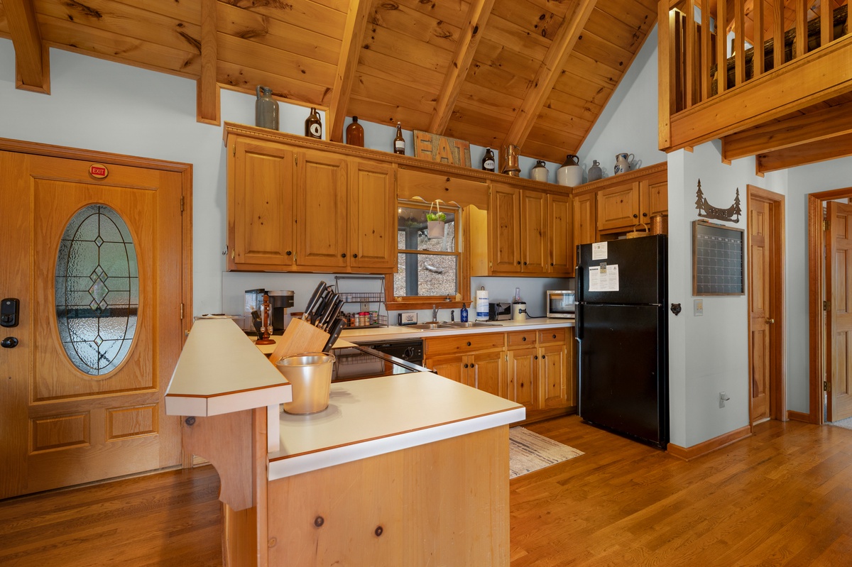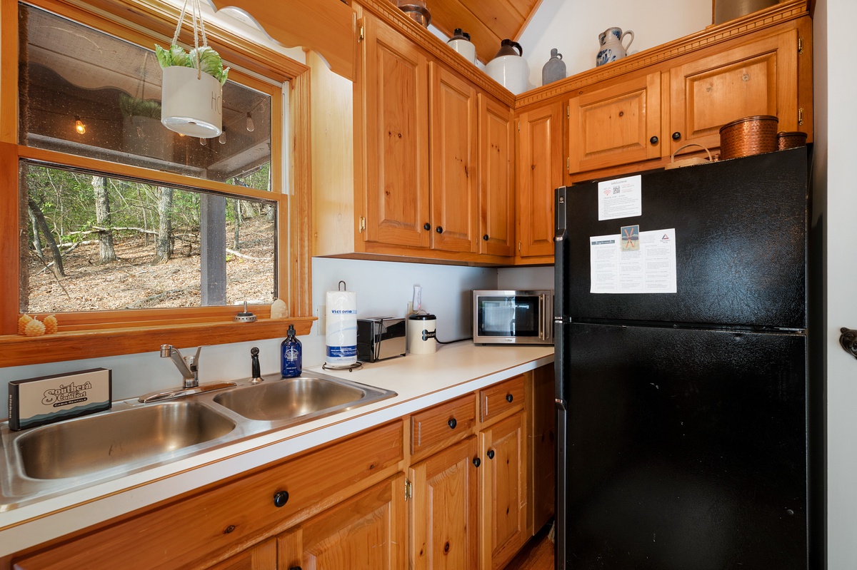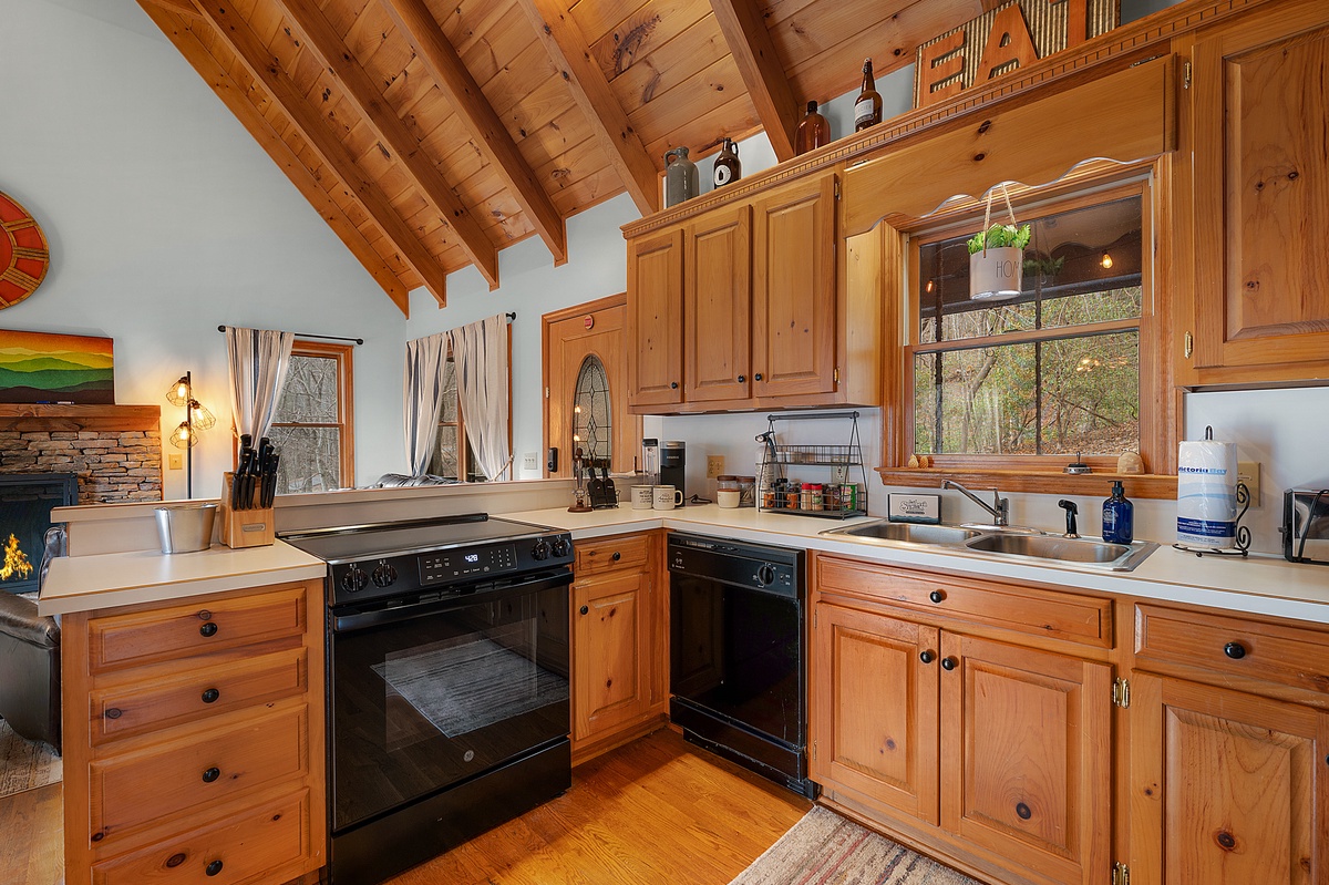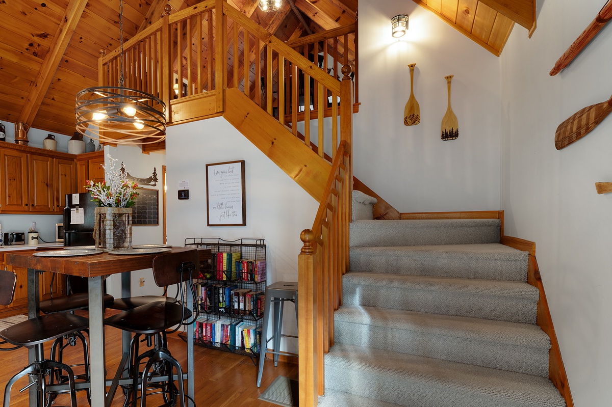 Just steps away, the fully equipped kitchen provides everything needed to prepare meals during your stay. The adjacent dining area seats four comfortably, perfect for enjoying breakfast before a hike or dinner after a day of exploring Big Canoe.