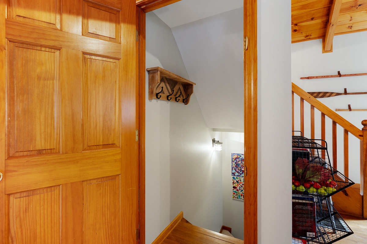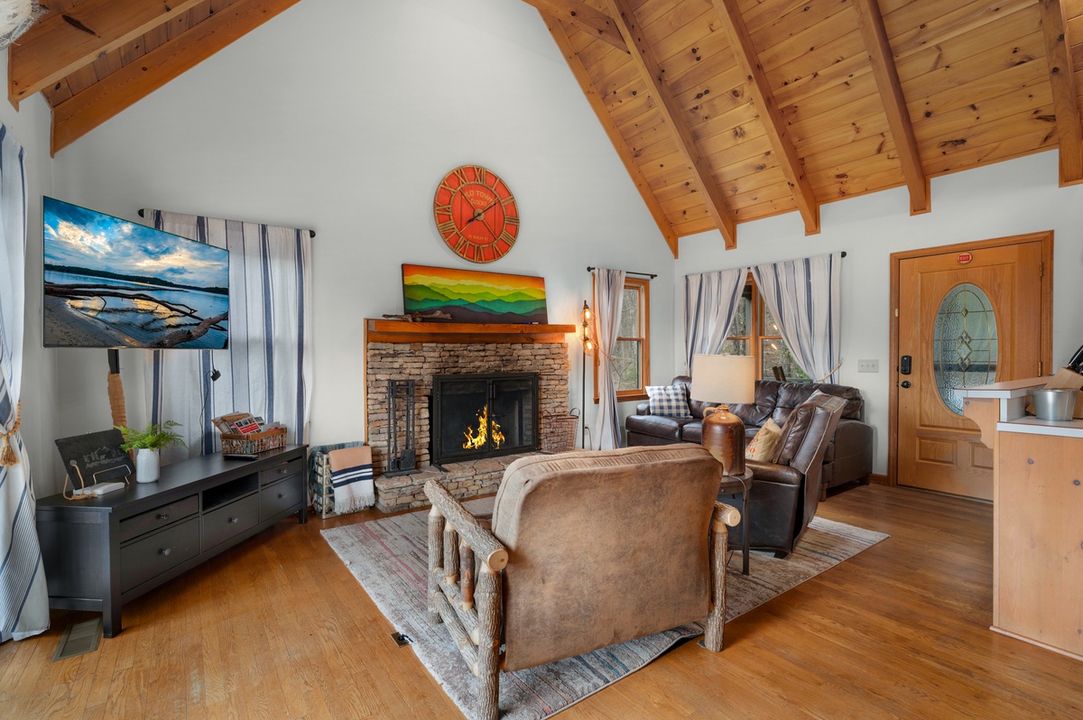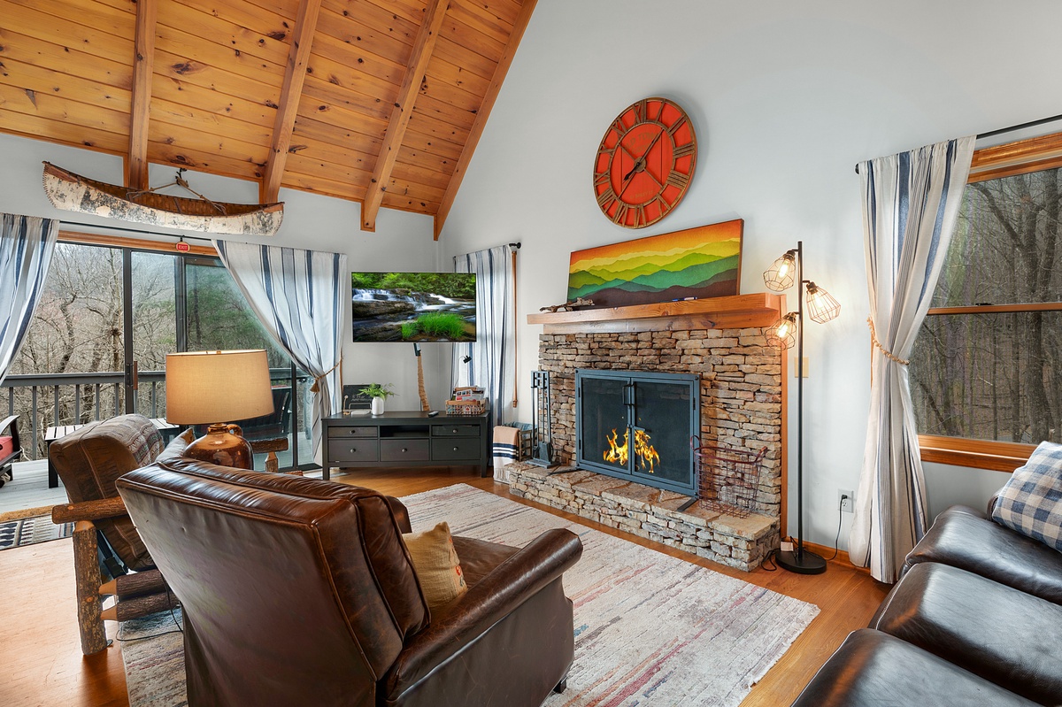 The main level living room is the heart of the home, offering plush seating, a wood-burning fireplace, and a streaming TV for cozy evenings after a day exploring the mountains. Large windows and deck access allow natural light and the beauty of the surrounding forest to fill the space.
