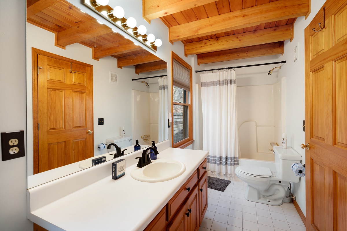 - The main level king suite features deck access and a private bathroom with shower/tub combination.