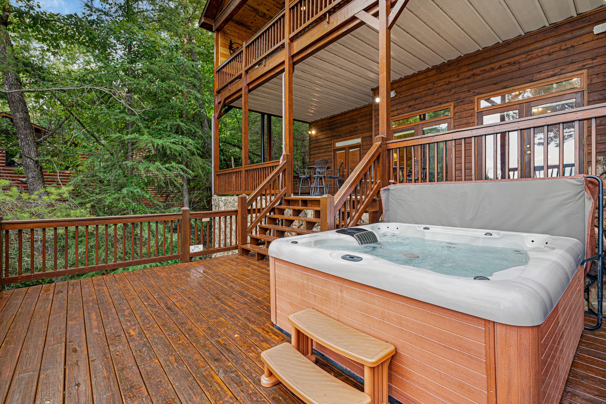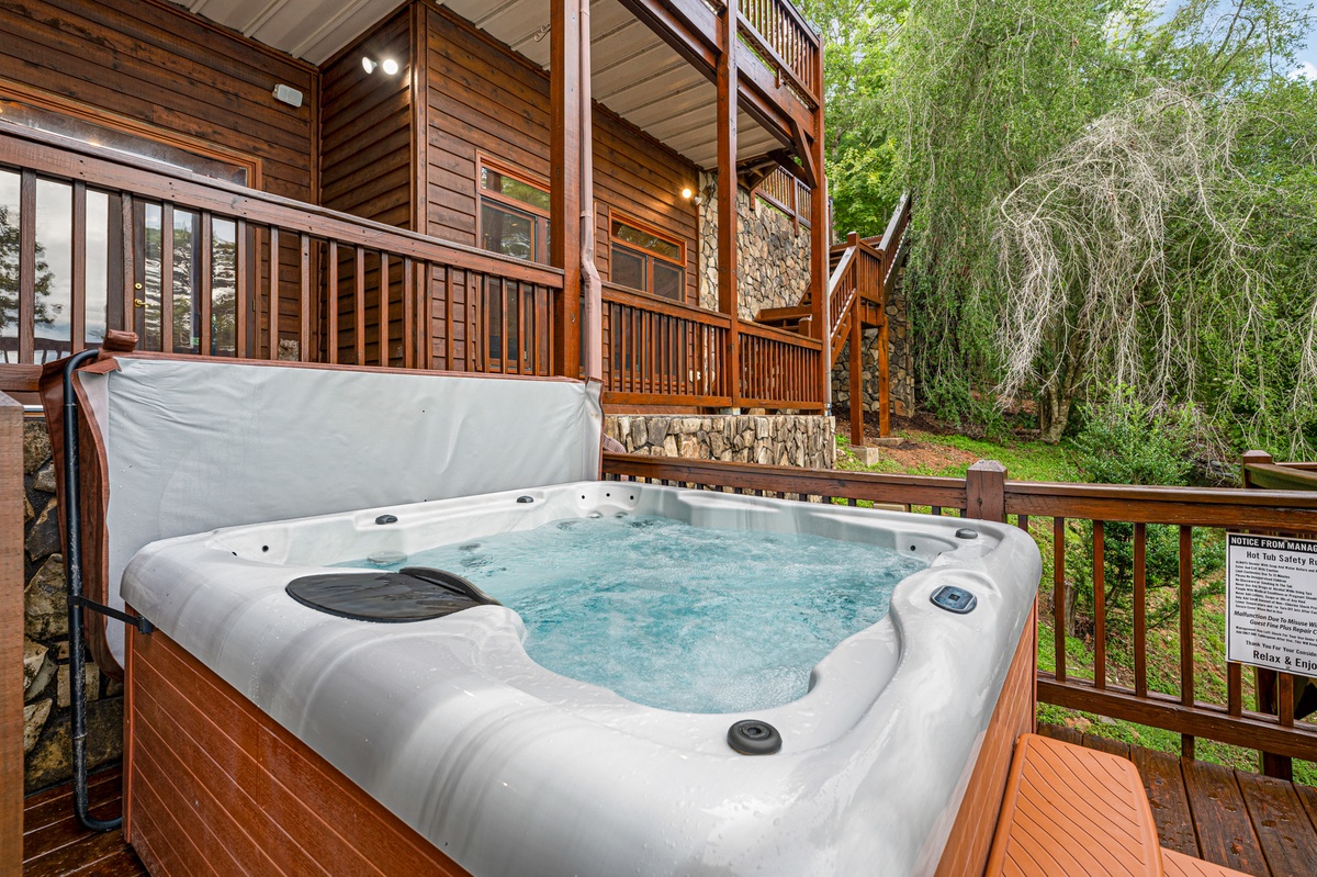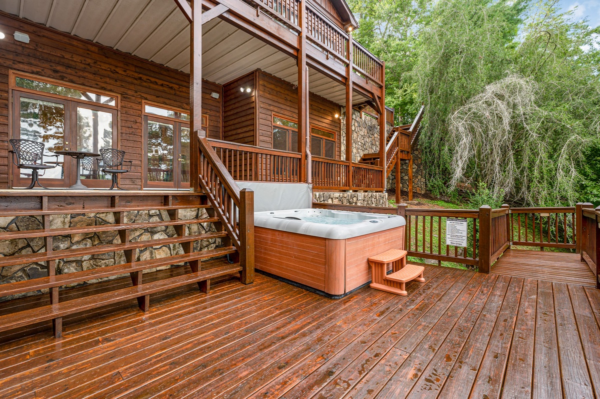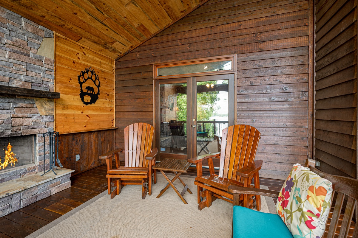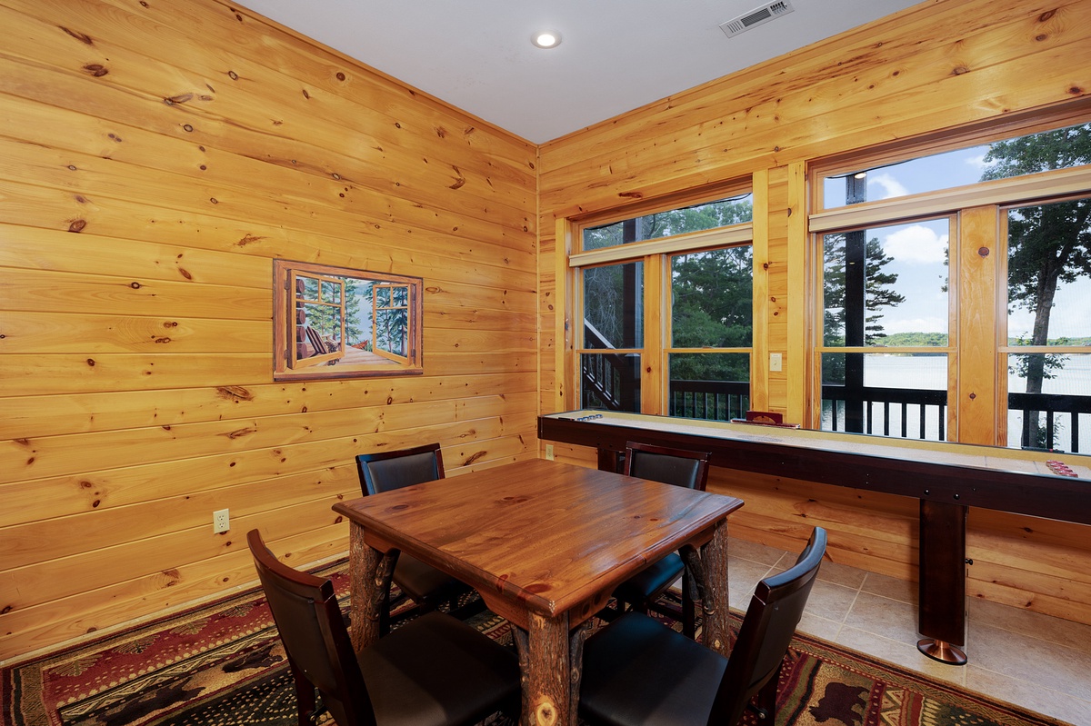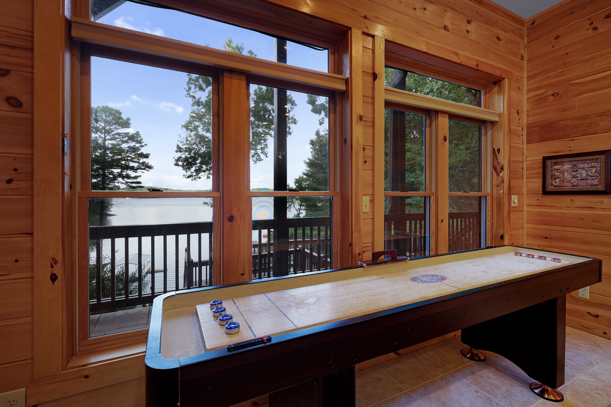 Outside on the deck, chill out in front of the outdoor fireplace overlooking the lake views, or relax your bones in the hot tub. If you're wired up with energy and are feeling a little competitive, play a game of table shuffleboard or foosball in the lower level recreation room. This lower level room also offers a wood burning fireplace, 55" Flat Panel TV with sound bar, and a complete wet bar with mini fridge and warming table, so you can bring your snacks!Â