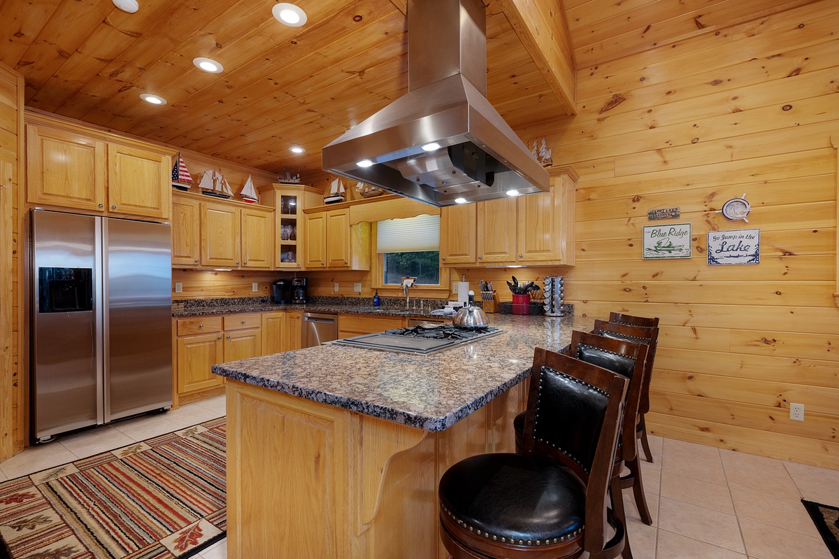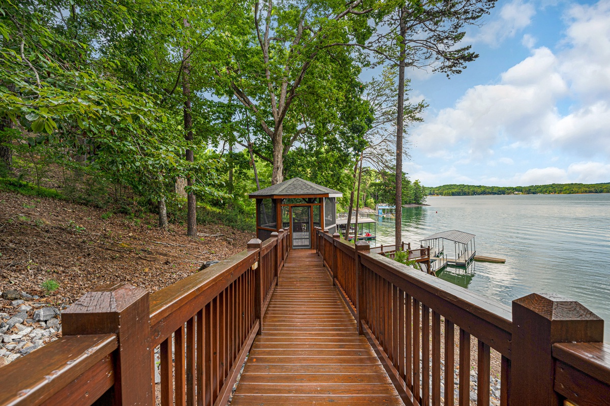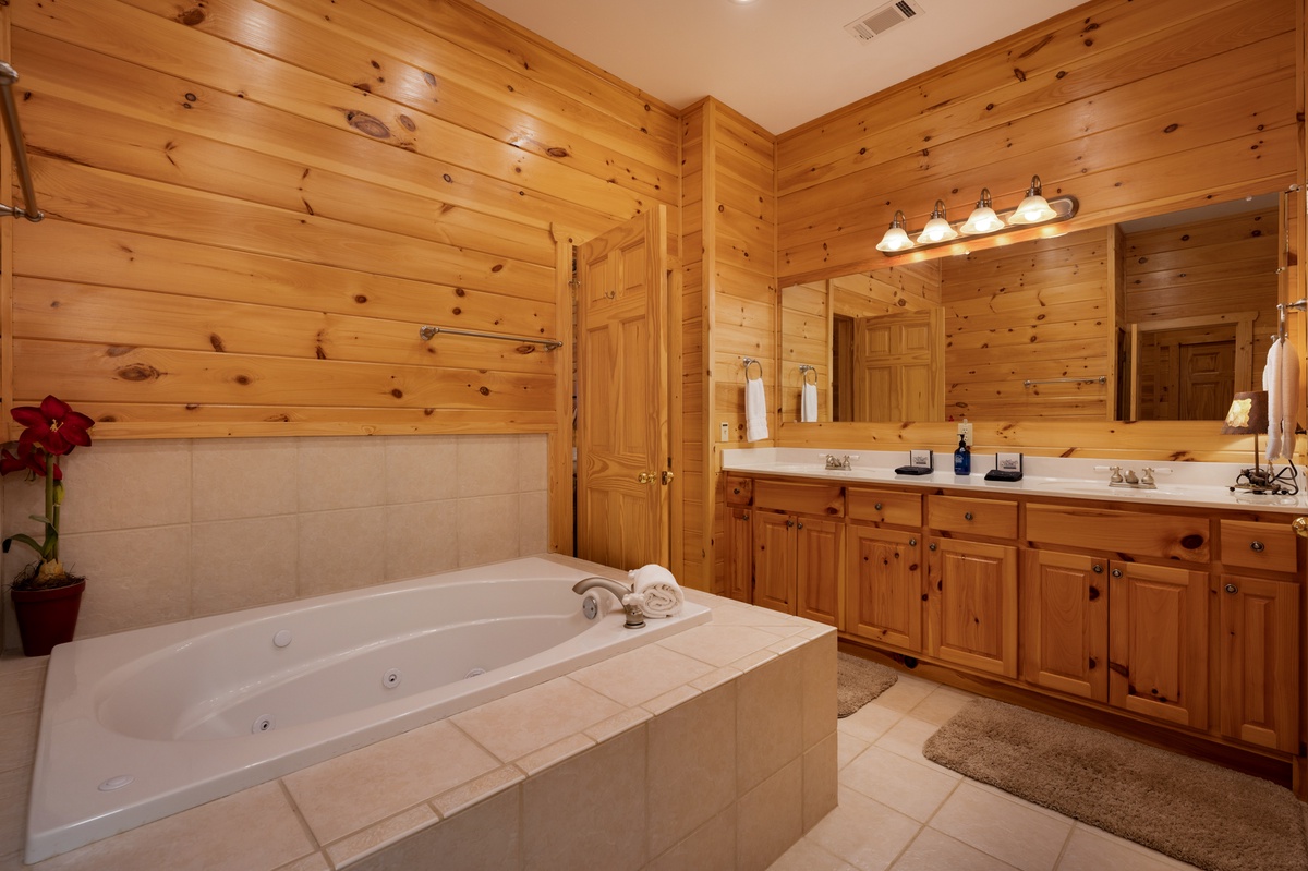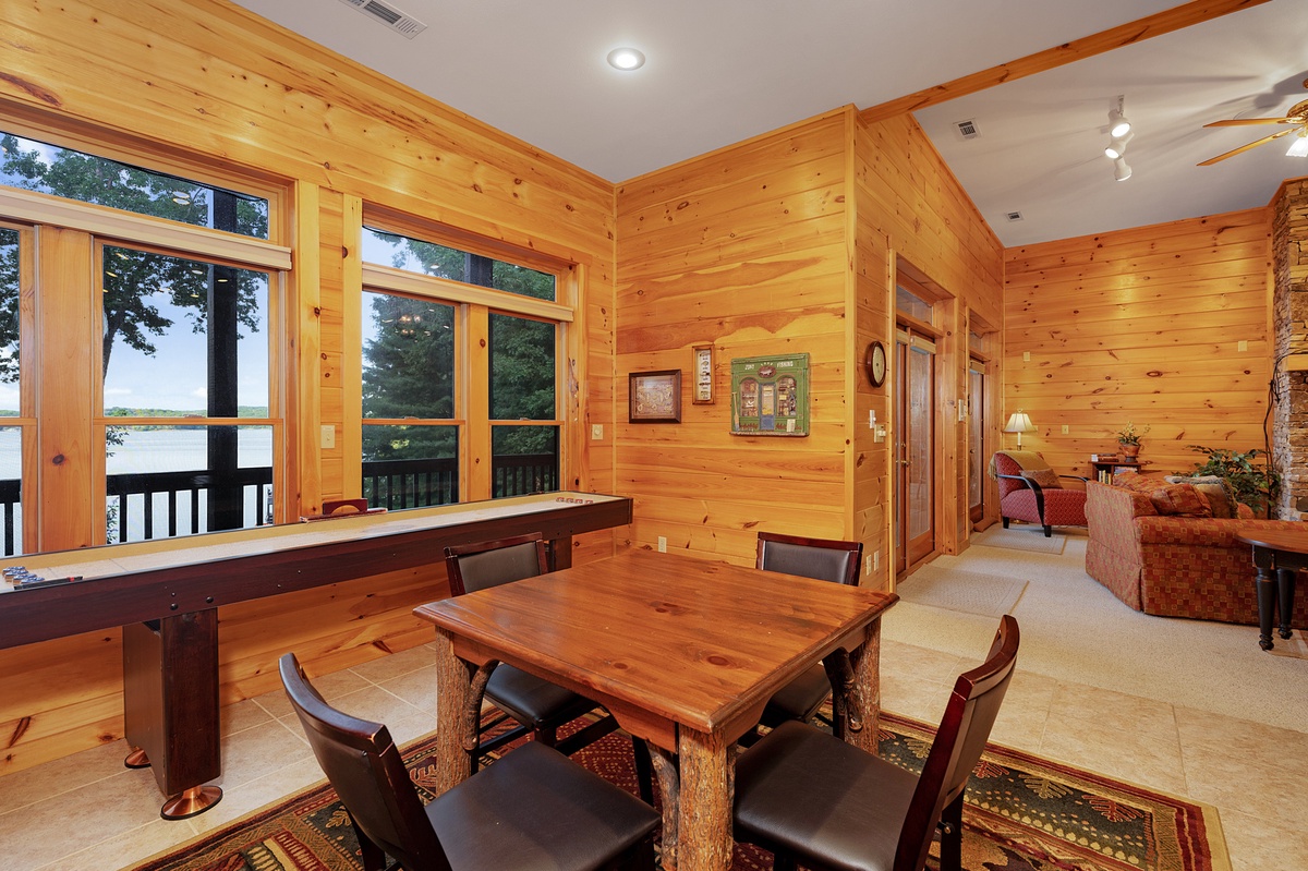 When the time rolls around to take a lake-time siesta, only the comfiest beds await. The entry level offers a master King suite with a 48" Flat Panel TV, deck access, and an attached bathroom with double vanity and stand in shower. The upper level offers 3 more bedrooms; Bedroom #1 has a King Bed, with a 48" Flat Panel TV and an attached bathroom with a tub shower combo. Down the hall, find bedroom number 2&3. Bedroom #2 offers a Queen Bed with a 32" Flat Panel TV. Just across the hall, sits Bedroom #3, offering 2 bunks (4 Twins) and a 32" Flat Panel TV. Bedroom #2 and #3 share a bathroom located between the two rooms which has a tub/shower combo. Come downstairs, back to the fun room, and discover another bedroom with a King Bedroom with a 32" flat panel TV and an attached bathroom with a Jetted Tub, stand-in shower and double vanity.