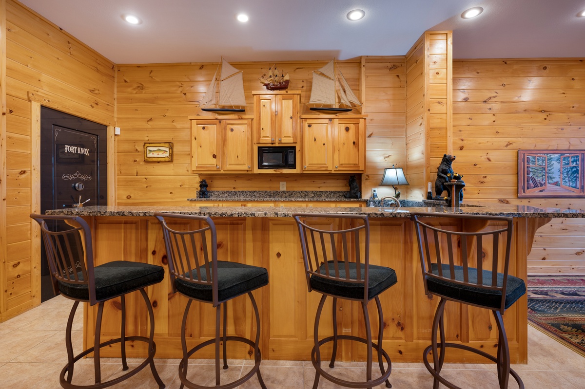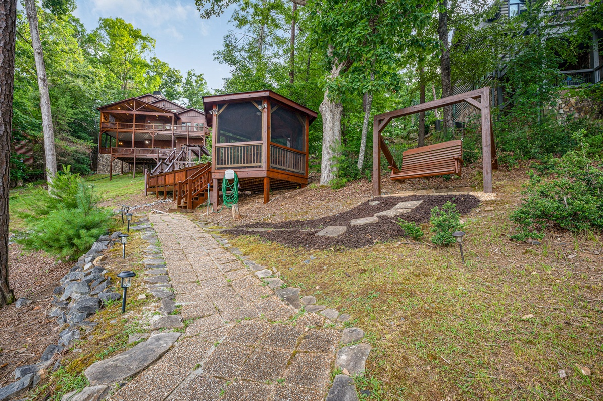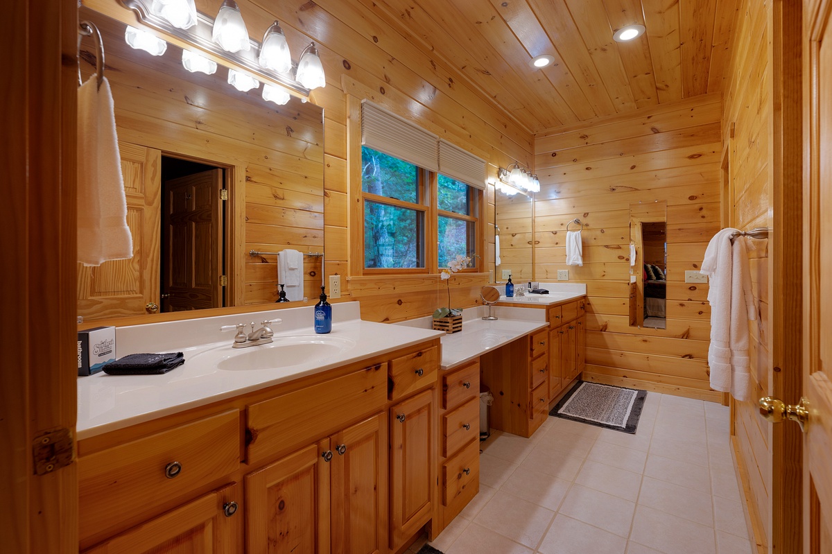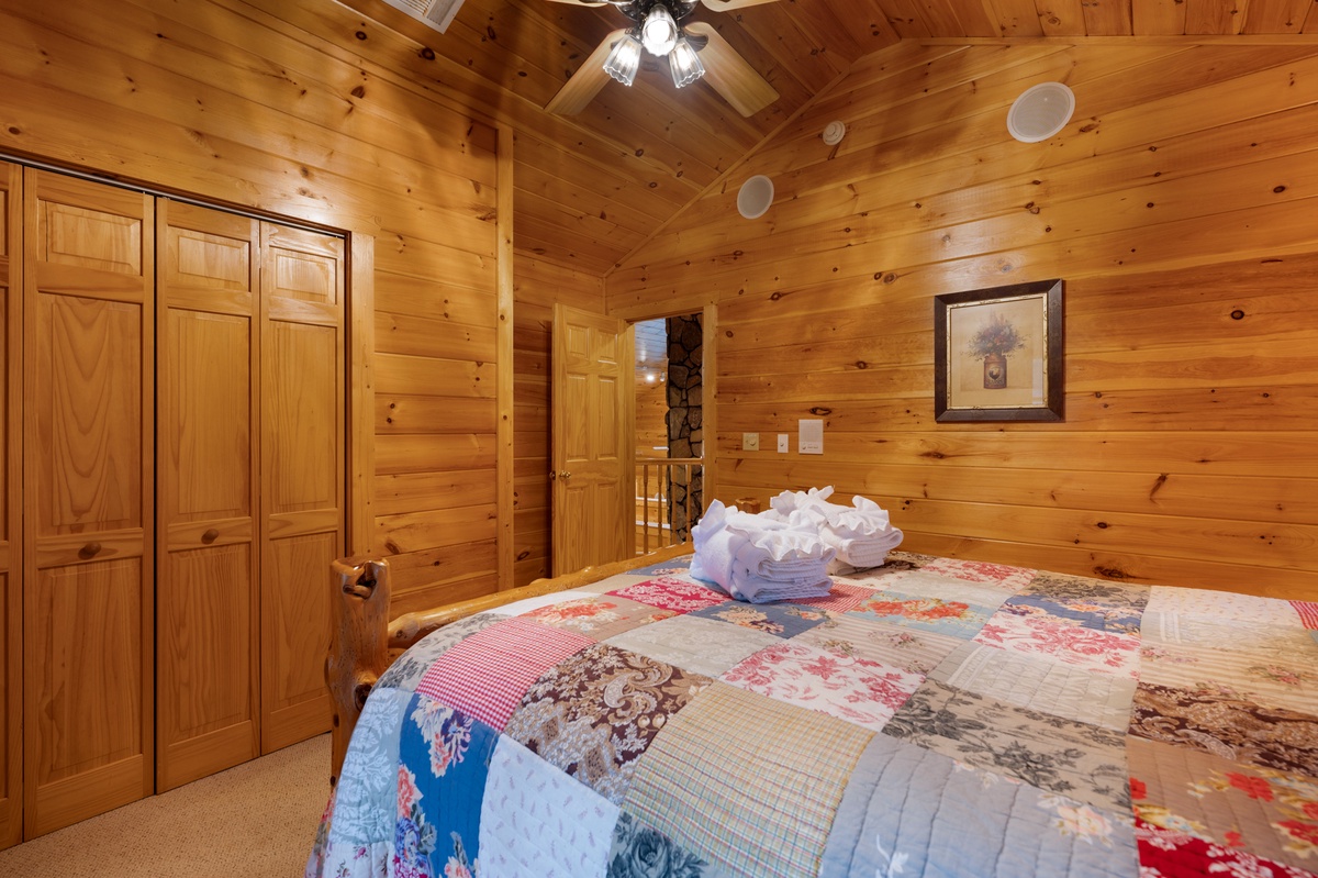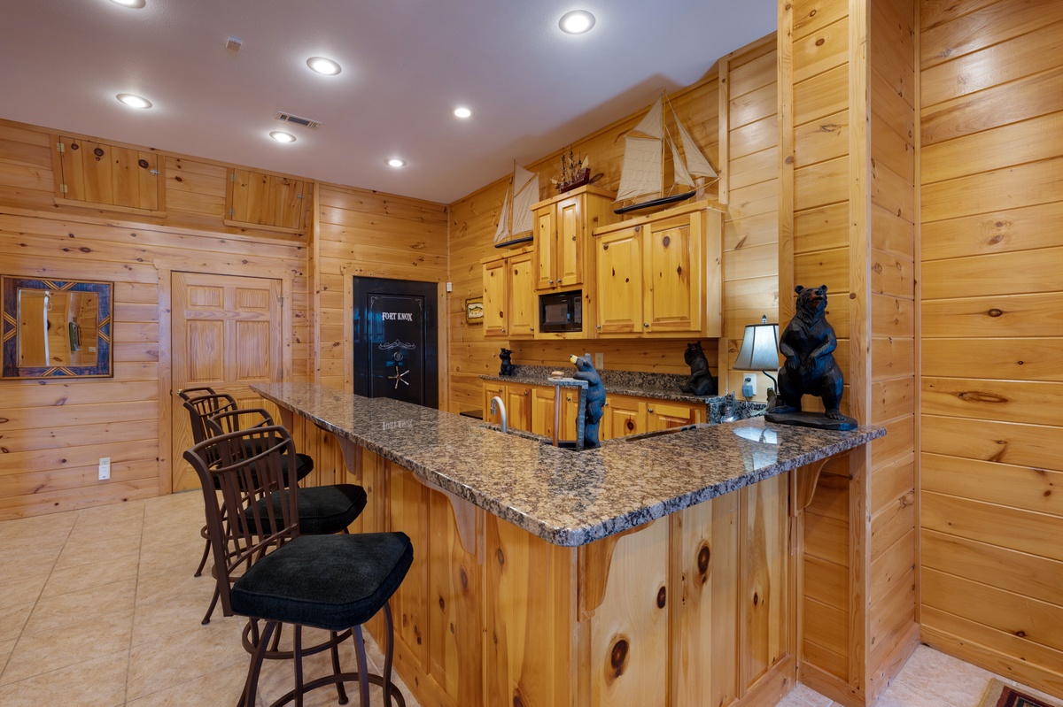 When the time rolls around to take a lake-time siesta, only the comfiest beds await. The entry level offers a master King suite with a 48" Flat Panel TV, deck access, and an attached bathroom with double vanity and stand in shower. The upper level offers 3 more bedrooms; Bedroom #1 has a King Bed, with a 48" Flat Panel TV and an attached bathroom with a tub shower combo. Down the hall, find bedroom number 2&3. Bedroom #2 offers a Queen Bed with a 32" Flat Panel TV. Just across the hall, sits Bedroom #3, offering 2 bunks (4 Twins) and a 32" Flat Panel TV. Bedroom #2 and #3 share a bathroom located between the two rooms which has a tub/shower combo. Come downstairs, back to the fun room, and discover another bedroom with a King Bedroom with a 32" flat panel TV and an attached bathroom with a Jetted Tub, stand-in shower and double vanity.