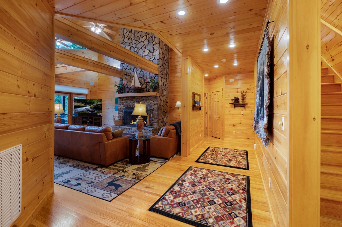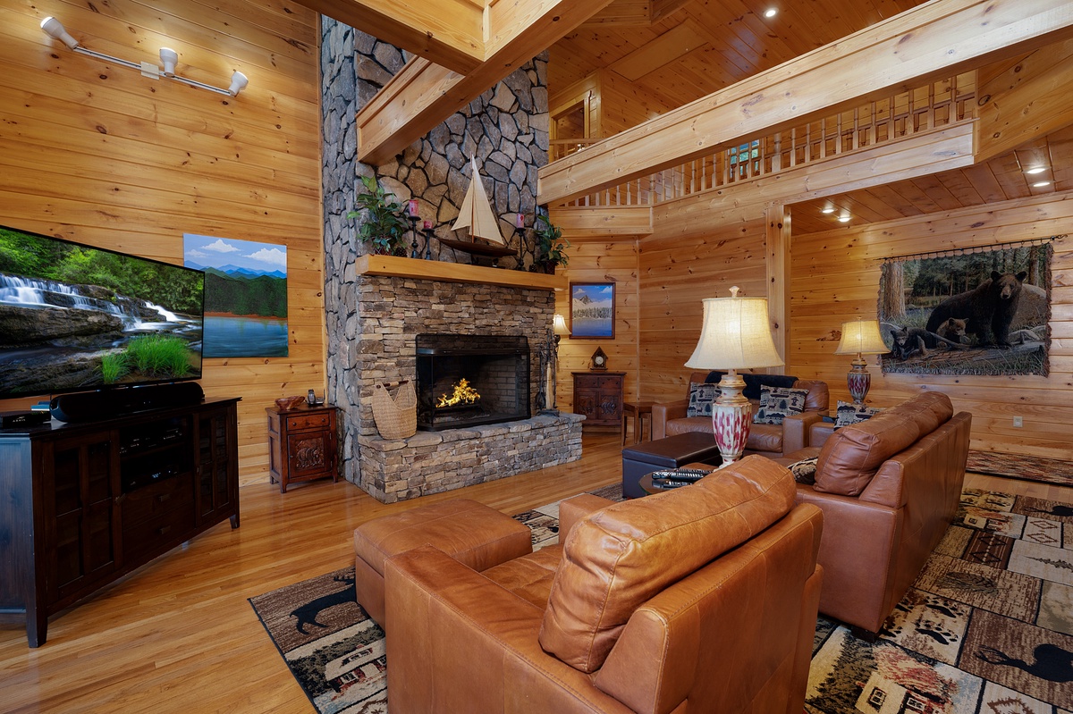 - Living Room with Wood Burning/Stone Fireplace and 50" Flat Panel TV with Sound Ba