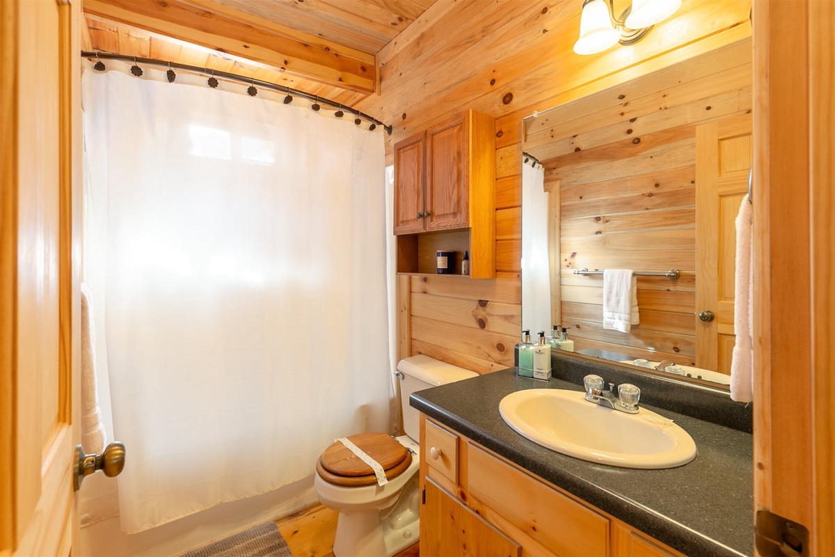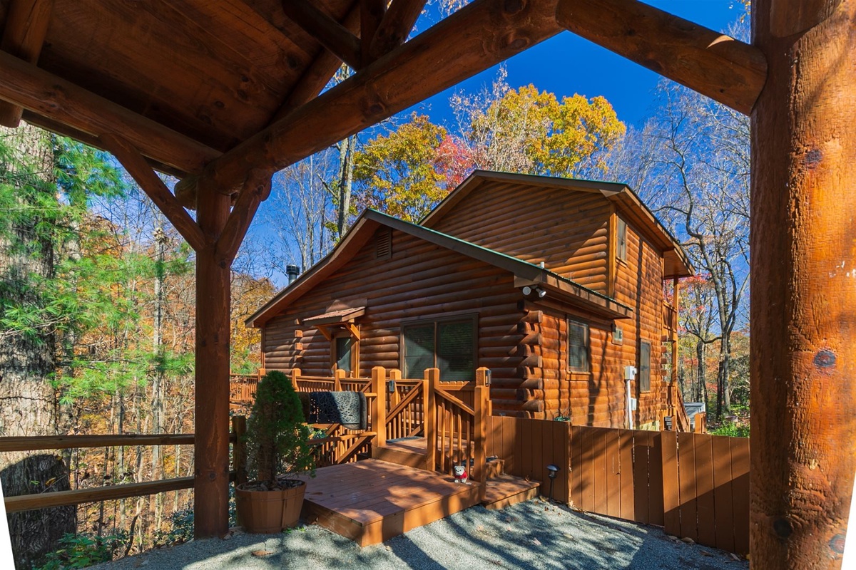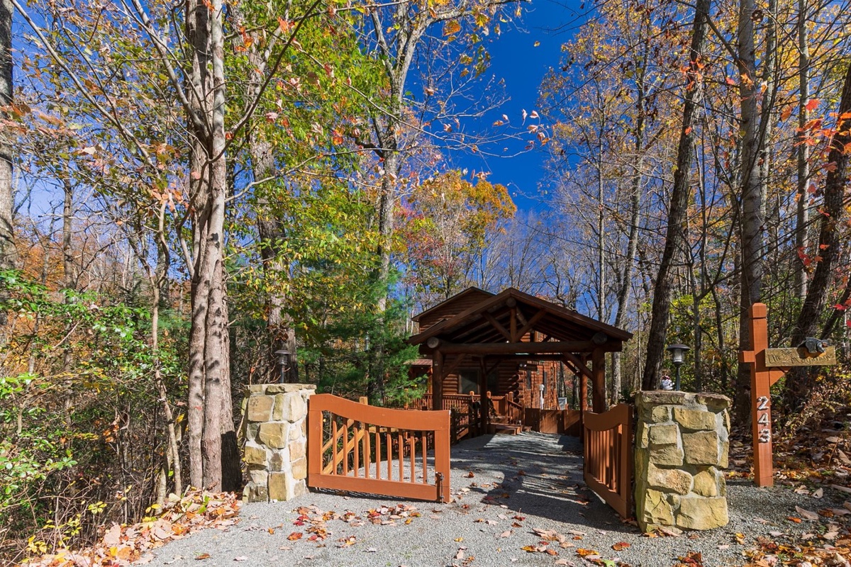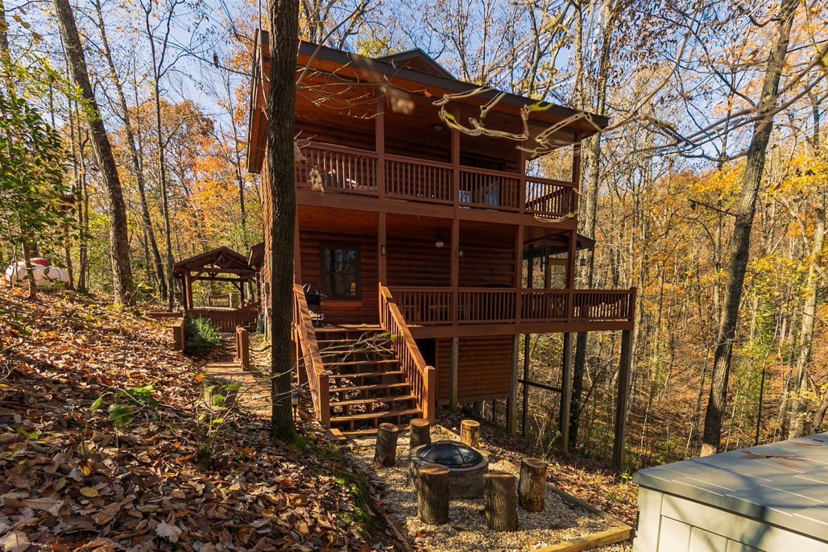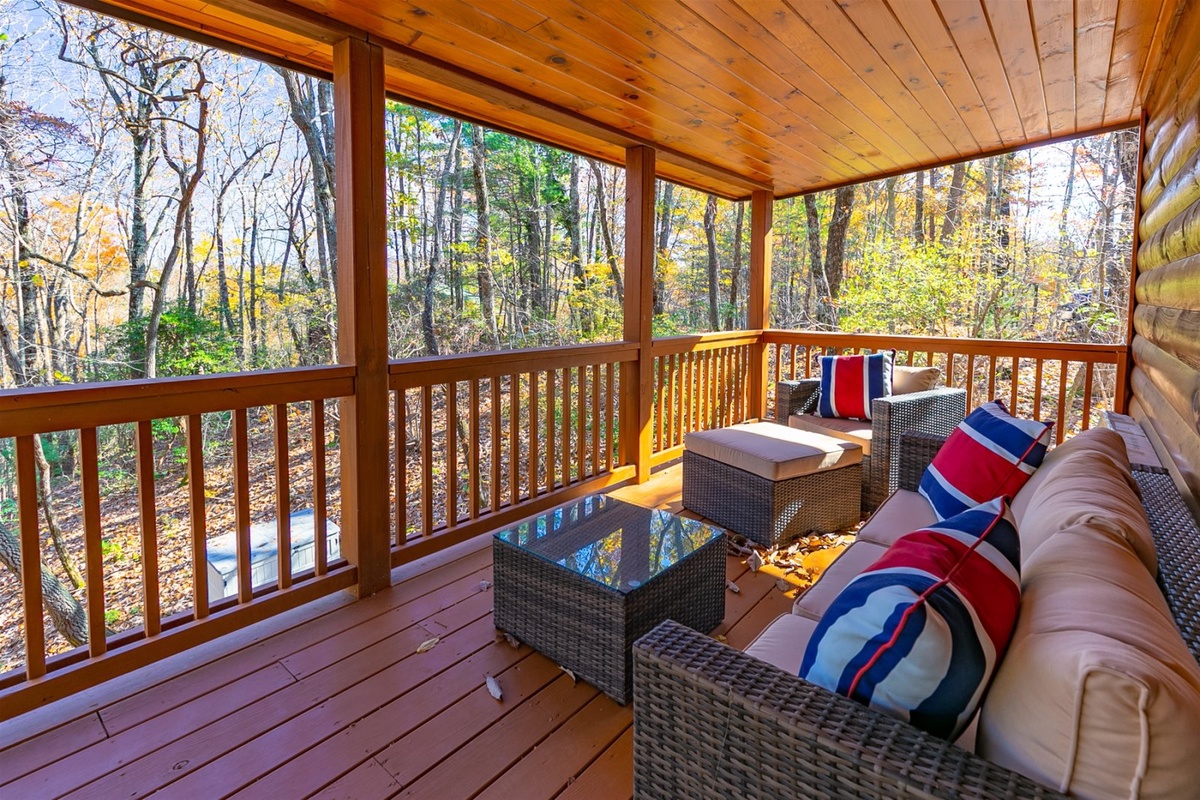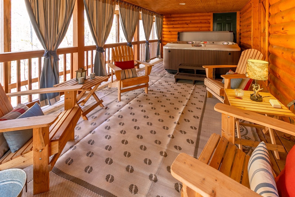Once entering into the gated stone entrance on the property and taking your first step inside the cabin, you will get an instant feeling of relaxation. As you tour around the inside of the main floor of the cabin, you will enjoy the open floor plan which includes the living room, kitchen, dining room, and the wood burning stone fireplace allowing for great conversation, watching tv, and enjoying one another's company. Sit back and relax on the comfortable outdoor couch filled with comfy pillows inside the covered screened in porch, while you enjoy and take in the peacefulness of nature and starry Georgia skies. You can also enjoy making dinner using the new gas grill while dining under the covered porch sitting at the teak dining set overlooking the forest. Off the back main porch is a fire pit with plenty of seating, which is great for those cool evenings to make s'mores, hot dogs and memories. One of the main attractions and more relaxing areas at Wine Down will be found on the lower level covered porch, where you will find a large hot tub, ample seating area for conversation, and full privacy for those needing to escape. Lastly, for those who are enjoying the upstairs master living suite, please indulge on the covered, outdoor private porch area which also includes an inviting and comfortable outdoor couch, too.