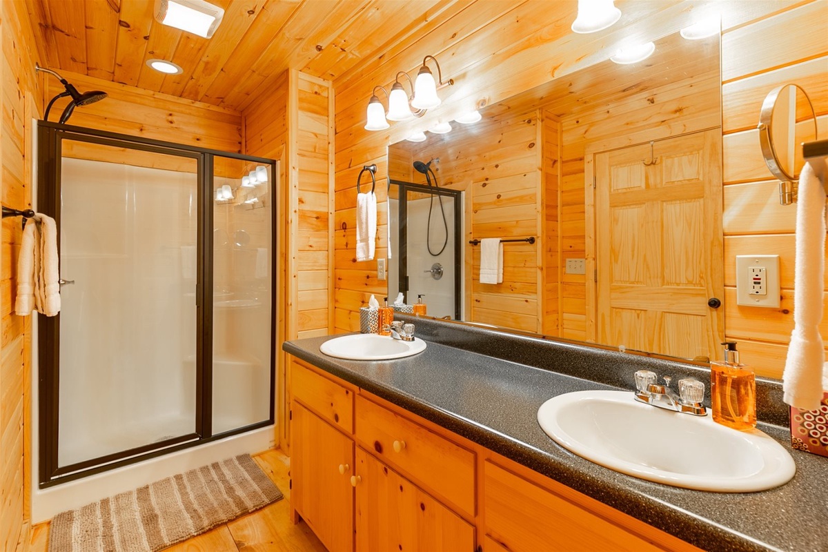 - Private bathroom with double vanity and shower